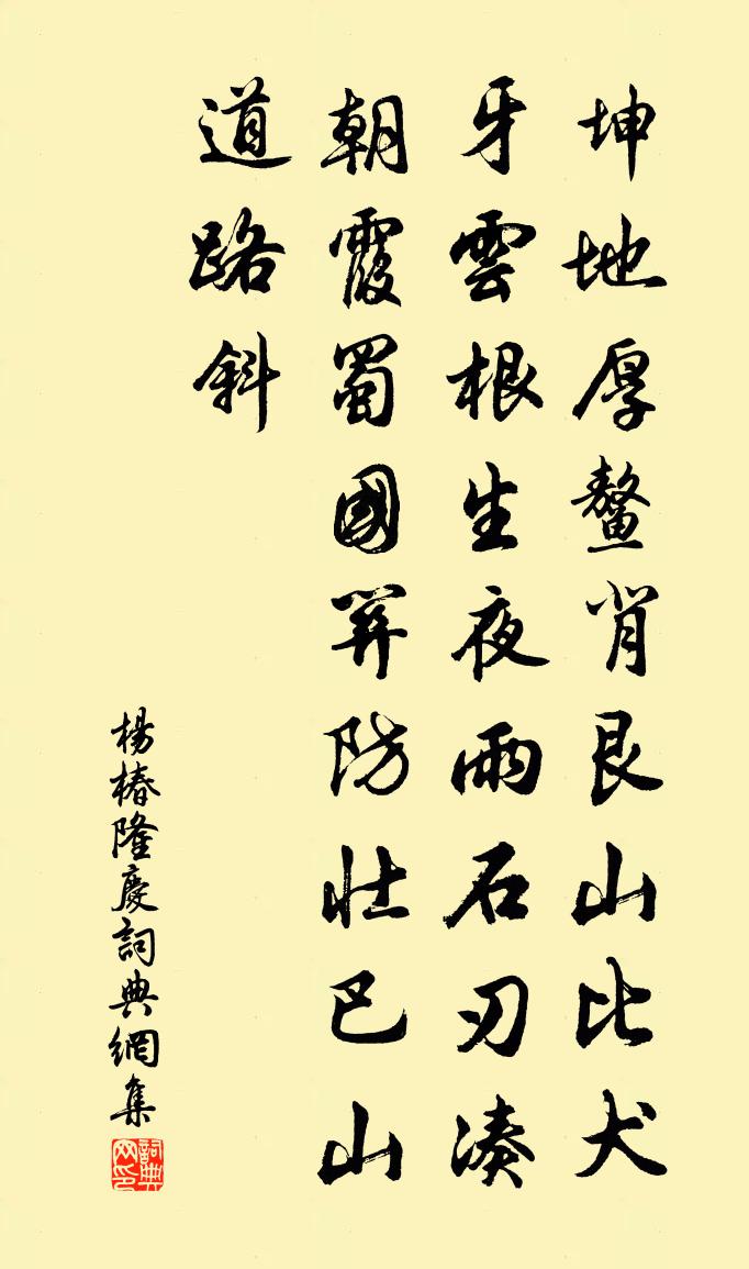 詩詞名句歷史字典書法欣賞書法字典國語詞典說文解字康熙字典古漢語字典標 題 作 者 詩 句 隆慶作者:楊椿 朝代:宋代隆慶原文坤地厚鰲背,艮山比犬牙。雲根生夜雨,石刃湊朝霞。蜀國關防壯,巴山道路斜。詩詞問答問:隆慶的作者是誰?答:楊椿問:隆慶寫於哪個朝代?答:宋代楊椿隆慶書法欣賞隆慶書法作品詩詞推薦秋日登石閣邵雍〔宋代〕初晴僧閣一憑欄,風物淒涼八月間。欲盡上層嘗腳力,更於高處看人寰。秋深天氣隨宜好,老後心懷只愛閒。為報送呂彥升參謀陸游〔宋代〕楚塞蕭條久宿師,參謀承詔上丹墀。苦言到口真當發,聖度如天莫自疑。萬里寄聲長不達,一尊相屬豈前期。遙憐鑒亭李新〔宋代〕石壁緣雲白,松風特地哀。斷鴻隨眼沒,秋浪擘山來。鼓急船頭轉,山明雨腳開。知公歸未得,此作望鄉台。不受暑亭馬之純〔宋代〕驅車曾向暑中來,望見塵襟已豁開。裊裊羊腸知幾折,亭亭鳳翅與俱回。渭川沮洳何如此,佛國清涼亦快哉。久坐春日雜興陸游〔宋代〕乍晴乍雨忽經旬,半醉半醒還過春。春臥不知庵外事,閒吟聊適夢中身。董逃歌佚名〔魏晉〕承樂世,董逃;游四郭,董逃。蒙天恩,董逃;帶金紫,董逃。行謝恩,董逃;整車騎,董逃。垂欲發,董逃;與和文與可洋州園亭三十詠其二十六野人廬蘇轍〔宋代〕野人三四家,桑麻足生意。試與叩柴荊,言辭應有味。和杜友游清源洞韻胡仲弓〔宋代〕涉險何如過虎牢,白雲堆里著身高。登臨我欲招元亮,談笑時能接李翱。人境地下看猶粟,洞天西去有蟠桃。學仙宴趙氏昆季書院因與會文並率爾投贈盧綸〔唐代〕詩禮挹餘波,相歡在琢磨。琴尊方會集,珠玉忽駢羅。謝族風流盛,於門福慶多。花攢騏驥櫪,錦絢鳳凰窠。詠雪新栽德安牡丹,透根生孫,枝皆千葉種也,即楊萬里〔宋代〕日上渾遲在,花乘絕早看。精神百倍好,風露七分寒。夜宴醒猶醉,晨妝濕未乾。子孫更千億,紫筍繞團欒。久寓泉南待一故人訊息桂隱諸葛如晦謂客舍不戴復古〔宋代〕寄跡小園中,新晴風日麗。好鳥竹間鳴,野鶴空中唳。悠然動詩興,行吟撫松桂。久客若忘歸,此身笑匏繫。五月和徐判院見惠詩篇姜特立〔宋代〕吊往文高古戰場,麗天星斗射寒芒。也知深奪曹劉氣,不用濃熏班馬香。和晏相公觸事成詠四首韓維〔宋代〕梧桐傾鳴鳳,鳴鳳邀高翔。微蟲縷眾葉,玲瓏秋日光。本性苟不易,憔悴庸何傷。重過瓜步山梅堯臣〔宋代〕魏武枕賦忘歸,枕孤軍處山枕頂。雖鄰枕江上浦,鑿岩山巔井。豈是欲勞兵,防患在萌穎。我昔常登臨,徘徊愛晴送僧牟融〔唐代〕梵王生別思,之子事遐征。煙水浮杯渡,雲山只履行。三生塵夢醒,一錫衲衣輕。此去家林近,飄飄物外情。和蘇適春雪八首張耒〔宋代〕偏憎游騎香蹄污,最稱佳人素手團。方丈老翁容膝外,出門四顧盡漫漫。雜曲歌辭。沐浴子李白〔唐代〕沐芳莫彈冠,浴蘭莫振衣。處世忌太潔,至人貴藏暉。滄浪有釣叟,吾與爾同歸。和李校書新題樂府十二首陰山道元稹〔唐代〕年年買馬陰山道,馬死陰山帛空耗。元和天子念女工,內出金銀代酬犒。臣有一言昧死進,死生甘分答恩燾。費財和白雲庵七首清風軒黃庶〔宋代〕老僧拂榻人不知,獨與清風事來去。朝昏宴坐向軒中,此身便是清風主。賢者之孝二百四十首四牡使臣林同〔宋代〕懷歸將父母,四牡苦騑騑。是我心中事,君從何處知。名句推薦夫惡有同方取不取同而已者乎?墨子《墨子·01章 親士》 曉風催我掛帆行,綠漲春蕪岸欲平。查慎行《曉過鴛湖》 夫以奢侈之君,御好淫僻之民,欲國無亂,不可得也。墨子《墨子·06章 辭過》 記年時、舊宿淒涼,暮煙秋雨野橋寒。吳文英《霜花腴·重陽前一日泛石湖》 教人無處寄相思,落花芳草過前期,沒人知。孫光憲《虞美人·好風微揭簾旌起》 忘身辭鳳闕,報國取龍庭。王維《送趙都督赴代州得青字》 日月忽其不淹兮,春與秋其代序。屈原《離騷》 浮雲柳絮無根蒂,天地闊遠隨飛揚。韓愈《聽穎師彈琴》 照野瀰瀰淺浪,橫空隱隱層霄。蘇軾《西江月·頃在黃州》 千里之馬時一有,其利緩;駑馬日售,其利急。韓非及後人《韓非子·說林下》