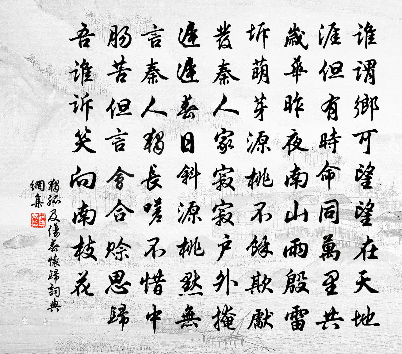 詩詞名句歷史字典書法欣賞書法字典國語詞典說文解字康熙字典古漢語字典標 題 作 者 詩 句 傷春懷歸作者:獨孤及 朝代:唐代傷春懷歸原文誰謂鄉可望,望在天地涯。但有時命同,萬里共歲華。昨夜南山雨,殷雷坼萌芽。源桃不余欺,先發秦人家。寂寂戶外掩,遲遲春日斜。源桃默無言,秦人獨長嗟。不惜中腸苦,但言會合賒。思歸吾誰訴,笑向南枝花。詩詞問答問:傷春懷歸的作者是誰?答:獨孤及問:傷春懷歸寫於哪個朝代?答:唐代問:傷春懷歸是什麼體裁?答:五古獨孤及傷春懷歸書法欣賞傷春懷歸書法作品注釋全唐詩:卷246_26詩詞推薦太尉王公以九錫命大將軍讓公將還京邑祖餞贈陸雲〔魏晉〕烈文辟公。時惟哲王。闡縱絕期。平顯幽光。內實慎徽。緝熙有臧。出糾方慝。間督不揚。高山峻極。天造芒芒。寄拄杖上王使君貫休〔唐代〕拄杖鄰僧與,殊常不可名。一條黳玉重,百兩紫金輕。有乳盤春力,無心合道情。惟宜高處著,將寄謝宣城。金陵雜興二百首蘇泂〔宋代〕青山渺渺水迢迢,王氣千年久未消。獨客重來睹風景,江頭猶有女 * 。和楊誠齋韻謝惠南海集詩三首袁說友〔宋代〕玉海書來喜欲狂,餐霞食瀣齒牙香。固應宗派名江右,底用宮袍入建章。今代歐黃真有種,向來沈鮑肯同行。只今頌古一百二十一首釋宗杲〔宋代〕丹山生鸑鷟,師子產狻猊。棒下摩醯眼,徒夸第一機。獨酌試藥玉滑盞,有懷諸君子。明日望夜,月蘇軾〔宋代〕熔鉛煮白石,作玉真自欺。琢削為酒杯,規摹定州瓷。荷心雖淺狹,鏡面良渺彌。持此壽佳客,到手不容辭。曹侯荊渚寄懷西蜀無染大師兄齊己〔唐代〕大溈心付白崖前,寶月分輝照蜀天。聖主降情延北內,諸侯稽首問南禪。清秋不動驪龍海,紅日無私罔象川。欲聽次韻陳叔易三首李處權〔宋代〕草碧波復綠,南浦愁送君。君行將何之,愴指南北雲。相思無早晚,生離無近遠。悠悠關塞阻,杳杳音信斷。青燈次韻馬少伊、郁舜舉寄示同游石湖詩卷七首范成大〔宋代〕得得來題小隱詩,拂香縈柳畫船移。湖邊好景春猶未,須到秋清月滿時。得闕越州冷掾胡仲弓〔宋代〕寒氈才入手,便動帝鄉心。千古蘭亭在,三年芹水深。文排昆體作,詩對越人吟。自得高山趣,何當遇賞音。禪人寫真求贊釋正覺〔宋代〕閒雲卷雨,野水懷秋。一心絕待,六處不收。是個面觜兮,還相識不。遠山齊己〔唐代〕天際雲根破,寒山列翠回。幽人當立久,白鳥背飛來。瀑濺何州地,僧尋幾嶠苔。終須拂巾履,獨去謝塵埃。歌者李蘇蘇祖無擇〔宋代〕歌妙累累若貫珠,歷城惟祗數蘇蘇。何當更唱陽春曲,為爾今宵倒玉壺。新成安樂宮陰鏗〔南北朝〕新宮實壯哉。雲里望樓台。迢遞翔鵾仰。連翩賀燕來。重櫩寒霧宿。丹井夏蓮開。砌石披新錦。梁花畫早梅。欲知江豚詩孔武仲〔宋代〕黑者江豚,白者白鬐。狀異名殊,同宅大水。淵有群魚,掠以肥已。是謂小害,顧有可喜。大川夷平,縞素不起。懶楊公遠〔宋代〕疎懶春來分外添,薄團兀坐地爐邊。關心事少夜慳夢,酌酒杯多晝亦眠。琴有徽弦姑掛壁,詩無眼目謾成篇。自憐紹興以後祀五方帝六十首佚名〔宋代〕[太簇為徽一奏]神在途矣,習習以風。百發後先,敢一不恭。奔走羌疫,祓除切凶。顧瞻下方,逍遙從容。題玉泉張伯玉〔宋代〕靈源曾記古篇章,飛入霜筠萬丈長。六月林風吹寶瑟,九秋山翠坼銀潢。試茶石鼎雲含液,釀酒兵廚菊有香。到此十一月二十三夜通夕不寐為賦梅詩且懷斯遠成趙蕃〔宋代〕我欲賦梅詩,佳處不自呈。老樹賞空曠,長條貴疏明。既如幽人幽,又似貞女貞。可聞不可見,可見不可名。六州歌頭(屬得疾,暴甚,醫者莫曉其狀。小愈,困臥無聊,戲作以自釋)辛棄疾〔宋代〕晨來問疾,有鶴止庭隅。吾語汝。只三事,太愁予。病難扶。手種青松樹。礙梅塢。妨花逕,才數尺。如人立。卻名句推薦來日綺窗前,寒梅著花未。王維《雜詩三首 / 雜詠三首》 西登香爐峰,南見瀑布水。李白《望廬山瀑布水二首》 桃花落。閒池閣。山盟雖在,錦書難托。陸游《釵頭鳳·紅酥手》 夏起大土功,命曰絕理。犯禁絕理,天誅必至。佚名《黃帝四經·經法·亡論》 惟仁者宜在高位。孟子《孟子·離婁章句上·第一節》 去年今日關山路,細雨梅花正斷魂。蘇軾《正月二十日往岐亭郡人潘古郭三人送余於女王城東禪莊院》 何人解賞西湖好,佳景無時。歐陽修《採桑子·何人解賞西湖好》 人不通今古,馬牛如襟裾。佚名《增廣賢文·上集》 名實相生,利用相成,是非相明,去就相安也。王通《中說·卷五·問易篇》 波漂菰米沉雲黑,露冷蓮房墜粉紅杜甫《秋興八首》