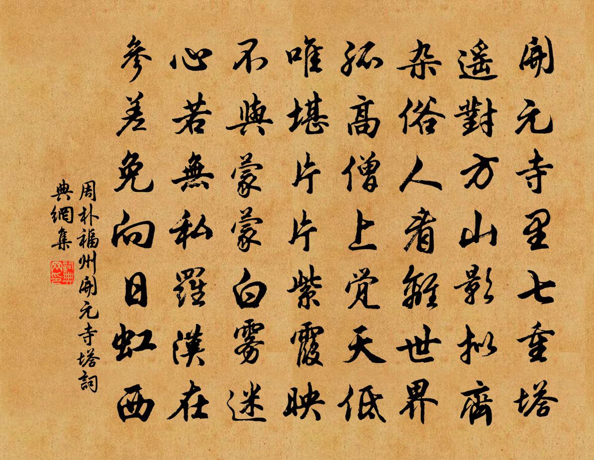 詩詞名句歷史字典書法欣賞書法字典國語詞典說文解字康熙字典古漢語字典標 題 作 者 詩 句 福州開元寺塔作者:周朴 朝代:唐代福州開元寺塔原文開元寺里七重塔,遙對方山影擬齊。雜俗人看離世界,孤高僧上覺天低。唯堪片片紫霞映,不與蒙蒙白霧迷。心若無私羅漢在,參差免向日虹西。詩詞問答問:福州開元寺塔的作者是誰?答:周朴問:福州開元寺塔寫於哪個朝代?答:唐代問:福州開元寺塔是什麼體裁?答:七律周朴福州開元寺塔書法欣賞福州開元寺塔書法作品注釋全唐詩:卷673_31詩詞推薦次韻張秘丞勸駕劉克莊〔宋代〕一紙黃書舉茂才,使君後挽復前推。似聞太史占奎宿,先敕天官起蟄雷。唐世科場先進士,漢家郊廟要掄魁。白頭憶李友叔皓三首陳淳〔宋代〕初見即我贈,東京博雅堂。再見復我和,北窗小梅章。此物今只存,而人乃雲亡。有時牽龍尾,濃磨發精光。恍惚賀新郎(用韻題趙晉臣敷文積翠岩、余欲令築陂於其前)辛棄疾〔宋代〕拄杖重來約。對東風、洞庭張樂,滿空簫勺。巨海拔犀頭角出,來向此山高閣。尚兩兩、三三前卻。老我傷懷登臨讀劉蕡策陳洎〔宋代〕藥石危言治亂箴,賈生晁錯是知音。可憐當日司文者,不畏人言合愧心。柏東司空圖〔唐代〕冥得機心豈在僧,柏東閒步愛騰騰。免教世路人相忌,逢著村醪亦不憎。西江月李之儀〔宋代〕念念欲歸未得,迢迢此去何求。都緣一點在心頭,忘了霜朝雪後。要見有時有夢,相思無處無愁。小窗若得再綢繆木蘭花慢(看春有感)呂勝己〔宋代〕平生花恨少,又那得、酒中愁。自禪板停參, * 悟罷,身世忘憂。南柯舊時太守,盡當年、富貴即時休。莫羨痴湖山雜賦陸游〔宋代〕一生到處賈胡留,身屬官倉不自由。白首歸來更何恨,十年爛醉石帆秋。漢南都監官廨射亭宋祁〔宋代〕的暈遙連射圃牆,碧簾煙瓦斗翬翔。庭中桂樹含春早,席外簾衣拂地長。鱠縷薦盤鯿項縮,酒杯行算蟹螯香。主翁自詠白居易〔唐代〕細故隨緣盡,衰形具體微。斗閒僧尚鬧,較瘦鶴猶肥。老遣寬裁襪,寒教厚絮衣。馬從銜草展,雞任啄籠飛。只要高宗郊祀前廟朝享太廟三十首真宗〔宋代〕天命有開,維仁是依。迺睠冀邦,於以顧之。其顧伊何,發祥筆基。施於孫子,虔奉孝思。過胡文定公碧泉書堂張栻〔宋代〕入門認溪碧,循流識深源。念我昔此來,及今七寒暄。人事幾更變,寒花故猶存。堂堂武夷翁,道義世所尊。永袖蘇幕遮 和師韻馬鈺〔元代〕清淨門,柔弱戶。忍辱家風,樸實為公據。無作無為成活路。自在逍遙,雲水通行步。絕聰明,效愚魯。兀兀騰騰繡薄眉佚名〔宋代〕化愚魯。拋離火院夫兒女。憑慧劍、斬斷三塗。人我山崩,是非海己枯。舊業消除,新殃不做。和益公見謝紅都勝芍藥之句楊萬里〔宋代〕江西春好不閞渠,只說平園絕世無。牡丹百種移洛苑,海棠千樹賽成都。坐令浮花並浪蕊,誰敢塗鈆更抹朱。不應題清心堂曹修古〔唐代〕天府鞠辦三節日,霜台待漏五更時。薰風一覺清涼睡,莫問浮名高與卑。勝因院陳著〔宋代〕轉路便幽深,曾來不用尋。寺依仙石腳,僧識老岩心。是處鬼無墓,此山松自林。滔滔未涯事,分付一蟬吟。寄韋珩柳宗元〔唐代〕初拜柳州出東郊,道旁相送皆賢豪。回眸炫晃別群玉,獨赴異域穿蓬蒿。炎煙六月咽口鼻,胸鳴肩舉不可逃。桂州發古塘王冕〔元代〕秋風籬落菊花黃,滿眼江山似故鄉。投老無家真可笑,長年為客尚能狂。青苔蝕盡床頭劍,白日消磨鏡里霜。聞道瑞鷓鴣(席上)郭世模〔宋代〕傾城一笑得人留。舞罷嬌娥斂黛愁。明月寶鞲金絡臂,翠瓊花珥碧搔頭。晴雲片雪腰支裊,晚吹微波眼色秋。清露名句推薦邊月隨弓影,胡霜拂劍花。李白《塞下曲六首》 淚眼不曾晴,眉黛愁還聚游次公《卜運算元·風雨送人來》 寒山吹笛喚春歸,遷客相看淚滿衣。李益《春夜聞笛》 三載重陽菊,開時不在家。文森《九日》 山中夜來月,到曉不曾看。元好問《倪莊中秋》 知其不可奈何而安之若命,德之至也。莊子《莊子·內篇·人間世》 眼見的吹翻了這家,吹傷了那家,只吹的水盡鵝飛罷!王磐《朝天子·詠喇叭》 智不逾奸,伐之莫勝;知不至大,奸者難拒。來俊臣《羅織經·察奸卷第八》 觀其交遊,則其賢不肖可察也管仲《管子·權修》 千虛不如一實。馮夢龍《警世通言·卷三》
