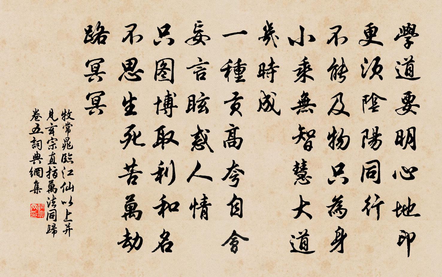 詩詞名句歷史字典書法欣賞書法字典國語詞典說文解字康熙字典古漢語字典標 題 作 者 詩 句 臨江仙 以上並見玄宗直指萬法同歸卷五作者:牧常晁 朝代:元代原文學道要明心地印,更須陰陽同行。不能及物只為身。小乘無智慧,大道幾時成。一種貢高夸自會,妄言眩惑人情。只圖博取利和名。不思生死苦,萬劫路冥冥。詩詞問答問:《臨江仙 以上並見玄宗直指萬法同歸卷五》的作者是誰?答:牧常晁問:該詩寫於哪個朝代?答:元代問:該詩是什麼體裁?答:詞書法欣賞臨江仙 以上並見玄宗直指萬法同歸卷五書法作品詩詞推薦驛中望山戲贈渭南陸贄主簿盧綸〔唐代〕官微多懼事多同,拙性偏無主驛功。山在門前登不得,鬢毛衰盡路塵中。新息道中遇雪余靖〔宋代〕寒深雪壓春,去去祗傷神。巢穴有歸鳥,路岐無住人。遠光天共白,夜色月相親。獨酌不成醉,自嫌名利身。凱歌十首呈賈樞使劉克莊〔宋代〕羽檄聯翩趣募兵,單槍一劍覓功名。健兒爭欲趨淮閫,宣相相看若父兄。出都來陳,所乘船上有題小詩八首,不知何人蘇軾〔宋代〕我詩雖雲拙,心平聲韻和。年來煩惱盡,古井無由波。竹齋題事李埴〔宋代〕低齋結空野,小竹移孤林。齋閒竹淨好,日媚幽人心。南方夏厭暑,獨此留殘陰。戛雨挫促夢,穿風搜涼襟。長茵秋園夕眺白玉蟾〔宋代〕木犀倜儻散麩金,松舉笙竽竹奏琴。臨水芙蓉自兒女,鏡邊刺繡晚沉吟。端明無惰趙公哀詩二首劉克莊〔宋代〕憶昔並居封駁地,相期葉力共推車。慣看東閣批黃敕,同向南衙沮白麻。高興竟歸安石墅,大疑猶訪魏舒家。僅存虛谷志歸後賦十首方回〔宋代〕買宅嚴灘上,幽棲十載余。共憐翁失馬,獨喜我知魚。賓客千鍾酒,兒郎萬卷書。須移歙州住,緣此是鄉居。宿撞抗劉家店鄭剛中〔宋代〕虺殨老馬踏深泥,投宿村坊燈火微。休問客依何似冷,床前猶有雪花飛。沁園春 嘲昆季析居凌雲翰〔元代〕樹上凌霄,堂前紫荊,秋來尚芳。柰牝雞晨語,**憔悴,妖狐晝嘯,鴻雁分張。仁智匪周,喜憂非舜,一旦天倫虞美人方翥〔宋代〕生犀百萬環帳立,漏聲未殘楚聲急。拔山男子心轉柔,夜倚芙蓉秋露泣。帳中別酒苦如荼,不是嬋娟割覇圖。鄛人和靖州判官陳子從山水圖十韻雪中訪友魏了翁〔宋代〕懷人得清晤,此樂浩無期。剡溪興盡返,未喻伐木詩。重陽登益昌錦屏山李曾伯〔宋代〕徙倚闌乾目送間,山容姨我亦蒼顏。恍思戲馬登吳會,擬逐飛鴻度漢關。草木與俱嗟歲月,古今無恙只江山。天公驀山溪譚處端〔元代〕*中碌碌,虛幻名和利。休恁苦勞心,鎮區區、傷神損氣。回頭是老,悟即便抽身,┾榮華,絕財色,樂道超浮世小重山(四之二)賀鑄〔宋代〕簾影新妝一破顏。玳筵回雪舞,小雲鬟。瓊枝擢秀望難攀。凝情處,千里望蓬山。歌斷酒闌珊。畫船簫鼓轉,綠楊和張文裕安寒十首司馬光〔宋代〕何處初寒好,襯寒福善居。長宵對燈火,滿屋聚詩書。暫息登山屐,休脂下澤車。所安容膝地,何必更多餘。挽吳宜徽鄭獬〔宋代〕平生負高節,至死寸心丹。明主雖容進,孤臣豈易安。神歸嵩岳黑,人哭洛川寒。不識平津面,臨風亦涕汍。【商調】字字錦佚名〔元代〕群芳綻錦鮮,香逐東風軟。鶯簧轉巧聲,題起傷春怨。睹名園,杏障桃屏,桃屏上映著柳眉翠鈿。天天,桃花窨約贈毛梅谷徐元傑〔宋代〕彈琴須會鍾子期,畫梅莫遜楊補之。墨妙坡仙助揮掃,雪晴霜夜月明時。浣溪沙 詠橘蘇軾〔宋代〕菊暗荷枯一夜霜。新苞綠葉照林光。竹籬茅捨出青黃。香霧噀人驚半破,清泉流齒怯初嘗。吳姬三日手猶香。名句推薦夜闌風靜欲歸時,惟有一江明月碧琉璃。蘇軾《虞美人·有美堂贈述古》 梅須遜雪三分白,雪卻輸梅一段香。盧鉞《雪梅·其一》 扶桑已在渺茫中,家在扶桑東更東。韋莊《送日本國僧敬龍歸》 春蠶到死絲方盡,蠟炬成灰淚始乾。李商隱《無題·相見時難別亦難》 料敵以遠,須謀於今;去賊以盡,其謀無忌。來俊臣《羅織經·謀劃卷第九》 君子必在己者,不必在人者也。呂不韋《呂氏春秋·覽·孝行覽》 風急天高猿嘯哀,渚清沙白鳥飛回。杜甫《登高》 白骨露於野,千里無雞鳴。曹操《蒿里行》 塞上長城空自許,鏡中衰鬢已先斑。陸游《書憤五首·其一》 泰山不要欺毫末,顏子無心羨老彭。白居易《放言五首·其五》