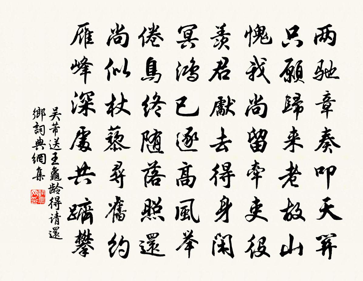 詩詞名句歷史字典書法欣賞書法字典國語詞典說文解字康熙字典古漢語字典標 題 作 者 詩 句 送王龜齡得請還鄉作者:吳芾 朝代:宋代送王龜齡得請還鄉原文兩馳章奏叩天關,只願歸來老故山。愧我尚留牽吏役,羨君先去得身閒。冥鴻已逐高風舉,倦鳥終隨落照還。尚似杖藜尋舊約,雁峰深處共躋攀。詩詞問答問:送王龜齡得請還鄉的作者是誰?答:吳芾問:送王龜齡得請還鄉寫於哪個朝代?答:宋代吳芾送王龜齡得請還鄉書法欣賞送王龜齡得請還鄉書法作品詩詞推薦夏日五鼓起戲書陸游〔宋代〕老雞喔喔桑樹顛,明星磊磊茅屋邊。我興視夜不復眠,坐看朝暾浴虞淵。開窗清風來穆然,拂幾洗研整蠹編。火雲華山慶雲見佚名〔唐代〕聖主祠名岳,高風發慶雲。金柯初繚繞,玉葉漸氛氳。氣色含珠日,光明吐翠雰。依稀來鶴態,仿佛列仙群。萬樹贈王弘遠曹攄〔魏晉〕採石他山。攻璞南荊。雖無和璧。冀收瑤瓊。日月愈久。曾無玉聲。傾心注耳。寂焉靡聽。桃李不報。徒勞我誠。春暮舒邦佐〔宋代〕日月一箭過,春光又別人。竹孫才解籜,梅子已生仁。閱世真旋磨,重詩老斲輪。壯懷因病落,孤負百年身。朝中措·蜀弦秦柱不關情納蘭性德〔清代〕蜀弦秦柱不關情,盡日掩雲屏。已惜輕翎退粉,更嫌弱絮為萍。東風多事,余寒吹散,烘暖微酲。看盡一簾紅雨,江有汜佚名〔先秦〕江有汜,之子歸,不我以。不我以,其後也悔。江有渚,之子歸,不我與。不我與,其後也處。江有沱,之子歸,成都運司西園亭詩月台許將〔宋代〕蜀地山四維,益州平如掌。累台郁臨風,坐看月宵上。稍出叢木末,始發眾籟爽。茲焉暫游目,一覽天地廣。敕勒歌塞北溫庭筠〔唐代〕敕勒金巾貴壁,陰山無歲華。帳外風飄雪,營前月照沙。羌兒吹玉管,胡姬踏錦花。卻笑江南客,梅落不歸家。月夜散策縣圃,有飛蝶,仍聞笛聲楊萬里〔宋代〕月明未許人早睡,笛聲鮮與秋爭清。夜深不應有飛蝶,渠儂似欲伴人行。題楊妃上馬嬌圖胡仲弓〔宋代〕並轡行春沉醉歸,侍兒扶上繡鞍來。君王微笑回眸看,肯信嵬坡掩面時。擬詠懷詩 二五庾信〔南北朝〕懷抱獨惛惛。平生何所論。由來千種意。並是桃花源。榖皮兩書帙。壼盧一酒樽。自知費天下。也復何足言。於陵仲子晁公溯〔宋代〕於陵有仲子,築室自躬耕。辟纑以為食,不肯從其兄。而況區中士,欲與並飛纓。高節固可嘉,由來無復情。秋山極天淨朱延齡〔唐代〕雨洗高秋淨,天臨大野閒。蔥蘢清萬象,繚繞出層山。日落千峰上,雲銷萬壑間。綠蘿霜後翠,紅葉雨來殷。散彩風入松(春遊)張炎〔宋代〕一春不是不尋春。終是不忄欠人。好懷漸向中年減,對歌鐘、渾沒心情。短帽怕粘飛絮,輕衫厭撲游塵。暖香十里寄題喻高士澹軒裘萬頃〔宋代〕世事邯鄲枕,生涯老子書。能知澹中味,雅稱竹間居。石徑排雲入,霜根帶月鋤。紛華不到眼,贏得玩清虛。紹興祀大火十二首佚名〔宋代〕神既貺施,嗜我飲食。申以累獻,以承靈億。神方常羊,鹹畢我觴。於再於三,於誠之將。句楊黎州〔宋代〕遠別苦驚雲聚散,相逢多悟月盈專。偈頌一百零二首釋慧遠〔宋代〕錦江巨浪連三峽,九隴峰高接五天。中有導師口生角,眉毛落盡腳跟穿。擊科嘉州石佛眼中火出,驚回陝府鐵牛鼻枯魚過河泣釋文珦〔宋代〕為魚當深潛,深潛身可肥。勿以風濤便,踴躍圖奮飛。風濤或遽止,處陸胡能歸。汝骸既已臘,泣河計還非。生榮秋枝如殘人王安石〔宋代〕秋枝如殘人,顏色先憔悴。微寒吹已空,性命一何脆。寧當記疇昔,葩葉相嫵媚。歲行誰使然,好殺豈天意。名句推薦秋風蕭瑟天氣涼,草木搖落露為霜,群燕辭歸鵠南翔。曹丕《燕歌行二首·其一》 三軍可奪帥也,匹夫不可奪志也。佚名《論語十二章》 能行之者未必能言,能言之者未必能行。司馬遷《史記·孫子吳起列傳》 塞上秋風鼓角,城頭落日旌旗。元好問《江月晃重山·初到嵩山時作》 秋到長門秋草黃。畫梁雙燕去,出宮牆。薛昭蘊《小重山·秋到長門秋草黃》 看雪飛、苹底蘆梢,未如鬢白。吳文英《瑞鶴仙·秋感》 大丈夫相時而動。曹雪芹《紅樓夢·第四回》 更落盡梨花,飛盡楊花,春也成憔悴。汪元量《鶯啼序·重過金陵》 自憐十五餘,顏色桃李紅。李白《長干行二首》 綠葉青跗映丹萼,與君裴回上金閣。王勃《落花落》