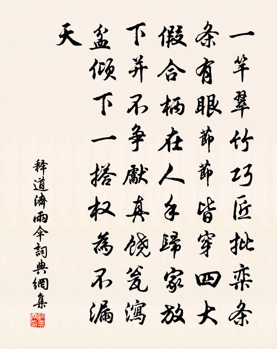 詩詞名句歷史字典書法欣賞書法字典國語詞典說文解字康熙字典古漢語字典標 題 作 者 詩 句 雨傘作者:釋道濟 朝代:宋代雨傘原文一竿翠竹,巧匠批欒。條條有眼,節節皆穿。四大假合,柄在人手。歸家放下,並不爭先。真饒瓮瀉盆傾下,一搭權為不漏天。詩詞問答問:雨傘的作者是誰?答:釋道濟問:雨傘寫於哪個朝代?答:宋代釋道濟雨傘書法欣賞雨傘書法作品詩詞推薦擬李義山柳枝詞五首陳師道〔宋代〕雨葉不自持,風花故入衣。飛花已無定,忍著惡風吹。高士詠顏歜吳筠〔唐代〕高哉彼顏歜,逸氣陵齊宣。道尊義不屈,士重王來前。榮祿安可誘,保和從自然。放情任所尚,長揖歸山泉。夜意李復〔宋代〕山霧連城白,虛庭待月生。雨余秋葉潤,露重葛衣輕。陰壁鳴蟲澀,風枝宿鳥驚。淹留禾黍興,悵望故園情。冬至稱賀皇太子平陽郡王楊萬里〔宋代〕長樂鍾聲攪夢驚,建章星影照人行。千官燈語聽殘點,一夜霜寒在五更。金鑰王秖開北闕,銀鞍系控謁東明。青宮題太平興國宮李受〔宋代〕香爐峰下宅天官,三界方知可往還。白石眼前分世路,紫雲頭上接天班。滄溟豈隔毫芒內,憶劫皆歸瞬息間。但得孫推內子輓詩洪咨夔〔宋代〕玉立金閨客,家人亦許清。共聽秋塞柝,細剔夜窗檠。娣袂從渠好,兒襦得我平。西風吹落葉,不盡夕陽明。秋日獨游曲江楊憑〔唐代〕信馬閒過憶所親,秋山行盡路無塵。主人莫惜松陰醉,還有千錢沽酒人。游三覺山齊己〔唐代〕白石路重重,縈紆勢忽窮。孤峰擎像閣,萬木蔽星空。世論隨時變,禪懷歷劫同。良宵正冥目,海日上窗紅。睡起陸游〔宋代〕風約飛花滿曲廊,蕭然無客共焚香。瓮醅力重初投枕,鼻鼾聲豪已撼床。栩栩夢遊心自適,昏昏起坐日方長。靜憑還翁雪舟吟卷胡仲弓〔宋代〕世間迂闊者,端的是詩人。獨坐無生計,相逢盡說貧。如君追古作,與我最情親。世莫輕辜負,元龍湖海身。真樂釋文珦〔宋代〕人皆在所樂,此樂獨吾真。一靜滅萬慮,空房無點塵。雪清梅骨骼,煙養竹精神。羈{左糹右曳}徒千丈,難拘散次韻郭宰兼簡丞尉三首鄧肅〔宋代〕獨領詩壇臥北窗,故應落筆士夫降。笑談自掃剡藤萬,聲價曾高魏闕雙。六合便當歸化筆,一同聊復賞澄江。初無鷓鴣天韓玉〔宋代〕愛日烘晴旬日間。謾邀朋輩為躋攀。無窮望眼無窮恨,不盡長江不盡山。星點點,月團團。倒流河漢入杯盤。飽吟雜曲歌辭。長命女佚名〔唐代〕雲送關西雨,風傳渭北秋。孤燈然客夢,寒杵搗鄉愁。宿靈山蘭若許棠〔唐代〕江心天半寺,一夕萬緣空。地出浮雲上,星搖積浪中。滴漚垂閣雨,吹檜送帆風。旦夕聞清磬,唯應是釣翁。秋旱繼以大風即事十首劉克莊〔宋代〕舜功遠矣世猶思,誰谷吾州賴兩陂。待與閟宮碑歲月,並為神作送迎詩。送關壽卿校書出守簡州范成大〔宋代〕東壁星宮館列仙,一麾苦欲近田園。宅家但寶千金鑒,臣輩何辭萬里船?京洛知心塵鞅里,江吳攜手暮帆邊。聲名雁門關外元好問〔金代〕四海於今正一家,生民何處不桑麻。重關獨居千尋嶺,深夏猶飛六出花。雲暗白楊連馬邑,天圍青冢渺龍沙。憑高久旱得雨陳普〔宋代〕同堂合席分汝爾,況乃貌然千萬里。寸總不知從何來,一夜擁衾 * 起。井田未復思扣閽,忍見秋夏田無水。甘霖南鄉子 原誤作行香子 見金蓮正宗仙源像傳譚處端〔元代〕交泰一聲雷。迸出靈光萬道輝。尤遇迅雷重脫殼,幽微。射出金光透頂飛。一性赴瑤池,得與丹陽相從隨。顯現長名句推薦蒼旻霽涼雨,石路無飛塵。岑參《暮秋山行》 林深藏卻雲門寺,回首若耶溪。張可久《人月圓·會稽懷古》 移舟去。未成新句。一硯梨花雨。周晉《點絳唇·訪牟存叟南漪釣隱》 隨你官清似水,難逃吏滑如油。馮夢龍《警世通言·卷十五》 長安白日照春空,綠楊結煙垂裊風。李白《陽春歌》 採蓮南塘秋,蓮花過人頭。佚名《西洲曲》 蘭有秀兮菊有芳,懷佳人兮不能忘。劉徹《秋風辭》 賞賜不能喜,誅罰不能威。墨子《墨子·05章 七患》 言可省時休便說,步宜留處莫胡行。馮夢龍《醒世恆言·卷十四》 酒盈杯,書滿架,名利不將心掛。李珣《漁歌子·荻花秋》