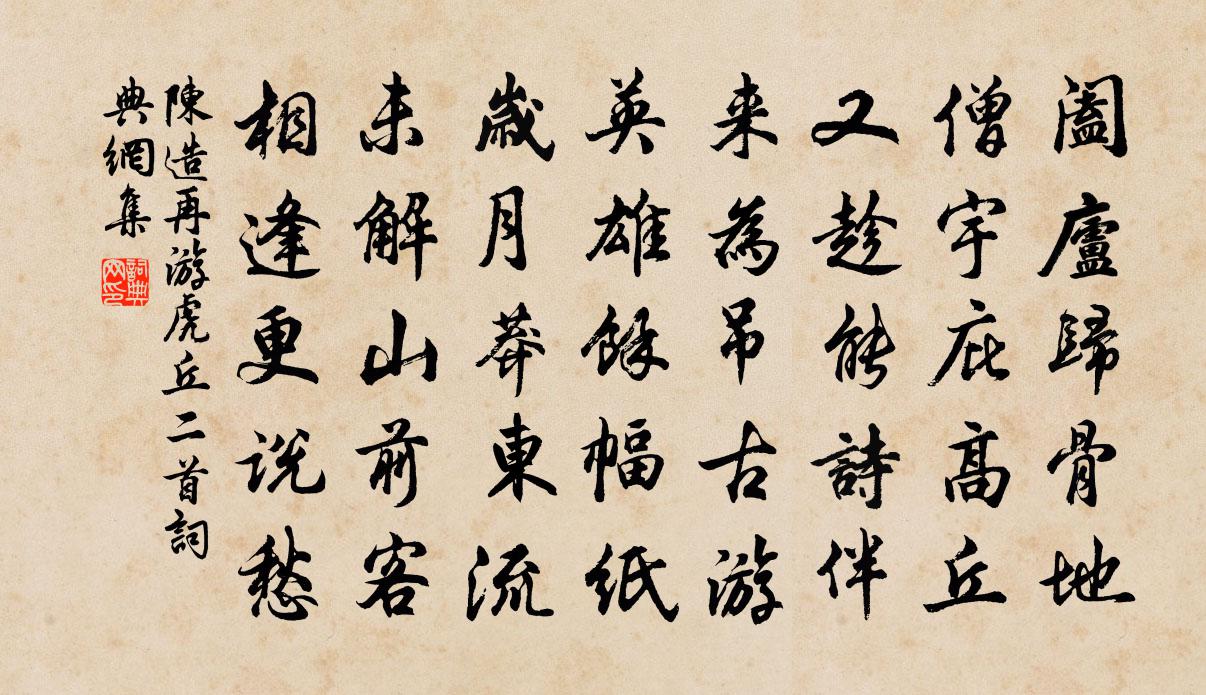 詩詞名句歷史字典書法欣賞書法字典國語詞典說文解字康熙字典古漢語字典標 題 作 者 詩 句 再游虎丘二首作者:陳造 朝代:宋代再游虎丘二首原文闔廬歸骨地,僧宇庇高丘。又趁能詩伴,來為弔古游。英雄餘幅紙,歲月莽東流。未解山前客,相逢更說愁。詩詞問答問:再游虎丘二首的作者是誰?答:陳造問:再游虎丘二首寫於哪個朝代?答:宋代陳造再游虎丘二首書法欣賞再游虎丘二首書法作品詩詞推薦句杜耒〔宋代〕生就石橋羅漢面,吟成雪屋閬仙詩。和沖卿喜雨偶成司馬光〔宋代〕萬里風隨快雨來,塵昏消伏旱光開。物情濯熱參差喜,天意為仁容易回。簾映薄寒燈有暈,窗含虛白麝成煤。君侯子陵瀨姜特立〔宋代〕不為故人出,出則將如何。交道古難終,豈唯畏虞羅。蕭何豐沛舊,未免投金科。先生誠高哉,無愧紫芝歌。寄題宇文中允所居司馬光〔宋代〕孤宦行直道,棲棲良可悲。誰能拂衣去,不待掛冠期。經史乃吾友,雲山為己知。世間青紫貴,盡付兩佳兒。遠意聯句皎然〔唐代〕家在炎州往朔方, ——疾(失姓)豈知于闐望瀟湘。 ——澄(失姓)曾經隴底復遼陽, ——巨川(失姓)更八聲甘州(春雪奇麗,未能賦也,因古岩韻誌喜)劉辰翁〔宋代〕甚花間、兒女笑盈盈。人添雪獅成。任踏青無路,凌波有地,步步光塵。招得梅妃魂也,好似去年春。柳亦何曾絮和武公望雪梅五首廖行之〔宋代〕自是陽和生處有,不同凡卉競時開。居然茹雪猶全節,底為藏冰但卻災。送王大昌齡赴江寧岑參〔唐代〕對酒寂不語,悵然悲送君。明時未得用,白首徒攻文。澤國從一官,滄波幾千里。群公滿天闕,獨去過淮水。舊家秋雨陸游〔宋代〕山深枕草木久已枕荒,晝昏風雨殊未止。看枕不覺向壁臥,煎枕欲罷推枕起。清心正付竹罏香,漱齒每挹岩泉水。采玉行韋應物〔唐代〕官府征白丁,言采藍谿玉。絕嶺夜無家,深榛雨中宿。獨婦餉糧還,哀哀舍南哭。黑漆弩 游金山寺粼曲子 伯昌嘗以漆弩侑酒王惲〔元代〕名似未雅。若就以江南煙雨目之,何如。予曰,昔東坡作念奴曲,後人愛之,易其名曰酹江月,其誰曰不然。仲先書事二首劉克莊〔宋代〕黃旗旁午責軍需,括匠搜船遍里閭。士稚去時無鎧仗,武候屯處有儲胥。粟空都內憂難繼,甲出民間策恐疏。昔補終南山張喬〔唐代〕帶雪復銜春,橫天占半秦。勢奇看不定,景變寫難真。洞遠皆通岳,川多更有神。白雲幽絕處,自古屬樵人。贈王弘遠曹攄〔魏晉〕道貴無名。德尚寡慾。俗牧其華。我執其朴。人取其榮。余守其辱。窮巷湫隘。環堵淺局。肩牆弗暨。茅室不劉。題晝公院(一作四明蘭若贈寂禪師)周賀〔唐代〕叢木開風徑,過從白晝寒。舍深原草合,茶疾竹薪乾。夕雨生眠興,禪心少話端。頻來覺無事,盡日坐相看。平甫如通州寄之王安石〔宋代〕北山搖落水崢嶸,想見揚帆出廣陵。平世自無憂國事,求田應不忤陳登。後天易吟三十首方回〔宋代〕萬物天為大,中間地次之。成功付諸子,父母似無為。題王氏天開圖畫卷後劉宰〔宋代〕濃淡非妝點,縱橫謝剪裁。憑欄一凝睇,圖畫信天開。次韻答劉正將項安世〔宋代〕落魂劉郎住藕池,湖南湖北竹枝詞。風流故有諸孫句,絕妙都如幼婦碑。玉斗歌成微醉後,銀河曲就淺寒時。文章不飲酒曾鞏〔宋代〕不飲酒,不善諧,少年醒眼看花開。況從多病久衰耗,自顧白髮垂氈毸。縱遇花時少情思,經春不曾銜酒杯。布穀名句推薦何以解憂?唯有杜康。曹操《短歌行》 今日獨來香徑里,更無人跡有苔錢。韓偓《寒食日重遊李氏園亭有懷》 向露冷風清,無人處,耿耿寒漏咽。周邦彥《浪淘沙慢·曉陰重》 遠路應悲春晼晚,殘霄猶得夢依稀。李商隱《春雨》 又酒趁哀弦,燈照離席。梨花榆火催寒食。周邦彥《蘭陵王·柳》 露下旗濛濛,寒金鳴夜刻。李賀《塞下曲》 春色邊城動,客思故鄉來。何遜《邊城思》 漫江碧透,百舸爭流。 * 《沁園春·長沙》 瀉水置平地,各自東西南北流。鮑照《擬行路難十八首》 思歸未可得,書此謝情人。李白《送郄昂謫巴中》