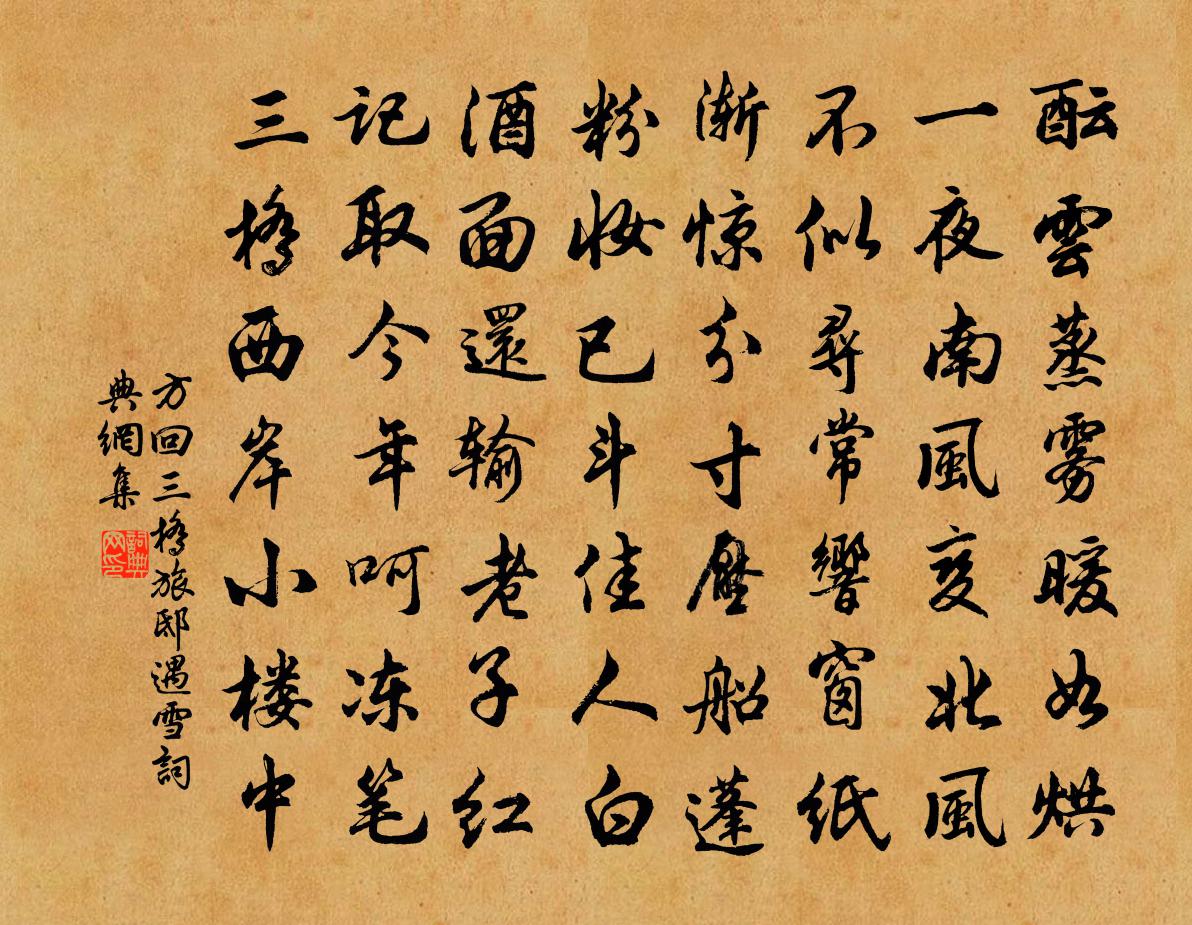 詩詞名句歷史字典書法欣賞書法字典國語詞典說文解字康熙字典古漢語字典標 題 作 者 詩 句 三橋旅邸遇雪作者:方回 朝代:宋代三橋旅邸遇雪原文醞雲蒸霧暖如烘,一夜南風變北風。不似尋常響窗紙,漸驚分寸壓船蓬。粉妝已斗佳人白,酒面還輸老子紅。記取今年呵凍筆,三橋西岸小樓中。詩詞問答問:三橋旅邸遇雪的作者是誰?答:方回問:三橋旅邸遇雪寫於哪個朝代?答:宋代方回三橋旅邸遇雪書法欣賞三橋旅邸遇雪書法作品詩詞推薦看常州柘枝,贈賈使君白居易〔唐代〕莫惜新衣舞柘枝,也從塵污汗沾垂。料君即卻歸朝去,不見銀泥衫故時。病後夏初雜書近況十首方回〔宋代〕六年三潦困余黎,誰識他年舊浙西。靡有孑遺何可忽,不知歸去果安之。屬方理屋又聞漏,垂欲出門仍畏泥。家在清平樂晏幾道〔宋代〕春雲綠處,又風歸鴻去。側帽風前花滿路,冶葉倡條情緒。紅樓桂酒新開,曾攜翠袖同來。醉弄影娥池水,短簫吹秋晚湖上陸游〔宋代〕已過西成賽廟期,家家下麥不容遲。夕陽遍野人歸後,秋水生灘鷺集時。靈藥不治懷抱惡,好詩空益鬢毛衰。從來豆葉坪陳大章〔〕朝望漢陽雲,暮植香山杖。長風如奔湍,千林共一響。前登見石坪,有庵大如掌。孤松翼嶺深,殘霞延月上。黃精鸚鵡白居易〔唐代〕隴西鸚鵡到江東,養得經年嘴漸紅。常恐思歸先剪翅,每因餵食暫開籠。人憐巧語情雖重,鳥憶高飛意不同。應似和子瞻和陶淵明雜詩十一首蘇轍〔宋代〕嘗聞左師言,少子古所喜。二兒從兩父,服辱了百事。佳子何關人,自怪余此意。看書時獨笑,屢與古人值。他年挽章孺人劉克莊〔宋代〕□種崗頭新宰樹,追嚴案上舊楞伽。埋詞更不煩諛墓,反哺何曾似自家。此女安知非妙善,夫人亦恐是摩耶。遙知歸自德清陳必復〔宋代〕午陰雲弄日,水漲浪侵磯。小港漁舟聚,深村酒戶稀。牛閒童自睡,蠶熟客方歸。隔岸人家近,繅聲出翠微。一老陸游〔宋代〕太平一老醉騰騰,南陌東阡喜不勝。民力農桑家自足,士崇名節道方興。騎鯨仙去時猶遠,射虎歸來氣頗增。莫道和博古直五首蒲壽宬〔宋代〕曠茲歷億劫,矧此浮雲身。桑樞弗言病,駟馬休笑貧。棲棲魯中叟,救世誠艱辛。鳥獸豈同群,由也徒問津。人世春晚雜興十二首方回〔宋代〕芳草茸茸沒屨深,清和天氣潤園林。霏微小雨初晴處,暗數青梅立樹陰。謁金門 春半朱淑真〔宋代〕春已半,觸目此情無限。十二欄乾倚遍,愁來天不管。好是風和日暖,輸與鶯鶯燕燕。滿院落花簾不捲,斷腸芳草送寺丞韓君守新安方岳〔宋代〕君家集有陸參序,老筆誇張歙大州。三百年來非昔比,二千石喜得今侯。早田已槁曾關念,舊石雖奇不到收。沃沃長思仙 本名長相思 贈平山劉志常、神山劉王丹桂〔元代〕平山劉。神山劉。更易俗流作道流。人情誓莫留。悟驊騮。悟驊騮。燦燦神珠得自由。光明常逗遛。覽古四十二首 其八楊維楨〔元代〕恭儉漢天子,取士忌少年。未應絳灌徒,廷中肯訪賢。徒為宣室召,復有長沙遷。不見馮都尉,龐眉竟誰憐。為薛台悼亡白居易〔唐代〕半死梧桐老病身,重泉一念一傷神。手攜稚子夜歸院,月冷空房不見人。客意五首陳舜俞〔宋代〕客意久不適,攬衣臨暮舂。煙長藏野闊,雲斷漏天空。酒置千愁里,詩成一望中。黃花無限好,底事憶江東。水調歌頭(癸酉虎丘中秋)張元乾〔宋代〕萬里冰輪滿,千丈玉盤浮。廣寒宮殿,西望湖海冷光流。掃盡長空纖翳,散亂疏林清影,風露迫人愁。徐步行歌去絕句九首張耒〔宋代〕天高列岫出林外,霜落大江流地中。晚日橋邊數歸牧,牛羊部分聽兒童。名句推薦身多疾病思田裡,邑有流亡愧俸錢。韋應物《寄李儋元錫》 寒氣先侵玉女扉,清光旋透省郎闈。李商隱《對雪二首》 一去無訊息,那能惜馬蹄。薛道衡《昔昔鹽》 戲馬台南山簇簇,山邊飲酒歌別曲。張籍《送遠曲》 行出於己,名生於人。佚名《逸周書·卷六·諡法解》 去年離別雁初歸,今夜裁縫螢已飛。張紘《閨怨 / 怨詩》 寧為雞口,無為牛後。劉向《戰國策·韓一·蘇秦為楚合從說韓王》 書當快意讀易盡,客有可人期不來。陳師道《絕句·書當快意讀易盡》 獨睡起來情悄悄,寄愁何處好。納蘭性德《謁金門·風絲裊》 故人何在,水村山郭。孫道絢《憶秦娥·季溫老友歸樵陽人來閒書因以為寄》