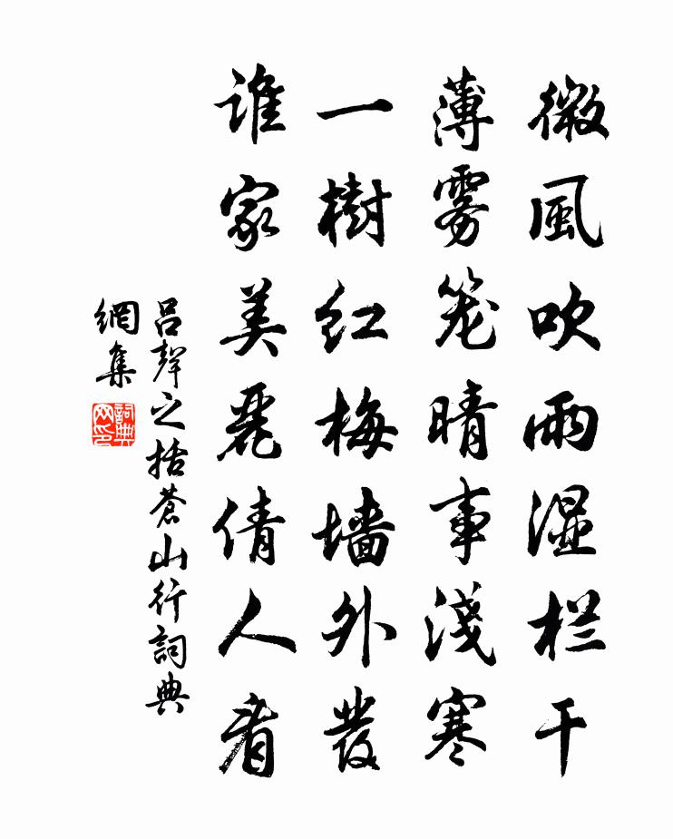 詩詞名句歷史字典書法欣賞書法字典國語詞典說文解字康熙字典古漢語字典標 題 作 者 詩 句 括蒼山行作者:呂聲之 朝代:宋代括蒼山行原文微風吹雨濕欄乾,薄霧籠晴事淺寒。一樹紅梅牆外發,誰家美麗倩人看。詩詞問答問:括蒼山行的作者是誰?答:呂聲之問:括蒼山行寫於哪個朝代?答:宋代呂聲之括蒼山行書法欣賞括蒼山行書法作品詩詞推薦酬杜麟台春思崔湜〔唐代〕春還上林苑,花滿洛陽城。鴛衾夜凝思,龍鏡曉含情。憶夢殘燈落,離魂暗馬驚。可憐朝與暮,樓上獨盈盈。韓持國遺洛筍梅堯臣〔宋代〕龍孫春吐一尺牙,紫錦包玉離泥沙。金刀璀錯截嫩節,銅馳不與大梁賒。持寄韓郎綠蒲束,莫令衛女苦思家。韓郎馬塍道上陳允平〔宋代〕閒拖瘦竹筇,獨步馬塍東。鳥影青山外,春愁碧樹中。麥潮風化蝶,櫻熟雨生蟲。莫過溪頭去,溪頭多落紅。游靈岩寺張嵲〔宋代〕吳王避暑地,西施採香路。陵谷隅未移,山川尚如故。遺宮俱泯滅,輪奐乃僧戶。梵放想遺轉,考槃疑簨簴。繁華倒犯方千里〔宋代〕盡日、任梧桐自飛,翠階慵掃。閒雲散縞。秋容瑩、暮天清窈。斜陽到地,樓閣參差簾櫳悄。嫩袖舞涼颸,拂拂生偈頌一百二十三首釋崇岳〔宋代〕梵志翻著襪,摩耶生悉達。聲跡不相干,今朝四月八。訪楊雲卿淮上別墅釋惠崇〔宋代〕地近得頻到,相攜向野亭。河分岡勢斷,春入燒痕青。望久人收釣,吟餘鶴振翎。不愁歸路晚,明月上前汀。贈施都正三首陳造〔宋代〕雨窗舞晦明,風竹作騷屑。斷無思歸夢,人境兩清絕。道人氣金玉,妙論挾冰雪。未須金鼎丹,始可黑霜發。山居即事釋紹嵩〔宋代〕拂石玩林壑,凜然天欲秋。竹風連野色,舍影漾江流。碧嶂雲初合,遙峰雨半收。山居自清絕,不夢世間游。采芡文同〔宋代〕芡盤團團開碧輪,城東壕中如疊鱗。漢南父老舊不識,日日岸上多少人。駢頭鬅忪露秋熟,綠刺紅鍼割寒玉。提籠宣召赴龍圖閣觀太宗御書應製楊億〔宋代〕非煙蔥蔚蒼龍闕,紫府深沈大帝居。群玉中天開策府,神龜溫洛薦圖書。珠宮岑寂經行處,金簡熒煌拭目初。曾是減字木蘭花陳瓘〔宋代〕世間藥院。只愛大黃甘草賤。急急加工。更靠硫黃與鹿茸。鹿茸吃了。卻恨世間涼藥少。冷熱平均。須是松根白茯歸州留別傅君寇準〔宋代〕楊柳如絲拂畫橋,此中留語欲魂銷。還愁別後巴東館,獨聽空江半夜潮。久寓泉南待一故人訊息桂隱諸葛如晦謂客舍不戴復古〔宋代〕寄跡小園中,倒指五十日。既得故人書,南遊吾事畢。再拜謝主翁,奉還此一室。雲萍聚復散,欲住住不得。折柳哭重伋兼穰令鄭獬〔宋代〕古劍沈來不可尋,白沙堆下葬黃金。憑君莫向大江哭,淚人黃泉冤更深。送胡婿晉遠赴嘉興酒官孫應時〔宋代〕名世非科目,傳家豈縉紳。紛紛一炊夢,鼎鼎百年身。看取無窮事,何如不配人。侯翁雖齟齬,此話入情親。次韻蘇教授飯鄭教授五首項安世〔宋代〕嘆息吾家老鄭君,三年孤鶴困雞群。天教此地蘇司業,與對當時鄭廣文。次韻子瞻臨皋新葺南堂五絕蘇轍〔宋代〕旅食三年已是家,堂成非陋亦非華。何方道士知人意,授與爐中一粒砂。贈杜二拾遺高適〔唐代〕傳道招提客,詩書自討論。佛香時入院,僧飯屢過門。聽法還應難,尋經剩欲翻。草玄今已畢,此外復何言。舍弟客臨平林亦之〔宋代〕憑誰為問鶺鴒原,燈火三更殞淚痕。天遠未知萍梗跡,書來說在藕花村。年華似汝寧為未,場屋如吾已懶言。壁水名句推薦情知已被山遮斷,頻倚闌乾不自由。辛棄疾《鷓鴣天·晚日寒鴉一片愁》 一日不作,百日不食。司馬遷《史記·三十世家·趙世家》 猿鳥猶疑畏簡書,風雲常為護儲胥。李商隱《籌筆驛》 厭見千門萬戶,經過北里南鄰。王維《田園樂七首·其一》 然而其持之有故,其言之成理。荀子《荀子·非十二子》 不足於行者,說過;不足於信者,誠言。荀子《荀子·大略》 春酒香熟鱸魚美,誰同醉?纜卻扁舟篷底睡。李珣《南鄉子·雲帶雨》 無善而致人譽,不如無惡而致人毀。洪應明《菜根譚·概論》 纖雲弄巧,飛星傳恨,銀漢迢迢暗度。秦觀《鵲橋仙·纖雲弄巧》 君子之學也,入乎耳,著乎心荀子《荀子·勸學》