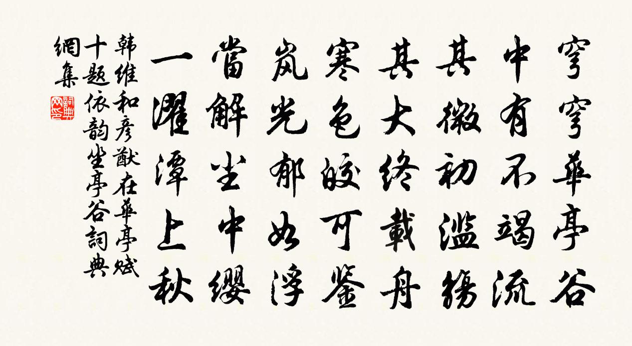 詩詞名句歷史字典書法欣賞書法字典國語詞典說文解字康熙字典古漢語字典標 題 作 者 詩 句 和彥猷在華亭賦十題依韻坐亭谷作者:韓維 朝代:宋代原文穹穹華亭谷,中有不竭流。其微初濫觴,其大終載舟。寒色皎可鑑,嵐光郁如浮。當解塵中纓,一濯潭上秋。詩詞問答問:《和彥猷在華亭賦十題依韻坐亭谷》的作者是誰?答:韓維問:該詩寫於哪個朝代?答:宋代書法欣賞和彥猷在華亭賦十題依韻坐亭谷書法作品詩詞推薦夜起來(一作起夜來)施肩吾〔唐代〕香銷連理帶,塵覆合歡杯。懶臥相思枕,愁吟起夜來。次韻叔祖閣學秋興張鎡〔宋代〕歲序推流感世浮,樂閒宜早向農疇。修梧綠減俄過夏,短髮絲添剝得秋。千古是非歸嘯傲,一門酬唱勝交遊。祗因久擬重陽一登龍山以荒榛峭壁無容足之地欲訪吳芾〔宋代〕下車日日欲登台,直到重陽始一來。好對江山拼酩酊,此懷能得幾時開。送晁美叔發運右司年兄赴闕蘇軾〔宋代〕我年二十無朋儔,當時四海一子由。君來扣門如有求,頎然病鶴清而修。醉翁遣我從子游,翁如退之蹈軻丘。尚欲禪人並化主寫真求贊釋正覺〔宋代〕萎萎羸羸,病起風姿。跛跛挈挈,老來事業。坐穩三際平,心空百念絕。森羅萬象信崝嶸,門門三昧從施設。次仲氏韻孫應時〔宋代〕故人驚我鬢絲多,一嘆相逢可若何。勳業向來無此夢,菱花何秘遺重磨。浙右贈陸處士曹松〔唐代〕靜節灌園餘,得非成隱居。長當庚子日,獨拜五經書。白浪吹亡國,秋霜洗大虛。門前是京口,身外不營儲。石壁泉熊禾〔宋代〕一滴流漿石骨穿,於今一掬掃炎氛。鶴仙業已成陳跡,瀑布聲中隱劍痕。夜上西城聽梁州曲二首李益〔唐代〕行人夜上西城宿,聽唱梁州雙管逐。此時秋月滿關山,何處關山無此曲。鴻雁新從北地來,聞聲一半卻飛回。金河村婦謠李若水〔宋代〕村婦相將入城去,呵之不止問其故。我聞官中新糶米,比似民間較錢數。常平常平法甚良,先帝惠澤隆陶唐。願爾紹興十年發皇太后冊寶八首佚名〔宋代〕肅肅東朝,帝隆孝治。猗歟丕稱,寶冊斯備。皇扉國闢,導迎慶瑞。德萬太任,有周卜世。次韻沈茂實小園偶書方回〔宋代〕秋風稉稻又嘗新,續食年年肯濟貧。遠學佺期響□□,近同東老致仙人。貴公勳業一杯水,俗子面顏三斛塵。流火行香子(同前)晁補之〔宋代〕前歲栽桃,今歲成蹊。更黃鸝、久住相知。微行清露,細履斜暉。對林中侶,閒中我,醉中誰。何妨到老,常閒常曉景亭司馬光〔宋代〕簾櫳分曉色,遠樹子規啼。濃露侵衣冷,晴煙壓水低。神遊靈境健,身人畫圖迷。衙吏無煩報,汀洲鷺正棲。中秋月五首汪莘〔宋代〕吟詩競盡月精微,自昔誰明造化機。近作金波千道去,遠成玉鑒一團飛。陽魂滿處因乾父,陰魄虧時自巽妃。笠澤奉和魯望漁具十五詠皮日休〔唐代〕伐彼槎櫱枝,放於冰雪浦。游魚趁暖處,忽爾來相聚。徒為棲托心,不問庇庥主。一旦懸鼎鑊,禍機真自取。臨江仙(九之四)鄧肅〔宋代〕劍水冷冷行碧玉,扁舟一葉吹風。玉人招手畫橋東。浩歌隨月去,春在小樓中。簾幕低垂圍篤耨,雕觴笑捧春蔥。望遠行黃庭堅〔宋代〕自見花來,虛過花卻、好時好日。這訑尿粘膩得處煞是律。據眼前言定,也有十分七八。冤我無心除告佛。花人閒悼戴式之武衍〔宋代〕四海詩人說石屏,一時知己盡公卿。家傳衣缽生無愧,氣挾江湖老更清。重感慨時多比興,最瑰奇處是歌行。九原錢塘有作張繼先〔宋代〕紅霞映朱欄,白雲隱青山。塵中人不到,雙鶴舞柴關。瑤琴一曲詩數篇,山童煮茗爐無煙。為思塵世去遊樂,一別名句推薦貴富而不知道,適足以為患,不如貧賤。呂不韋《呂氏春秋·紀·孟春紀》 賈傅松醪酒,秋來美更香。杜牧《送薛種游湖南》 雲青青兮欲雨,水澹澹兮生煙。李白《夢遊天姥吟留別 / 別東魯諸公》 綠蓑江上秋聞笛,紅袖樓頭夜倚欄。曹雪芹《香菱詠月·其三》 搖落深知宋玉悲,風流儒雅亦吾師。杜甫《詠懷古蹟五首·其二》 井灶有遺處,桑竹殘朽株。陶淵明《歸園田居·其四》 稻根科斗行如塊,田水今年一尺寬。范成大《夏日田園雜興》 好風憑藉力,送我上青雲。曹雪芹《臨江仙·柳絮》 畫船捶鼓催君去。高樓把酒留君住。舒亶《菩薩蠻·畫船捶鼓催君去》 良賈深藏若虛,君子盛德容貌若愚。司馬遷《史記·七十列傳·老子韓非列傳》