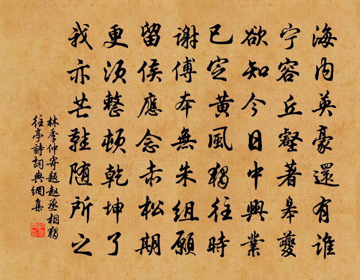 詩詞名句歷史字典書法欣賞書法字典國語詞典說文解字康熙字典古漢語字典標 題 作 者 詩 句 寄題趙丞相獨往亭詩作者:林季仲 朝代:宋代寄題趙丞相獨往亭詩原文海內英豪還有誰,寧容丘壑著皋夔。欲知今日中興業,已定黃風獨往時。謝傅本無朱組願,留侯應念赤松期。更須整頓乾坤了,我亦芒鞋隨所之。詩詞問答問:寄題趙丞相獨往亭詩的作者是誰?答:林季仲問:寄題趙丞相獨往亭詩寫於哪個朝代?答:宋代林季仲寄題趙丞相獨往亭詩書法欣賞寄題趙丞相獨往亭詩書法作品詩詞推薦落花宋祁〔宋代〕前溪夜雨錦張紅,墜萼殘英繞暗叢。已與吹開復吹謝,無情畢竟是春風。挽常蒲端明二首衛宗武〔宋代〕異邑阻登門。因風輒寄聲。方馳咫尺牘,已瘧兩間楹。模倣楚人些,摩挲白傅銘。貞元朝士幾,三嘆重傷情。六月白菊黃庚〔宋代〕□客背時芳,何須晚節香。人間方夏熱。籬下自秋光。便是重陽日,真成六月霜。若教陶令見,應以醉為鄉。秋風嘆四首吳潛〔宋代〕軍書督戰急,縣吏催租還。力盡將何訴,浮雲深九關。頌古八首釋深〔宋代〕龐眉策起貌稜層,見佛元來卻不曾。南嶽天台相撞著,被人喚作捉秦儈。頌古釋慧空〔宋代〕靈雲失腳,玄沙落塹,三十年冰河發焰。浣溪沙蘇軾〔宋代〕明日酒醒,雪大作,又作二首覆塊青青麥未蘇。江南雲葉暗隨車。臨皋煙景世間無。雨腳半收檐斷線,雪林初下瓦臨江仙晁沖之〔宋代〕雙舸亭亭橫晚渚,城中飛觀嵯峨。畫橋燈火照清波。玉鉤平浸水,金鎖半瀋河。試問無情堤上柳,也應厭聽離歌。記牡丹事二首劉克莊〔宋代〕暴骸獨柳冤誰雪,藁葬青山過者悲。甘露殿中空誦賦,沉香亭畔更無詩。盤居六章項安世〔宋代〕行止盤盤,其樂孔多。請以是居,子如之何。湖上宋祁〔宋代〕雪後雲歸露晚暾,凍舟猶自滯溪門。潛魚不上湖光靜,漠漠寒沙印雁痕。離三節鎮日色正盛頃間雲起陽烏不見終日清涼郭印〔宋代〕忽訝雲峰合,渾忘暑氣侵。垂天真有意,籠日豈無心。行旅人人悅,空山處處陰。更期頭上黑,相送到溪林。參政大資毗陵張公輓詩十首周麟之〔宋代〕憶昔春官試,唯公季子俱。別來成永訣,返哭慟諸孤。忍預 * 列,空懷解劍趨。新阡閟長夜,雪涕墮平蕪。春貼子詞皇太后閣六首司馬光〔宋代〕母德思齊盛,天心奮豫初。青暉凝輦路,佳氣擁宸居。靈芝寺避暑因攜茶具汎湖共成十絕張鎡〔宋代〕一色琉璃碧簟橫,更無觴豆引飛蠅。從渠日氣如湯烈,不礙盆中數尺冰。玉樓春毛並〔宋代〕日長澹澹光風轉。小尾黃蜂隨早燕。行尋香逕不逢人,惟有落紅千萬片。酒成憔悴花成怨。閒殺羽觴難會面。可堪哭郭若虛程時翼〔宋代〕一枝夭矯摩雲操,三尺光芒報國心。易水歌殘聲杳杳,□□月落夜沉沉。次韻李校書雨中至四聖觀三絕句項安世〔宋代〕今日真仙宅,當年處士家。江梅疏影盡,無數海棠花。送邊伯京之閩王冕〔元代〕邊郎辟掾南閩去,馬首春光正十分。路夾海棠行錦障,江涵山翠擁羅文。簡書可勵風雲會,韜略能夷虎豹群。若向游司真洞釋正覺〔宋代〕桃華濯錦春水寒,洞門窈窕玉勾欄。三峰擁翠雲吞屋,九井揚波雪濺壇。象帝先身元老語,穀神後事阿誰觀。羽郎名句推薦流水孤村,荒城古道。陳霆《踏莎行·晚景》 但從今、記取楚樓風,裴台月。辛棄疾《滿江紅·漢水東流》 願君多採擷,此物最相思。王維《相思》 綠衣監使守宮門,一閉上陽多少春。白居易《上陽白髮人》 漢家君臣歡宴終,高議雲台論戰功。王維《少年行四首》 百歲落半途,前期浩漫漫。李白《登敬亭山南望懷古贈竇主簿》 天下有道則見,無道則隱。孔子弟子《論語·泰伯篇》 無人收廢帳,歸馬識殘旗。張籍《沒蕃故人》 桃李不言,下自成蹊。司馬遷《史記·李將軍列傳》 兒童急走追黃蝶,飛入菜花無處尋。楊萬里《宿新市徐公店》