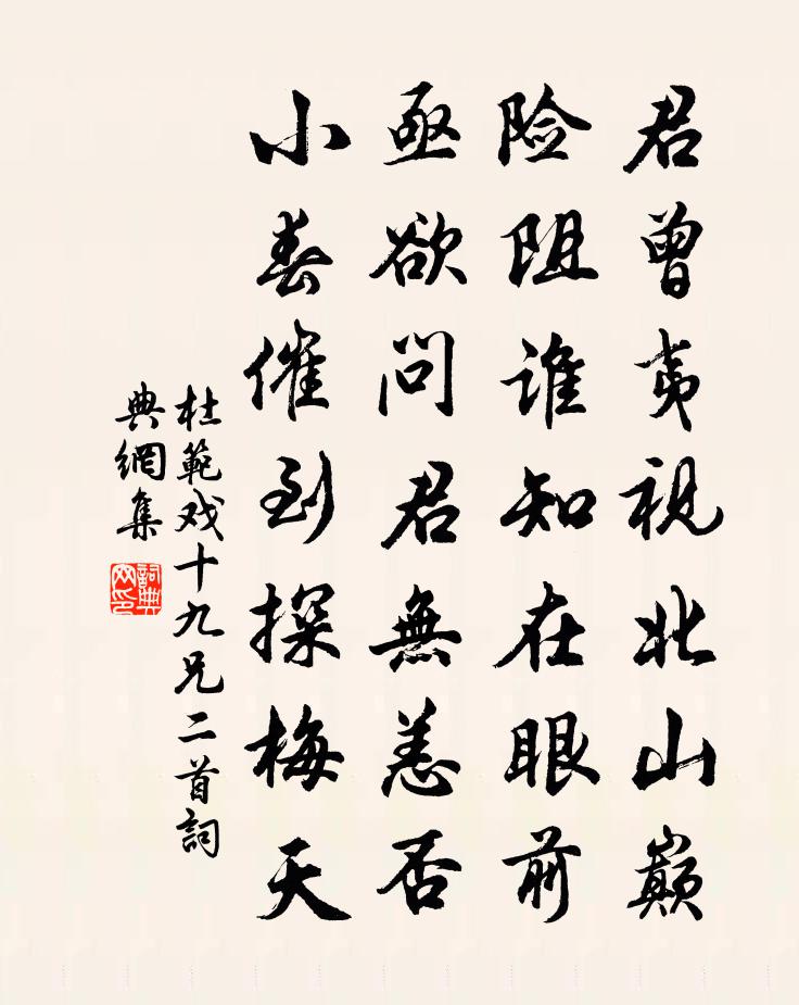 詩詞名句歷史字典書法欣賞書法字典國語詞典說文解字康熙字典古漢語字典標 題 作 者 詩 句 戲十九兄二首作者:杜范 朝代:宋代戲十九兄二首原文君曾夷視北山巔,險阻誰知在眼前。亟欲問君無恙否,小春催到探梅天。詩詞問答問:戲十九兄二首的作者是誰?答:杜范問:戲十九兄二首寫於哪個朝代?答:宋代杜范戲十九兄二首書法欣賞戲十九兄二首書法作品詩詞推薦和劉後村梅花百詠方蒙仲〔宋代〕歲歲年年花狀頭,瑤璫瓊佩瑞光浮。玉螭賞遍三千界,不識珠簾十二樓。緣識宋太宗〔宋代〕蔟蔟排弦聲流美,因風獨弄無宮徵。閒庭引思道情中,五音不入行人耳。仰望雲霄聽未足,何期到了不成曲。秋蟬寄南中友人張喬〔唐代〕相夢如相見,相思去後頻。舊時行處斷,華發別來新。浪動三湘月,煙藏五嶺春。又無歸北客,書札寄何人。新婚梅堯臣〔宋代〕前日為新婚,喜今復悲昔。閫中事有托,月下影免只。慣呼猶口誤,似往頗心積。幸皆柔淑姿,稟賦誠所獲。郁山主贊釋心月〔宋代〕豀橋驢子失腳處,百尺竿頭進步時。頂踵一時俱換了,依前只是郁闍梨。送王適徐州赴學蘇轍〔宋代〕送別江南春雨淫,北方誰是子知音。性如白玉燒猶冷,文似朱弦叩愈深。萬里同舟寬老病,一杯分袂發悲吟。明年送宜興張教授彥高方回〔宋代〕憶我南湖老,循王又有孫。新昇陽羨郡,改觀大成門。官異吏曹冗,士知師道尊。諸生果成服,此事要深論。次韻曾帥遣意三首郭印〔宋代〕文章遊戲裡,政事笑談餘。種就三田藥,編成一帙書。情忘心自適,神定氣長舒。四海曾人子,何人可學歟。郊廟歌辭。釋奠武成王樂章。迎俎酌獻佚名〔唐代〕五齊潔,九牢碩。梡橛循,罍斝滌。進具物,揚鴻績。和奏發,高靈寂。虔告終,繁祉錫。昭秩祀,永無易。新移竹栽喜於得雨而池中鸂鶒乃以水溢而去戲陸游〔宋代〕霧雨三日天沉陰,西溪水長二尺深。土濡新竹有生意,池滿文禽無住心。竹根蘇活賴此雨,禽亦歸飛戲煙浦。去留挽李中甫使君孫應時〔宋代〕發軔期行志,鳴琴最得民。淵魚何用察,桑雉本來馴。可嘆雙旌暮,猶歌五袴新。誰為良吏傳,吾欲表斯文。木蘭花令蘇軾〔宋代〕經旬未識東君信。一夕薰風來解慍。紅綃衣薄麥秋寒,綠綺韻低梅雨潤。瓜頭綠染山光嫩。弄色金桃新傅粉。日高題朱仲華百牛圖方回〔宋代〕以棟樑成廈屋,萬牛不足。以耒耜命巾車,一牛有餘。畫師幻此沮洳澤,若牯{牯古換孛}犢輩且百。太平村落豐不可知吟邵雍〔宋代〕犁牛生騂角,老蚌產明珠。人雖欲勿用,山川其舍諸。事固不可知,物亦難其拘。一歸於臆度,義失乎精粗。減字木蘭花(玩月答蒙庵和詞)劉辰翁〔宋代〕何須翦紙。依舊一團圓照水。莫倚空寒。柳下池邊也只般。君何忽忽。宇宙人生都是客。月在雲端。人自愁人不解復挽施士衡〔宋代〕十年帥鋮倦馳驅,適意方謀一壑居。賈誼有才終太傳,薛收無壽處中書。傷心風月江心古,過眼光陰夢幻虛。紅紫和食筍二首馮時行〔宋代〕敢將蔬筍擬甘鮮,清瘦肥痴定孰賢。氣味比僧從淡薄,支離似鶴要輕便。未隨煙客登山屐,且輟江神飲馬錢。一歲瑞鶴仙(栽梅)呂勝己〔宋代〕南州春又到。向臘盡冬殘,冰姑先報。芳心愛春早。露生香馥馥,靚妝皎皎。詩人最巧。道竹外、斜枝更好。旋移答劉連州邦字柳宗元〔唐代〕連璧本難雙,分符刺小邦。崩雲下灕水,劈箭上潯江。負弩啼寒狖,鳴枹驚夜狵。遙憐郡山好,謝守但臨窗。滿江紅(賀王宣子產湖南寇)辛棄疾〔宋代〕笳鼓歸來,舉鞭問、何如諸葛。人道是、匆匆五月,渡瀘深入。白羽風生貔虎噪,青溪路斷猩鼯泣。早紅塵、一騎名句推薦欲速則不達。孔子弟子《論語·子路篇》 何處寄想思,南風搖五兩。王維《送宇文太守赴宣城》 勸君終日酩酊醉,酒不到劉伶墳上土。李賀《將進酒》 惟有兩行低雁,知人倚、畫樓月。范成大《霜天曉角·梅》 同心一人去,坐覺長安空。白居易《別元九後詠所懷》 相逢清露下,流影濕衣襟。袁枚《夜過借園見主人坐月下吹笛》 日入群動息,歸鳥趨林鳴陶淵明《飲酒·七》 城中桃李愁風雨,春在溪頭薺菜花。辛棄疾《鷓鴣天·陌上柔桑破嫩芽》 花開不並百花叢,獨立疏籬趣未窮。鄭思肖《畫菊》 誓將掛冠去,覺道資無窮。岑參《與高適薛據同登慈恩寺浮圖》