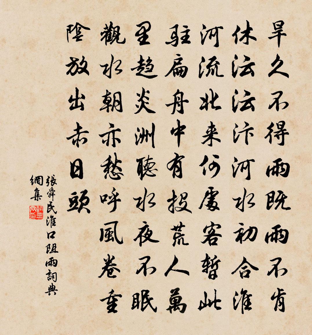 詩詞名句歷史字典書法欣賞書法字典國語詞典說文解字康熙字典古漢語字典標 題 作 者 詩 句 淮口阻雨作者:張舜民 朝代:宋代淮口阻雨原文旱久不得雨,既雨不肯休。沄沄汴河水,初合淮河流。北來何處客,暫此駐扁舟。中有投荒人,萬里趨炎洲。聽水夜不眠,觀水朝亦愁。呼風卷重陰,放出赤日頭。詩詞問答問:淮口阻雨的作者是誰?答:張舜民問:淮口阻雨寫於哪個朝代?答:宋代張舜民淮口阻雨書法欣賞淮口阻雨書法作品詩詞推薦題南山石應孫〔宋代〕孤鶩去邊天浩渺,萬家窮處水灣環。嶺外此州為道院,風煙殊弗類南蠻。頌十玄談回機釋印肅〔宋代〕再三撈摝始方知,捉影逃形也太痴。行眼大悲分得半,維摩老漢始全提。寄會稽范希文滕宗諒〔宋代〕江山千里接仁封,都在東南秀氣中。借問玉皇香案吏,蓬萊何似水晶宮。送次饒趙職方罷成德軍通判還朝宋祁〔宋代〕倅乘淹榮序,封軺促覲期。文章二台妙,昆弟五常眉。樹隱征郵密,花留祖蓋遲。秋毫供握處,春草見歸時。書笏送王仲矜倅興元樓鑰〔宋代〕蜀道難,難於上青天。蜀道易,易於履平地。蜀山天險固自若,視難為易在人爾。王尊真有四方誌,叱馭逕行了無和劂丈侍郎王洋〔宋代〕鴻濛花棲神契,花脫落力自花由。諒此花丈夫事,寧為兒女憂。丈人志宇宙,織芥無滯留。靜觀四大室,俛仰七十金陵懷古六首周文璞〔宋代〕琵琶未盡使人嗟,淚灑華林御苑花。今日聞韶無處所,雁煙蛩雨屬他家。過招賢渡檔四首楊萬里〔宋代〕岸上行人莫嘆勞,長年三老政呼號。也知灘惡船難上,仰蹈桅竿臥著篙。望廬山陳杰〔宋代〕去年山中行,未了廬山意。今年江上望,始盡廬山勢。只道山中行,未識廬山面。那知江上望,已失廬山願。人生送黃灝宋祁〔宋代〕橫步文林二十春,華顛初得半通綸。江邊又濯滄浪水,堂上寧招骯髒人。未分塵纓慚蕙帳,不緣羊酪棄羹蒪。思家去國行梁啓超〔清代〕嗚呼濟艱乏才兮,儒冠容容。佞頭不斬兮,俠劍無功。君恩友仇兩未報,死於賊手毋乃非英雄。割慈忍淚出國門,有感陳鑒之〔宋代〕淋雨何人記子桑,朱門車馬漲塵黃。百年友誼須英概,畫虎何妨效季良。武帝問日{左石右單}劉子翬〔宋代〕漢朝人物盡英奇,武帝招延盛一時。拒諫不能容汲直,託孤何至用胡兒。登奉聖寺千佛閣四首楊萬里〔宋代〕一隻奇峰入眼中,看來只只是奇峰。好山道是無重數,少說青蒼十萬重。偈頌十三首釋智遇〔宋代〕華亭滿船猶不足,南泉驟步蹈不著。自余眼底紛,總見月忘指。山中泛舟觴客文天祥〔宋代〕便作乘槎客,蕭蕭骨發清。尊前山月過,笛里水風生。半夜魚龍沸,三秋河漢明。雪堂眠二客,夢與白鷗盟。水調歌頭 天香詞顧阿瑛〔元代〕金粟綴仙樹,玉露浣人愁。誰道買花載酒,不似少年游。最是宮黃一點,散下天香萬斛,來自廣寒秋。蝴蝶逐人去次四六叔韻劉子翬〔宋代〕吾家小步兵,辭林獨輝映。攜詩過山堂,句挾風雲潤。思嵇遠命駕,訪戴屢乘興。訂古釋群疑,談玄發清聽。年均題池州覽亭劉過〔宋代〕塵土中無絕妙詞,不能重賦翠微詩。淋漓醉墨楊廷秀,慷慨悲吟杜牧之。岩壑尚多吾足倦,江山信美客歸遲。夕陽秋日再寄晁采〔唐代〕珍簟生涼夜漏余,夢中恍惚覺來初。魂離不得空成病,面見無由浪寄書。窗外江村鐘響絕,枕邊梧葉雨聲疏。此時名句推薦清愁詩酒少,寒食雨風多。張鎡《寒食》 聞賢而不舉,殆;聞善而不索,殆;見能而不使,殆管仲《管子·法法》 枯藤老樹昏鴉,小橋流水人家,古道西風瘦馬。馬致遠《天淨沙·秋思》 寒沙四面平,飛雪千里驚。范雲《效古詩》 將欲歙之,必故張之;將欲弱之,必故強之;將欲廢之,必故興之;將欲取之,必故與之。是謂微明。老子《老子·道經·第三十六章》 犯刑若履虎,不畏落爪牙。李白《秦女休行》 故園渺何處,歸思方悠哉。韋應物《聞雁》 西山白雪三城戍,南浦清江萬里橋。杜甫《野望》 孤鴻號外野,翔鳥鳴北林。阮籍《詠懷八十二首·其一》 五更鼓角聲悲壯,三峽星河影動搖。杜甫《閣夜》