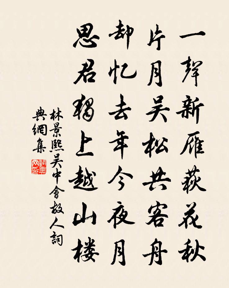 詩詞名句歷史字典書法欣賞書法字典國語詞典說文解字康熙字典古漢語字典標 題 作 者 詩 句 吳中會故人作者:林景熙 朝代:宋代吳中會故人原文一聲新雁荻花秋,片月吳松共客舟。卻憶去年今夜月,思君獨上越山樓。詩詞問答問:吳中會故人的作者是誰?答:林景熙問:吳中會故人寫於哪個朝代?答:宋代林景熙吳中會故人書法欣賞吳中會故人書法作品詩詞推薦定泉喻良能〔宋代〕茲泉定力冠諸泉,故向空山獨湛然。終日虛明無一物,客來惟見浪痕圓。素梅 其八王冕〔元代〕夷石心腸滿面霜,歲寒吾計未全荒。相逢休問春何處,定是調羹到玉堂。古別離五首覺非彭吏部白玉蟾〔宋代〕彩鳳何毰毸,有玉飛則立。竹林失所依,梧枝夜露泣。雞鶩疑九苞,鵷鷺厭五毛。伊獨怨德衰,簫韶如之何。偈六首釋慧勤〔宋代〕至道無難,唯嫌選擇。桃華紅,李花白,誰道融只一色。燕子語,黃鶯鳴,誰道關關只一聲。不透祖師關捩子,空勸農六首張嵲〔宋代〕春到逢花猶眼亂,老來對酒便心降。須知渴沛難禁醉,鴨綠潾潾酌玉缸。句胡澹翁〔宋代〕如今竹閣多清興,紫蟹尖圃不數暇。宿鐵關西館岑參〔唐代〕馬汗踏成泥,朝馳幾萬蹄。雪中行地角,火處宿天倪。塞迥心常怯,鄉遙夢亦迷。那知故園月,也到鐵關西。送春長句呈李泰伯祖無擇〔宋代〕盡日臨風把酒巵,宜春台上送春歸。已看綠樹陰陰靜,猶有殘花帖帖飛。歲月任從隨手過,功名未必與心違。我緣和汪正夫梅鄭獬〔宋代〕好花賦與本天才,料得靈根天上來。應為長安惡風土,故教北地不栽梅。北軒敧枕梅摯〔宋代〕苦無勤瘁補台網,西院西頭冷峭房。今日鈴齋一敧枕,清風不敢傲羲皇。偈傾一百三十三首釋法薰〔宋代〕東頭貴買,西頭賤賣。田地穩密衲僧,不妨遊戲自在。春旱二首張耒〔宋代〕風雲閒益高,旱色起諸嶺。施生澤未渥,曉氣挾余冷。飛沙磣桃李,碧草思耿耿。麥根不走地,稻壟臥陳梗。蛟龍游山五題題白蓮庵余靖〔宋代〕掩室昔宴居,冥心遺萬化。菡萏本無染,紛華共高謝。夜禪杉月落,晨齋庭鳥下。棟間雲氣浮,地面秋香詫。演法滿江紅 九月二十一日出京懷古史達祖〔宋代〕緩轡西風,嘆三宿、遲遲行客。桑梓外、鋤耰漸入,柳坊花陌。雙闕遠騰龍鳳影,九門空鎖鴛鴦翼。更無人、擫笛樂語王義山〔宋代〕猶是太真親手植。猩染鮮葩,歲歲如曾拭。絳節青旌光耀日。分明是個神仙匹。引領金扉紅的的。下有仙妃,縴手鸚鵡(一作翦羽)杜甫〔唐代〕鸚鵡含愁思,聰明憶別離。翠衿渾短盡,紅觜漫多知。未有開籠日,空殘舊宿枝。世人憐復損,何用羽毛奇。次韻題秋崖方岳〔宋代〕秋崖何嘗與人絕,渠自胸中欠風月。齊雲落星吾所無,草木深幽終是別。桂花正開山氣清,人間無路爭崢嶸。虛皇驀山溪劉一止〔宋代〕王家人地,奕奕爭高秀。金紫照青春,想當日、烏衣巷口。聲名氣概,今見兩朱轓,詩似錦,酒如澠,屬意風光厚正氣歌文天祥〔宋代〕余囚北庭,坐一土室。室廣八尺,深可四尋。單扉低小,白間短窄,污下而幽暗。當此夏日,諸氣萃然:雨潦四集和仲伯達蘇軾〔宋代〕歸山歲月苦無多,尚有丹砂奈老何。繡谷只應花自染,鏡潭長與月相磨。君方傍海看初日,我已橫江擊素波。人不名句推薦一聲梧葉一聲秋,一點芭蕉一點愁,三更歸夢三更後。徐再思《水仙子·夜雨》 財物輕,怨何生。言語忍,忿自泯。李毓秀《弟子規·出則弟》 怕黃昏忽地又黃昏,不銷魂怎地不銷魂。王實甫《十二月過堯民歌·別情》 春色將闌,鶯聲漸老。紅英落盡青梅小。寇準《踏莎行·春色將闌》 雙槳來時,有人似、舊曲桃根桃葉。姜夔《琵琶仙·雙槳來時》 今歲早梅開,依舊年時月。張孝祥《卜運算元·雪月最相宜》 青山綠水,白草紅葉黃花。白樸《天淨沙·秋》 裊裊兮秋風,洞庭波兮木葉下。屈原《九歌·湘夫人》 日日望鄉國,空歌白薴詞。張籍《薊北旅思 / 送遠人》 去年花里逢君別,今日花開已一年。韋應物《寄李儋元錫》
