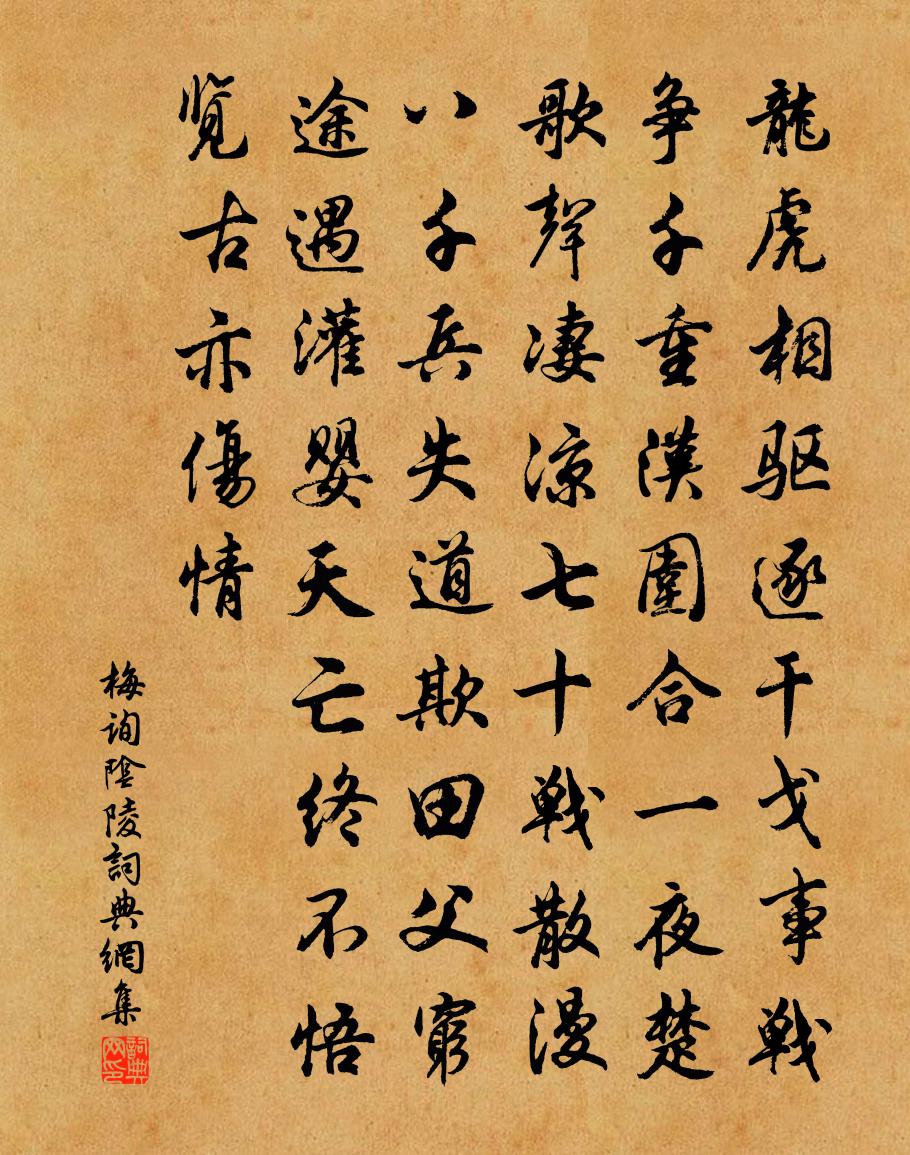 詩詞名句歷史字典書法欣賞書法字典國語詞典說文解字康熙字典古漢語字典標 題 作 者 詩 句 陰陵作者:梅詢 朝代:宋代陰陵原文龍虎相驅逐,干戈事戰爭。千重漢圍合,一夜楚歌聲。淒涼七十戰,散漫八千兵。失道欺田父,窮途遇灌嬰。天亡終不悟,覽古亦傷情。詩詞問答問:陰陵的作者是誰?答:梅詢問:陰陵寫於哪個朝代?答:宋代梅詢陰陵書法欣賞陰陵書法作品詩詞推薦寄江南鶴林寺石冰上人顧況〔唐代〕山川重複出,心地暗相逢。忽憶秋江月,如聞古寺鐘。湖平南北岸,雲抱兩三峰。定力超香象,真言攝毒龍。風中漁家傲梵琦〔元代〕聽說西方無量樂。長生不假神仙藥。胎就眼開花正拆。心彰灼。永為自在逍遙客。來度眾生離火宅。命終免被閻王挽念齋陳郎中陳杰〔宋代〕少學真 * ,郎潛劣晚逢。幾看新貴駛,獨抱古文終。夢事一丘盡,遺編千載公。空餘細論恨,裳錦玉樓東。題金淵綠淨亭張榘〔宋代〕憑高四望天沉沉,平蕪遠樹橫夕陰。碧雲吐吞獻奇象,乃知造物得我心。漁舟兩兩疊煙棹,白鳥出沒滄波深。悠然白雪曲張玉孃〔宋代〕簾白明窗雪,負急寒威冽。欲起理冰統,發凝指尖折。霜韓眠不穩,愁重腸千結。聞看胸梅梢,埋沒清塵絕。雪中登雲泉上方陸游〔宋代〕滃滃雲堆上,茫茫雪海中。煎茶夸坐客,打竹課蠻童。冰谷鳴飢鶴,煙汀立斷鴻。歸來更堪喜,葑火滿爐紅。江城子·江景蘇軾〔宋代〕湖上與張先同賦,時聞彈箏鳳凰山下雨初晴,水風清,晚霞明。一朵芙蕖,開過尚盈盈。何處飛來雙白鷺,如有意更漏子黃庭堅〔宋代〕體妖嬈,鬟婀娜。玉甲銀箏照座。危柱促,曲聲殘。王孫帶笑看。休休休,莫莫莫。愁撥個絲中索。了了了,玄玄他山之石袁燮〔宋代〕他山之石能攻玉,詩人此意宜三復。莫嫌山骨太堅峭,足使國珍充韞匱。磨礱砥礪功日新,圭璧琮璜光可燭。人生句黃子實〔宋代〕旅夢難安枕,村酤不滿瓶。和傅大卿喜雪袁燮〔宋代〕人情誰不愛飛雪,臘中再見尤奇絕。對雪吟喔色即空,仙翁洞照無生滅。既積既消還復飛,且飛且積俄又非。瞭然夜尋盧處士耿湋〔唐代〕月高雞犬靜,門掩向寒塘。夜竹深茅宇,秋庭冷石床。住山年已遠,服藥壽偏長。虛棄如吾者,逢君益自傷。清平樂(萍鄉必東館)趙師俠〔宋代〕無風輕燕。繚繞深深院。晝永人閒簾不捲。時聽鶯簧巧囀。清和天氣陰陰。南風初奏薰琴。喚起午窗新夢,愁添一失調名蘇軾〔宋代〕寂寂珠簾蛛網滿。寄青原山常不輕趙蕃〔宋代〕吾舅每談方外友,吃吃醉吟長在口。李侯佳句往往有,示我不輕詩數首。江湖願見非一日,豈有聞名不相識。路頭尋隱者韋九山人於東溪草堂朱灣〔唐代〕尋得仙源訪隱淪,漸來深處漸無塵。初行竹里唯通馬,直到花間始見人。四面雲山誰作主,數家煙火自為鄰。路傍句周世昌〔宋代〕畫鼓雷奔天不雨,彩旗雲聳地生風。過友人幽居殷堯藩〔唐代〕身坐眾香國, * 詩思新。一貧曾累我,此興未輸人。陋巷誰為俗,寒窗不染塵。石齋盟四友,年下頓生春。璞庵釋紹曇〔宋代〕含藏一片玉連城,三度親曾獻楚庭。未跨門時琢雕了,春風深鎖綠蘿扃。詠雪石延年〔宋代〕台上魂消猶似蝶,樓中妝暖不成梅。亂隨瑤水冰先釋,試伴瓊林萼並開。名句推薦海日生殘夜,江春入舊年。王灣《次北固山下》 路漫漫其修遠兮,吾將上下而求索。屈原《離騷》 心有疑,隨札記。就人問,求確義。李毓秀《弟子規·餘力學文》 長恨去年今夜雨,灑離亭。晏幾道《愁倚闌令·花陰月》 分明久旱逢甘雨,賽過他鄉遇故知。馮夢龍《醒世恆言·卷二十》 思牽今夜腸應直,雨冷香魂吊書客。李賀《秋來》 思來江山外,望盡煙雲生。張九齡《秋晚登樓望南江入始興郡路》 隰桑有阿,其葉有幽。佚名《隰桑》 鏡湖三百里,菡萏發荷花。李白《子夜吳歌·夏歌》 為其所難者,必得其所欲焉;未聞為其所欲,而免其所惡者也。墨子《墨子·01章 親士》