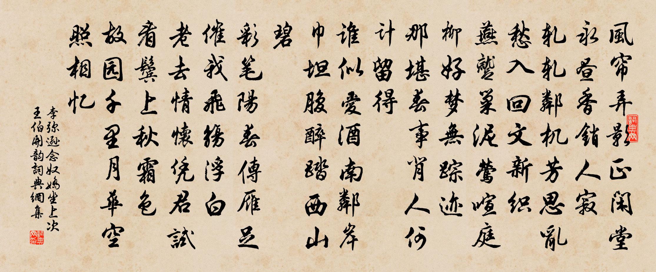 詩詞名句歷史字典書法欣賞書法字典國語詞典說文解字康熙字典古漢語字典標 題 作 者 詩 句 念奴嬌(坐上次王伯開韻)作者:李彌遜 朝代:宋代念奴嬌(坐上次王伯開韻)原文風簾弄影,正閒堂永晝,香銷人寂。軋軋鄰機芳思亂,愁入回文新織。燕蹴巢泥,鶯喧庭柳,好夢無蹤跡。那堪春事,背人何計留得。誰似愛酒南鄰,岸巾坦腹,醉踏西山碧。彩筆陽春傳雁足,催我飛觴浮白。老去情懷,憑君試看,鬢上秋霜色。故園千里,月華空照相憶。詩詞問答問:念奴嬌(坐上次王伯開韻)的作者是誰?答:李彌遜問:念奴嬌(坐上次王伯開韻)寫於哪個朝代?答:宋代問:念奴嬌(坐上次王伯開韻)是什麼體裁?答:詞李彌遜念奴嬌(坐上次王伯開韻)書法欣賞念奴嬌(坐上次王伯開韻)書法作品詩詞推薦經汾陽舊宅趙嘏〔唐代〕門前不改舊山河,破虜曾經馬伏波。今日獨經歌舞地,古槐疏冷夕陽多。鵲橋仙佚名〔宋代〕我嗏今夜為情忙,又那得、工夫送巧。八月十五日夜聞崔大員外翰林獨直對酒玩月因白居易〔唐代〕清景偶題是詩秋月高懸空碧外,仙郎靜玩禁闈間。歲中唯有今宵好,海內無如此地閒。皓色分明雙闕榜,清光深到枯菊陸游〔宋代〕翠羽金錢夢已闌,空餘殘蕊抱枝乾。紛紛輕薄隨流水,黃與姚花一樣看。村姑二首宋伯仁〔宋代〕翠鬢雙妥未梳頭,紡緯車邊坐欲羞。幾度採桑歸較晚,阿孃疑看落花愁。和董庶中古散調詞贈尹果毅劉禹錫〔唐代〕昔聽東武吟,壯年心已悲。如何今濩落,聞君辛苦辭。言有窮巷士,弱齡頗尚奇。讀得玄女符,生當事邊時。借名與李彭年同送崔岐歸二曲,馬上口占蘇軾〔宋代〕霜乾木落愛秦川,興發身輕逐鳥翩。貪看暮山忘遠近,強陪歸客更留連。貂裘犯雪觀形勝,駿馬隨鷹摶野鮮。為問過華清內廄門李商隱〔唐代〕華清別館閉黃昏,碧草悠悠內廄門。自是明時不巡幸,至今青海有龍孫。斑石枕聯句黃庶〔宋代〕斸得西山骨,磨礱露斑駁。凝結一何怪,形模萬難學。直疑彩雲根,又訝紫珉璞。中瘦皺蛟腹,外文灼龜殼。冷剖漁家傲·千古龍蟠並虎蘇軾〔宋代〕金陵賞心亭送王勝之龍圖。王守金陵,視事一日移南郡。千古龍蟠並虎踞。從公一吊興亡處。渺渺斜風吹細雨。芳最高樓 商於魯縣北山元好問〔金代〕商於路,山遠客來稀。雞犬靜柴扉。東家歡飲姜芽脆,西家留宿芋魁肥。覺重來,猿與鶴,總忘機,風浪里,竟安冀州道中王冕〔元代〕我行冀州路,默想古帝都。水土或匪昔,禹貢書亦殊。城郭類村塢,雨雪苦載塗。叢薄聚凍禽,狐狸嘯枯株。寒雲述志陸游〔宋代〕新豐買酒慰無聊,沖雪騎驢上濿橋。羆老尚堪吞貈子,松風何至羨山苗?次單君范袖來汪西皋所譔詠秋十章以示因和之陳著〔宋代〕鴉帶殘陽入翠微,紛紛黃葉向人飛。西風不管人閒事,雁自南飛燕自歸。錢塘懷古董師謙〔宋代〕衣帶一條水,靴尖三百州。市朝陳跡在,圖籍別人收。南渡衣冠盡,西湖歌舞休。久知事當爾,曾記五更頭。三月十三日本約潘郎同游安園以雨不果因飲於張耒〔宋代〕沖泥看花亦不惡,泥深三尺馬苦臞。閉門且復與君飲,吟詩寫字樂有餘。姚黃一枝說不盡,天姬帝子非世姝。念君將至巴陵孔武仲〔宋代〕南行應不嘆途窮,水驛連翩遇好風。遠浪飛來千白鷺,輕帆相逐兩冥鴻。殘雲日掛蒼茫外,平野天垂曠闊中。湘浦婺州路別錄事戴叔倫〔唐代〕府中相見少,江上獨行遙。會日起離恨,新年別舊僚。春雲猶伴雪,寒渚未通潮。回首群山暝,思君轉寂寥。天姥岑望天台山靈澈〔唐代〕天台眾峰外,華頂當寒空。有時半不見,崔嵬在雲中。乙巳九月登冶城作王安石〔宋代〕欲望鍾山岑,因知冶城路。躋攀隱木杪,稍記曾游處。紅沉渚上日,蒼起榛中霧。即事有哀傷,山川自如故。名句推薦湘江兩岸花木深,美人不見愁人心。盧仝《有所思》 終然獨不見,流淚空自知。李白《獨不見》 歡宴良宵好月,佳人修竹清風。吳文英《風入松·麓翁園堂宴客》 儻寄相思字,愁人定解顏。錢起《送夏侯審校書東歸》 何處寄想思,南風搖五兩。王維《送宇文太守赴宣城》 日中則昃,月盈則食佚名《易傳·彖傳下·豐》 有情知望鄉,誰能鬒不變?謝朓《晚登三山還望京邑》 倚遍闌乾,只是無情緒。李清照《點絳唇·閨思》 贈遠虛盈手,傷離適斷腸。李商隱《十一月中旬至扶風界見梅花》 夜戰桑乾北,秦兵半不歸。許渾《塞下曲》