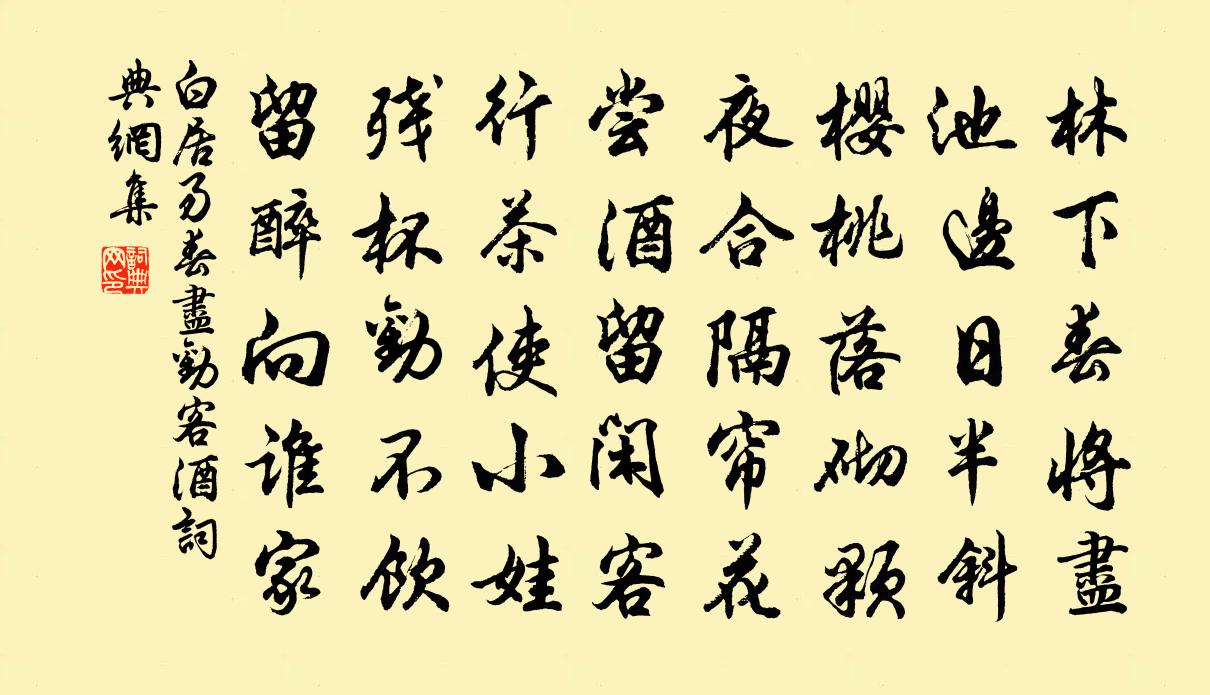 林下春將盡,池邊日半斜。櫻桃落砌顆,夜合隔簾花。