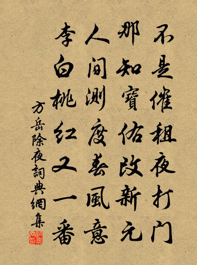 詩詞名句歷史字典書法欣賞書法字典國語詞典說文解字康熙字典古漢語字典標 題 作 者 詩 句 除夜作者:方岳 朝代:宋代除夜原文不是催租夜打門,那知寶佑改新元。人間測度春風意,李白桃紅又一番。詩詞問答問:除夜的作者是誰?答:方岳問:除夜寫於哪個朝代?答:宋代方岳除夜書法欣賞除夜書法作品詩詞推薦鳳棲梧 先師昔日屢言,燕山天下最勝之地,尹志平〔元代〕天下風光何處好。山海潛通,無比燕中道。四海雲朋來往繞。先師默悟知還到。既入玄門須悟早。誰解修真,此事追感晁說之〔宋代〕潁水箕山已卜休,忽逢新政悞恩收。白頭不識為郎嘆,黃帽難供作客愁。何事京師書信斷,謾從澤國稻粱謀。和親春遊五首邵雍〔宋代〕二月方當爛漫時,翠華未幸春無依。綠楊陰里尋芳遍,紅杏香中帶醉歸。數片落花蝴蝶趁,一竿斜日流鶯啼。清樽漁父詞四首戴復古〔宋代〕漁父飲,不須錢。柳枝斜貫錦鱗鮮,換酒卻歸船。次韻曾端伯晚過青山李牧〔宋代〕怪底塵勞破,青山在眼中。竹橋低跨水,林磬小鳴風。半嶺暮雲碧,一村霜葉紅。禪枝棲眾鳥,回首意無窮。城上對月期友人不至白居易〔唐代〕古人惜晝短,勸令秉燭游。況此迢迢夜,明月滿西樓。復有盈樽酒,置在城上頭。期君君不至,人月兩悠悠。照水次韻和歐勉甫見送孔武仲〔宋代〕抱關委吏可忘年,而況吾從志聖賢。策馬漸隨南去雁,寄聲應有北歸船。無情尺水猶能鑒,有志精金尚可鐫。願以倚欄趙汝鐩〔宋代〕倚欄有恨無人說,暮角吹梅寒聲咽。急風卷雨過雁驚,吐下蘆花一枝雪。五相邵雍〔宋代〕北巷通南陌,門連五相家。水分池對岸,牆隔樹交花。癸卯與宋堯夫集於豫章之貢院既別堯夫就親南曾豐〔宋代〕吾人同醉豫章春,別後惟君日日新。家據東床官北關,腰錢騎鶴更何人。長命洲馬之純〔宋代〕如何長命作洲名,梁武當時此放生。鵝鴨成群如市肆,雞豚無數似屯營。豈知半被狸奴食,寧免私為鶴戶烹。不殺郊廟歌辭。祭汾陰樂章。太和王晙〔唐代〕於穆聖皇,六葉重光。太原刻頌,后土疏場。寶鼎呈符,歊雲孕祥。禮樂備矣,降福穰穰。冬夕閒詠陸游〔宋代〕柳眼梅須漏泄春,江南又見物華新。終年幽興遺身世,半夜孤吟愴鬼神。客有疏親俱握手,酒無賢聖總濡唇。放翁蝶戀花楊 * 〔宋代〕初過元宵三五後。曲檻依依,終日搖金牖。瘦損舞腰非為酒。長條聊贈垂鞭手。幾葉小梅春已透。信是風流,占盡偈頌七十六首釋師觀〔宋代〕孤雲野鶴,何天不飛。這一句子,同道方知。賢者之孝二百四十首仇覽林同〔宋代〕蒲亭一長耳,何許得歌聲。化我鴟梟類,而令哺所生。頤庵喜神贊白玉蟾〔宋代〕江月射雙眼,岩雲飛兩眉。自是上饒一團和氣,點化自家方寸真機。能落筆作泣鬼神之詩,能坐石下爛柯之棋。千綠蔭亭王奇〔宋代〕創得幽亭近嶺梅,綠陰名好稱仙才。四圍山色檐頭出,一帶泉聲竹里來。庚子正月彗見於室有詔求言因上己見有感作三岳珂〔宋代〕糧府久半慮,騎官方應占。天心昭可卜,人事備當嚴。一葦江難恃,三巴民已殲。閉關還早計,璿玉不須覘。醜奴兒慢/採桑子慢盧祖皋〔宋代〕湘筠展夢,還是帶恨敧枕。對千頃、風荷涼艷,水竹清陰。半掩龜紗,幾回小語月華侵。娉婷何處,回首畫橋,朱名句推薦錦瑟華年誰與度?賀鑄《青玉案·凌波不過橫塘路》 鳳尾森森,龍吟細細。曹雪芹《紅樓夢·第二十六回》 泉眼無聲惜細流,樹陰照水愛晴柔楊萬里《小池》 料得他鄉遇佳節,亦應懷抱暗悽然。韓偓《寒食日重遊李氏園亭有懷》 人不見,春在綠蕪中。祖可《小重山·誰向江頭遺恨濃》 尋尋覓覓,冷冷清清,淒悽慘慘戚戚。李清照《聲聲慢·尋尋覓覓》 奸巧語,穢污詞。市井氣,切戒之。李毓秀《弟子規·信》 世事短如春夢,人情薄似秋雲。朱敦儒《西江月·世事短如春夢》 多言數窮,不如守中。老子《老子·道經·第五章》 繁華事散逐香塵,流水無情草自春。杜牧《金谷園》