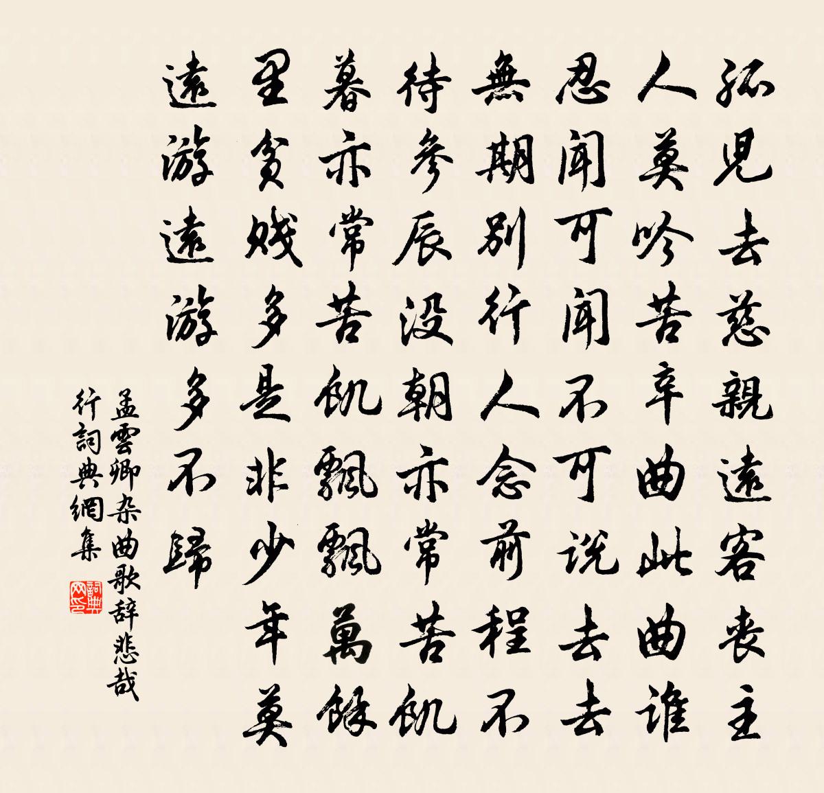 詩詞名句歷史字典書法欣賞書法字典國語詞典說文解字康熙字典古漢語字典標 題 作 者 詩 句 雜曲歌辭。悲哉行作者:孟雲卿 朝代:唐代雜曲歌辭。悲哉行原文孤兒去慈親,遠客喪主人。莫吟苦辛曲,此曲誰忍聞。可聞不可說,去去無期別。行人念前程,不待參辰沒。朝亦常苦飢,暮亦常苦飢。飄飄萬餘里,貧賤多是非。少年莫遠遊,遠遊多不歸。詩詞問答問:雜曲歌辭。悲哉行的作者是誰?答:孟雲卿問:雜曲歌辭。悲哉行寫於哪個朝代?答:唐代問:雜曲歌辭。悲哉行是什麼體裁?答:樂府孟雲卿雜曲歌辭。悲哉行書法欣賞雜曲歌辭。悲哉行書法作品注釋全唐詩:卷24_13全唐詩:卷157_3詩詞推薦夜坐有懷曹鄴〔唐代〕悄悄月出樹,東南若微霜。愁人不成寐,五月夜亦長。佳期杳天末,骨肉不在旁。年華且有限,厥體難久康。人言和廖守岳陽樓韻三首王炎〔宋代〕清香燕寢憩儒先,出對湖山一莞然。紅旆小驅聊緩帶,青雲直上且揚鞭。肯容坐客同揮麈,莫憚行廚費擊鮮。種就素梅 其九王冕〔元代〕不向羅浮問醉仙,笑呼孤鶴下吳天。春風吹散梅花雪,香滿西湖載酒船。清平樂(賦木犀詞)辛棄疾〔宋代〕月明秋曉。翠蓋團團好。碎剪黃金教恁小。都著葉兒遮了。折來休似年時。小窗能有高低。無頓許多香處,只消三毗陵龔君以崇見投古風思致不風依韻答之孫應時〔宋代〕松柏有佳色,矯矯澗欲涯。要經鸞鳳棲,豈怨人跡遐。匠石初未逢,千歲甘枯槎。萬牛送明堂,亦不以自誇。奇物寄上金陵馬右丞林逋〔宋代〕專席頃嘗居憲府,擁旄尋亦別明庭。金陵土著多蒙賴,分野三回見福星。哭李觀孟郊〔唐代〕志士琴不得老,琴多為直氣琴傷。阮公終日哭,壽命固難長。顏子既殂謝,孔門無輝光。文星落奇曜,寶劍摧修鋩愛客韓淲〔宋代〕婆餅焦何急,飛鳴小竹間。雨多溪漲水,雲厚日藏山。景物固無恙,人情終等閒。老來惟愛客,茶果或相關。呂氏宅妖誓師詞佚名〔唐代〕天馬斜飛度三止,上將橫行擊四方。輜車直入無迴翔,六甲次第不乖行。和同官問耳疾六首曹勛〔宋代〕鐘鼓嗟無與,衰殘亦任時。歲華髭鬢上,心事永雲知。尚若泠然善,何能養就兒。數篇存雅道,三復愧新詩。米元章臨智永千文真草帖贊岳珂〔宋代〕永之漢,妍而婉。芾之體,峭以健。馬牛其風,神合志通。彼妍我峭,惟神克肖。故曰袒裼不浼,夜戶不啟。善學春帖子詞二十首皇后合五首歐陽修〔宋代〕鶯寒未報宮花發,風暖還催臘雪銷。欲識春來自何處,先從天上斗回杓。和襲美寄題鏡岩周尊師所居陸龜蒙〔唐代〕見說身輕鶴不如,石房無侶共雲居。清晨自削靈香柹,獨夜空吟碧落書。十洞飛精應遍吸,一簪秋發未曾梳。知君摸魚兒劉辰翁〔宋代〕想幼安、遼東歸後,自羞年少龍首。長安市上壚邊臥,枉卻快行家走。空兩袖。染醉墨淋漓,把似天香透。功名邂奉和聖制溫湯對雪應制張說〔唐代〕瑞雪帶寒風,寒風入陰琯。陰琯方凝閉,寒風復淒斷。宮似瑤林匝,庭如月結滿。正賡挾纊詞,非近溫泉暖。贈隱者忘機家鉉翁〔宋代〕萬古周流此一機,何嘗絲髮涉人為。不須苦用忘忘意,認取存存不息時。次韻題畫卷四首其一山陰陳跡蘇轍〔宋代〕臥對郗人氣已真,晚依丘壑更無倫。不須復預清言侶,自是江東第一人。暑夕洪咨夔〔宋代〕樓高收晚照,野迥送宵陰。鷺下汀沙靜,螢行岸竹深。攖寧如順氣,緣督正平心。轉物天機妙,昭文不在琴。採桑子·謝家庭院殘更立納蘭性德〔清代〕謝家庭院殘更立,燕宿雕梁。月度銀牆,不辨花叢那辨香。此情已自成追憶,零落鴛鴦。雨歇微涼,十一年前夢一倚門徐僑〔宋代〕碧松窩裡著吾身,風在襟裙月在門。燈火未殘弦誦習,一團清興許誰論。名句推薦我有所念人,隔在遠遠鄉。白居易《夜雨》 臨難不顧生,身死魂飛揚阮籍《詠懷其五十三》 同居長乾里,兩小無嫌猜。李白《長干行二首》 何意百鍊剛,化為繞指柔。劉琨《重贈盧諶》 不見穿針婦,空懷故國樓。孟浩然《他鄉七夕》 會天大雨,道不通,度已失期司馬遷《陳涉世家》 永夜角聲悲自語,客心愁破正思家。汪元量《望江南·幽州九日》 千里鶯啼綠映紅,水村山郭酒旗風。杜牧《江南春》 杯酒相延,今夕不應慳。陳著《江城子·中秋早雨晚晴》 記當日、門掩梨花,翦燈深夜語。史達祖《綺羅香·詠春雨》