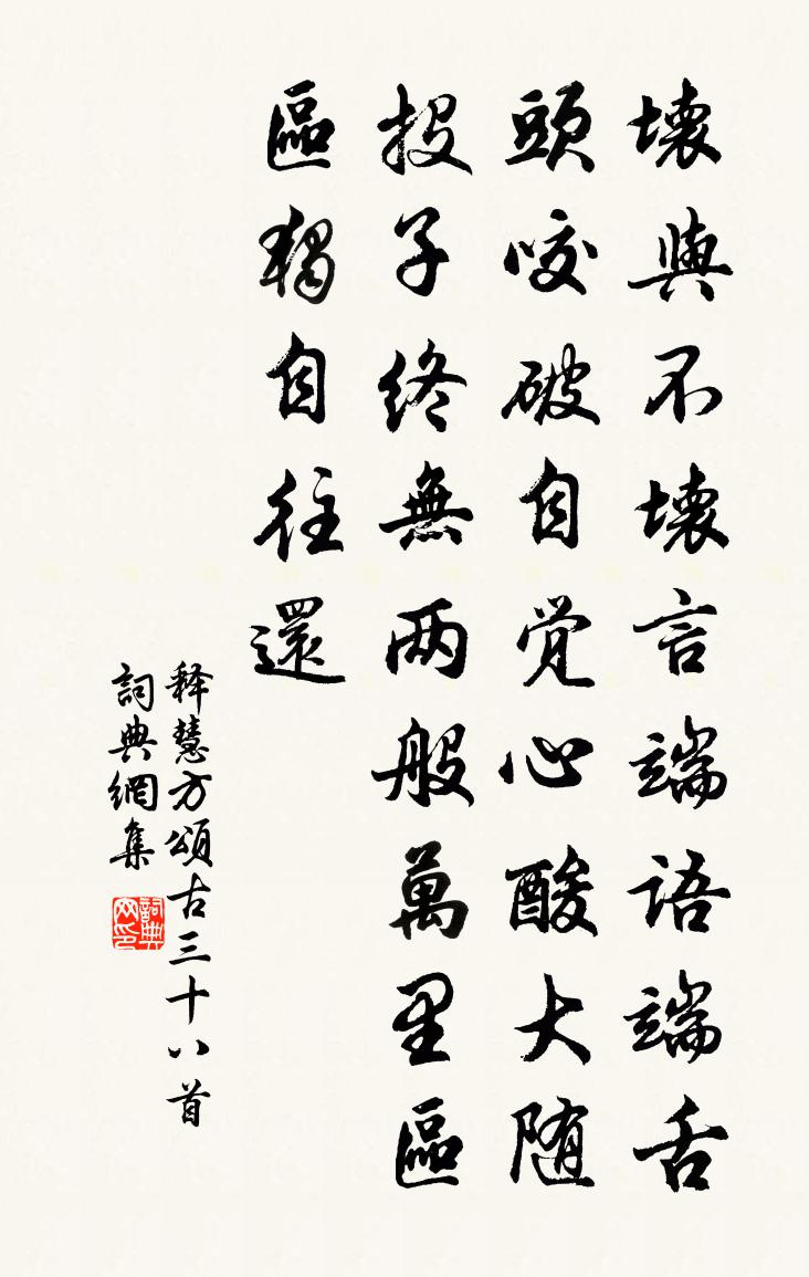詩詞名句歷史字典書法欣賞書法字典國語詞典說文解字康熙字典古漢語字典標 題 作 者 詩 句 頌古三十八首作者:釋慧方 朝代:宋代頌古三十八首原文壞與不壞,言端語端。舌頭咬破,自覺心酸。大隨投子,終無兩般。萬里區區,獨自往還。詩詞問答問:頌古三十八首的作者是誰?答:釋慧方問:頌古三十八首寫於哪個朝代?答:宋代釋慧方頌古三十八首書法欣賞頌古三十八首書法作品詩詞推薦玉汝弟創治新居作詩見詒次韻為答韓維〔宋代〕止足嘉言每念茲,不應華發嘆歸遲。非關啟第夸三戰,直為營巢欠一枝。盛放清風來北戶,細分鳴溜入西池。十年賓從集藕花堂分韻得園字二十韻劉學箕〔宋代〕流金爍石火燎燔,何地泄此畏暑袢。草堂幸有茆三間,冷浸十畝泉有源。泉音琮琤下空山,金石戛擊聲潺湲。太華四月十五日晚出溪上留連不能去宋庠〔宋代〕偶來尋晚景,便覺滌囂煩。岸柳相攙綠,風荷各自翻。歸云何處宿,驚鶩或時喧。不奈滄波闊,鳩山有故源。奉和御製中和節劉筠〔宋代〕載陽臨仲序,初吉協嘉名。國授民時正,天資植物榮。草薰翔澤雉,風暖度林鶯。堯思存稽古,洋洋播頌聲。簡許有實林尚仁〔宋代〕閒磨霜刃破銀瓜,沉水香銷日影斜。吟客不來情思懶,晚風庭院落槐花。送趙仁則官滿西歸三首方回〔宋代〕妙年意氣日方中,致有前賢長者風。言未始輕常簡潔,飲雖甚醉愈溫恭。此邦小屈為通守,吾老相逢已禿翁。自笑邃谷岩陳岩〔宋代〕千古嘗留一窖冰,女蘿竿竹鎖寒陰。仙人肯為遊人出,試問中間苦許深。句司空圖〔唐代〕忍事敵災星。物望傾心久,凶渠破膽頻。鼎飫和方濟,台階潤欲平。夜短猿悲減,風和鵲喜虛。驊騮思故第,鸚鵡滿月張諤〔唐代〕社金流茂祉,庭玉表奇才。竹似因談植,蘭疑入夢栽。烏將八子去,鳳逐九雛來。今夜明珠色,當隨滿月開。掛金索佚名〔宋代〕罩明珠。化生養就胎仙舞。真慶會、奼女圓聚。渴飲瓊漿,玉琴自然撫。韻定仙音,敲金擊玉。題融公蘭若(一作題容山主蘭若)孟浩然〔唐代〕精舍買金開,流泉繞砌回。芰荷薰講席,松柏映香台。法雨晴飛去,天花晝下來。談玄殊未已,歸騎夕陽催。頌古三十一首釋玿〔宋代〕明月大悲院裹齋,鐵圍山嶽盡沖開。豬頭象鼻,烏觜魚腮。石人撫掌呵呵笑,寒山拾得在天台。贈成封州陸游〔宋代〕綠髮臨邊固已奇,不應憔悴客京師。極知自有封侯骨,但要無忘耕壟時。意氣覆氈書捷布,風流橫槊賦新詩。平生代美人愁鏡其二李白〔唐代〕美人贈此盤龍之寶鏡。燭我金縷之羅衣。時將紅袖拂明月。為惜普照之餘暉。影中金鵲飛不滅。台下青鸞思獨絕。祖遜墓乾隆〔清代〕佳城之人云姓祖,考跡睪然興望古。越石竟讓先著鞭,尚憶聞雞共起舞。飛揚意氣亘千秋,終不能埋三尺土。嘗假馬於親舊不獲因感而成詠宋庠〔宋代〕東方昔借車,尼父嘗假蓋。一馬茲不全,夷塗出如閡。人無托乘寵,朝罕均茵載。策足本乏謀,臨風嗟有待。京洛始發鄂渚寄表臣二首劉禹錫〔唐代〕祖帳管弦絕,客帆西風生。回車已不見,猶聽馬嘶聲。曉發柳林戍,遙城聞五鼓。憶與故人眠,此時猶晤語。句元絳〔宋代〕菖酒朝觴滿,蘭湯曉浴溫。離平泉馬上作(一作離東都平泉)李德裕〔唐代〕十年紫殿掌洪鈞,出入三朝一品身。文帝寵深陪雉尾,武皇恩厚宴龍津。黑山永破和親虜,烏領全阬跋扈臣。自是游精思題觀主山房孟浩然〔唐代〕誤入桃源里,初憐竹逕深。方知仙子宅,未有世人尋。舞鶴過閒砌,飛猿嘯密林。漸通玄妙理,深得坐忘心。名句推薦昨夜狂風度,吹折江頭樹李白《長干行二首》 搜句忌於顛倒,裁章貴於順序劉勰《文心雕龍·章句》 樹陰滿地日當午,夢覺流鶯時一聲。蘇舜欽《夏意》 一家二貴,事乃無功。韓非及後人《韓非子·揚權》 霜威出塞早,雲色渡河秋。李白《太原早秋》 把酒對斜日,無語問西風。楊炎正《水調歌頭·把酒對斜日》 離別一何久,七度過中秋。蘇轍《水調歌頭·徐州中秋》 長於春夢幾多時,散似秋雲無覓處。晏殊《木蘭花·燕鴻過後鶯歸去》 逍遙以針勞,談笑以藥倦劉勰《文心雕龍·養氣》 那作商人婦,愁水復愁風。李白《長干行二首》