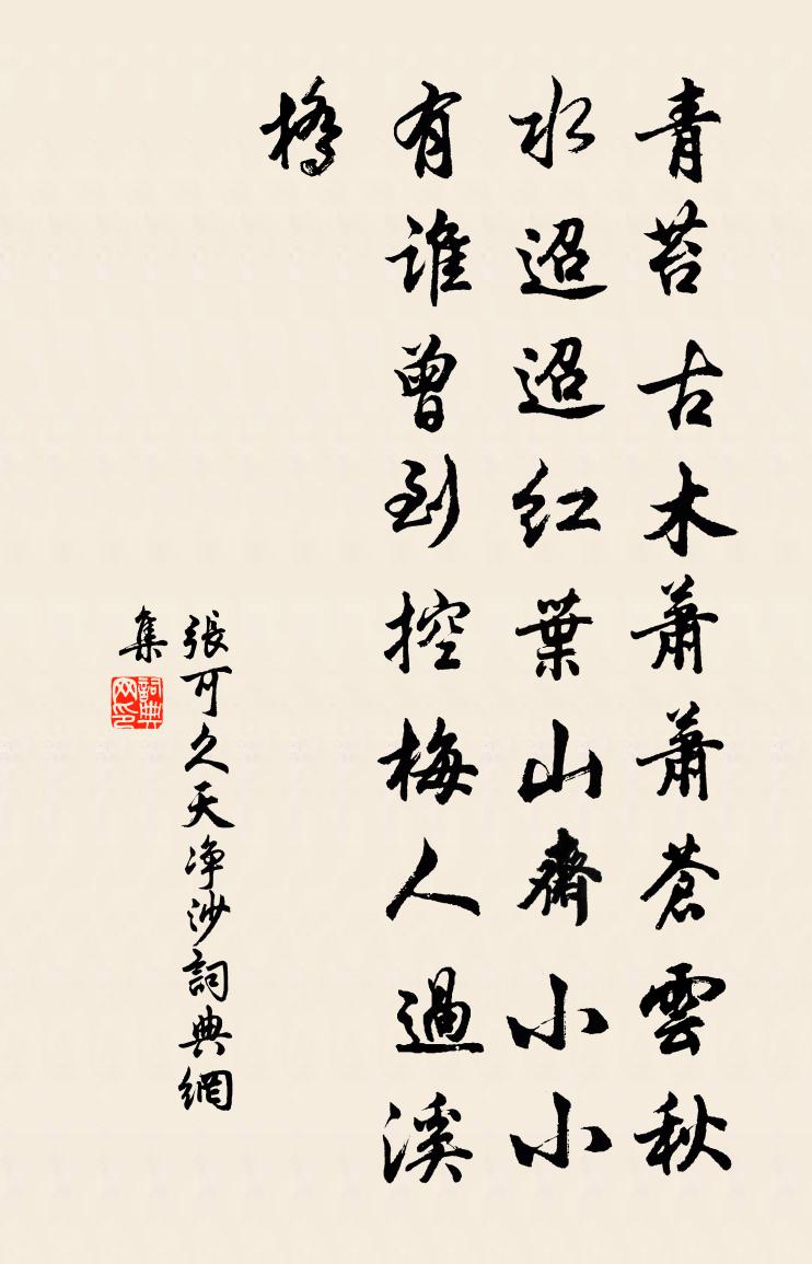 滿院青苔一株株古樹蕭蕭,蒼雲片片一江秋水迢迢。滿山紅葉掩映得山齋小小,有誰曾經找到?高尚的人走過的橋。