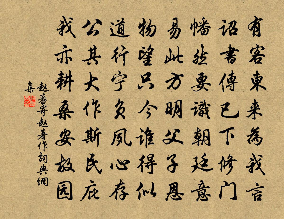 詩詞名句歷史字典書法欣賞書法字典國語詞典說文解字康熙字典古漢語字典標 題 作 者 詩 句 寄趙著作作者:趙蕃 朝代:宋代寄趙著作原文有客東來為我言,詔書傳已下修門。幡然要識朝廷意,易此方明父子恩。物望只今誰得似,道行寧負夙心存。公其大作斯民庇,我亦耕桑安故園。詩詞問答問:寄趙著作的作者是誰?答:趙蕃問:寄趙著作寫於哪個朝代?答:宋代趙蕃寄趙著作書法欣賞寄趙著作書法作品詩詞推薦宴別幼遐與君貺兄弟韋應物〔唐代〕乖闕意方弭,安知忽來翔。累日重歡宴,一旦復離傷。置酒慰茲夕,秉燭坐華堂。契闊未及展,晨星出東方。征人送升道靖恭相公分司林寬〔唐代〕東風時不遇,果見致君難。海岳影猶動,鵾鵬勢未安。星沉關鎖冷,雞唱驛燈殘。誰似二賓客,門閒嵩洛寒。奉答原甫見過寵示之作歐陽修〔宋代〕不作流水聲,行將二十年。吾生少賤足憂患,憶昔有罪初南遷。飛帆洞庭入白浪,墮淚三峽聽流泉。援琴寫得入此贈別性老釋紹嵩〔宋代〕此老殊清健,情忘發興奇。異方驚會面,孤嶼共題詩。聚散千江月,參差萬里期。相看作離別,特地淚雙垂。送呂令防赴海門宰韓元吉〔宋代〕五斗由來豈療貧,尚應拄笏對秋雲。未嗟薄宦來還去,但覺頻年我送君。舍北水生思共賞,淮南米賤好相聞。白魚暑夜步月釋文珦〔宋代〕畏暑不復眠,空階踏涼月。冰輪了無翳,明可數毛髮。夜久肝肺清,如嚥太古雪。擬換飛人,乘鸞上寥泬。贈韓協律朱慶餘〔唐代〕永日微吟在竹前,骨清唯愛漱寒泉。門閒多有投文客,身病長無買藥錢。嶺寺聽猿頻獨宿,湖亭避宴動經年。親知次韻定慧欽長老見寄八首蘇軾〔宋代〕少壯欲及物,老閒余此心。微生山海間,坐受瘴霧侵。可憐鄧道士,攝衣問呻吟。覆舟卻私渡,斷橋費千金。有所嗟吳龍翰〔宋代〕乘鸞人去玉簫寒,雲斂巫山曉夢殘。柳線不堪擊離別,自和煙雨搭闌乾。和石昌言學士官舍十題石榴花梅堯臣〔宋代〕春花開盡見深紅,夏葉始繁明淺綠。只知結子熟秋霖,不識來時有筇竹。對竹黃庚〔宋代〕門對南鄰竹,青青玉萬竿。雖然無地種,且得隔籬看。露葉晴猶濕,風枝夏亦寒。但教休剪伐,日用報平安。柳初新晁端禮〔宋代〕些兒柄把天來大。悶損也、還知麽。共伊合下、深盟厚約,比望收因結果。這好事、難成易破。到如今、彼此無那客自邵武來言王野使君平寇戴復古〔宋代〕太守自監軍,片膽大如身。立馬斬數賊,犒軍捐萬緡。威行千里外,手活一城民。孰謂書生怯,書生中有人。奉酬魯望見答魚箋之什皮日休〔唐代〕輕如隱起膩如飴,除卻鮫工解制稀。欲寫恐成河伯詔,試裁疑是水仙衣。毫端白獺脂猶濕,指下冰蠶子欲飛。若用弄水亭陳舜俞〔宋代〕未識貴池好,嘗聞弄水名。白鳥鑒中立,畫船天上行。水調歌頭李訦〔宋代〕足跡半天下,家說在瓊州。往來無定,蓬頭垢面任憎嫌。揮掃筆頭萬字,貫穿胸中千古,不記受生年。海角一相遇戊子歲晚贈應德茂戴表元〔宋代〕江海悠悠雪欲飛,抱書空出又空歸。沙頭竟成誰計是,山林又悔一年非。平生萬卷應夫子,兩世知名窮布衣。還汪正夫山陽小集鄭獬〔宋代〕汪子文章何偉奇,如觀天子乘輿儀。怛然暴見殊驚疑,舌拄上齶兩目痴。定神屏氣試引窺,漸識羽衛行相隨。金吾光上座廊下眾山五韻李頎〔唐代〕名岳在廡下,吾師居一床。每聞楞伽經,只對清翠光。百穀聚雪色,莓苔侵屋樑。氣盤古壁轉,勢引幽階長。願游贈端師李覯〔宋代〕十載寓都城,人傳善相名。一言知禍福,相識盡公卿。洪井舊鄉路,紫衣歸計榮。塵緣應漸了,何日悟無生。名句推薦只在此山中,雲深不知處。賈島《尋隱者不遇 / 孫革訪羊尊師詩》 望廬思其人,入室想所歷。潘安《悼亡詩三首》 清愁滿眼共誰論。卻應台下草,不解憶王孫。李之儀《臨江仙·登凌歊台感懷》 沙岸菊開花,霜枝果垂實。崔元翰《奉和聖制重陽旦日百寮曲江宴示懷》 眾里尋他千百度,驀然回首,那人卻在,燈火闌珊處。辛棄疾《青玉案·元夕》 紙上得來終覺淺,絕知此事要躬行。陸游《冬夜讀書示子聿》 雨落不上天,水覆難再收。李白《妾薄命》 疑行無成,疑事無功。商鞅《商君書·更法》 清晨入古寺,初日照高林。常建《題破山寺後禪院》 帆影依依楓葉外,灘聲汩汩碓床間查慎行《雨過桐廬》