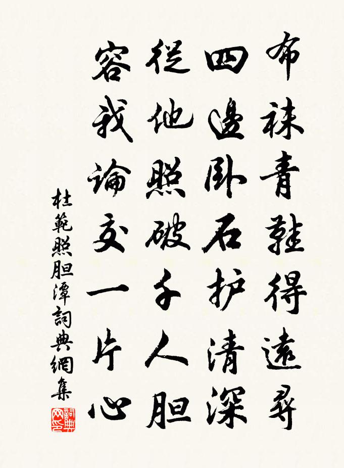 詩詞名句歷史字典書法欣賞書法字典國語詞典說文解字康熙字典古漢語字典標 題 作 者 詩 句 照膽潭作者:杜范 朝代:宋代照膽潭原文布襪青鞋得遠尋,四邊臥石護清深。從他照破千人膽,容我論交一片心。詩詞問答問:照膽潭的作者是誰?答:杜范問:照膽潭寫於哪個朝代?答:宋代杜范照膽潭書法欣賞照膽潭書法作品詩詞推薦題兒泌所藏彩箋陳著〔宋代〕山一抹於天之末兮,彌隱隱而彌妍。松矯矯龍其脊兮,颯張髯而自全。有美一人兮,橋之外水之邊。意其悠然有見驀山溪(饒沈公雅移漕江東)管鑒〔宋代〕潛藩報政,玉座勤深眷。假節上青霄,正霜風、輕寒翦翦。天香懷袖,凝燕得從容,占喜色,送新聲,瀲灩金荷滿贈徐處士趙蕃〔宋代〕南朝文士數徐陵,騎省流風篆法存。翰墨了知無異道,丹青今復見諸孫。規模要自胸中具,繩尺嫌於筆下論。太息寄青原山常不輕趙蕃〔宋代〕吾舅每談方外友,吃吃醉吟長在口。李侯佳句往往有,示我不輕詩數首。江湖願見非一日,豈有聞名不相識。路頭寄懶庵劉子翬〔宋代〕山暝雨連夕,今晨天氣清。遙懷懶庵人,高臥掩柴荊。幽寂性所嗜,蕭然寄平生。惟應田叟來,對床話躬耕。臨江仙盧祖皋〔宋代〕六鶴飛來松帳曉,菊遲梅早年光。西池移宴到萱堂。笙簫清弄玉,環佩暖回香。未問誥花金五色,新來樂事難量。艷歌行曹植〔魏晉〕夏節純和天清涼。百草滋殖舒蘭芳。十二峰登龍閻伯敏〔宋代〕散而成章合為龍,迴風混事游鴻濛。舟人上下神女供,俗妝鉛粉胭脂紅。上陳文惠楊朴〔宋代〕昨夜西風爛漫秋,今朝東岸獨垂鉤。紫袍不識衰衣客,曾對君王十二旒。員嶠先生徐凝〔唐代〕員嶠先生無白髮,海煙深處采青芝。逢人借問陶唐主,欲進冰蠶五色絲。訴衷情(二之二)賀鑄〔宋代〕半銷檀粉睡痕新。背鏡照櫻唇。臨風再歌團扇,深意屬何人。輕調笑,淺凝顰。認情親。最難堪酒,似不勝情,依韜光庵周弼〔宋代〕谷鳥與我言,怨殺白太傳。借問何以然,攜卻山僧去。山僧未去時,前盤一尾蛇,後踞一頭虎,吸雲嘯風繞窗戶。重送舒公蘇頲〔唐代〕散騎金貂服彩衣,松花水上逐春歸。懸知邑里遙相望,事主榮親代所稀。自題畫扇張舜民〔宋代〕忽忽南遷不記年,二妃祠外橘洲前。眼昏筆戰誰能畫,無奈霜紈似月圓。緣識宋太宗〔宋代〕仰望秋天色,月華露濕衣。傳更方興罷,螢繞御階飛。秋暑楊萬里〔宋代〕夏暑減未曾,秋暑增愈劇。老翁避無處,茅齋聊憩息。銀盆滿注水,銀水同一色。中涵雙桂影,倒臥一天碧。清光題方丈翁合〔宋代〕武夷奇絕處,水碧更山丹。觀闢南唐址,祠仍西漢壇。山禽酣午夢,野菜健晨餐。道士江沖一,新詩有集刊。古態陸龜蒙〔唐代〕古態日漸薄,新妝心更勞。城中皆一尺,非妾髻鬟高。南劍鹿鳴陳宓〔宋代〕嘉賓卅七燕公堂,吾道方亨值一陽。學力早知深孔孟,鄉風端可繼陳楊。雲霄九萬朝天闕,禮樂三千染御香。老守和田仲宣見贈蘇軾〔宋代〕頭白江南醉司馬,寬心時復喚殷兄。寒潮不應淮無信,客路相隨月有情。未許低頭拜東野,徒言共飲勝公榮。好詩名句推薦春水滿四澤,夏雲多奇峰。陶淵明《四時》 一庭春色惱人來,滿地落花紅幾片。魏承班《玉樓春·寂寂畫堂樑上燕》 人之愛子,罕亦能均;自古及今,此弊多矣。顏之推《顏氏家訓·教子篇》 誠既勇兮又以武,終剛強兮不可凌。屈原《國殤》 紅橋路,正一派、畫船蕭鼓中流住。納蘭性德《摸魚兒·午日雨眺》 別有根芽,不是人間富貴花。納蘭性德《採桑子·塞上詠雪花》 雁聲遠過瀟湘去,十二樓中月自明。溫庭筠《瑤瑟怨》 盡人事以聽天命。李汝珍《鏡花緣·第六回》 冰雪林中著此身,不同桃李混芳塵;王冕《白梅》 仁之實,事親是也;義之實,從兄是也。孟子《孟子·離婁章句上·第二十七節》
