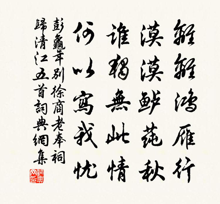 詩詞名句歷史字典書法欣賞書法字典國語詞典說文解字康熙字典古漢語字典標 題 作 者 詩 句 別徐商老奉祠歸清江五首作者:彭龜年 朝代:宋代別徐商老奉祠歸清江五首原文離離鴻雁行,漠漠鱸蓴秋。誰獨無此情,何以寫我憂。詩詞問答問:別徐商老奉祠歸清江五首的作者是誰?答:彭龜年問:別徐商老奉祠歸清江五首寫於哪個朝代?答:宋代彭龜年別徐商老奉祠歸清江五首書法欣賞別徐商老奉祠歸清江五首書法作品詩詞推薦讀史汪元量〔宋代〕餓死首陽二子,偷生商嶺四翁。劉項稱王稱霸,關張無命無功。和中道伏日次韻梅堯臣〔宋代〕伏日每苦熱,古來亡事侵。嘗聞東方朔,割肉趨庭陰。百職當早罷,將畏赫日臨。我無歸遺人,懷念空沾襟。莊居野行姚合〔唐代〕客行野田間,比屋皆閉戶。借問屋中人,盡去作商賈。官家不稅商,稅農服作苦。居人盡東西,道路侵壟畝。采玉早春十絕呈石湖陳造〔宋代〕未須看竹扣人門,且復尋梅過水村。香片點衣歸馬健,臨風只博斷吟魂。句錢世雄〔宋代〕黃泥坂西春欲回,雪堂萬木連雲栽。有懷十首劉子翬〔宋代〕松底柴門盡日關,主人西去幾時還。長鑱委地黃精老,時有寒猿嘯硯山。觀南郊回仗佚名〔唐代〕傳警千門寂,南效彩仗回。但驚龍再見,誰識日雙開。德澤施雲雨,恩光變燼灰。閱兵貔武振,聽樂鳳凰來。候刻月谷葉適〔宋代〕昔從東萊呂太史,秋夜共住明招山。正見谷中孤月出,倒影挼碎長林間。憑師記此無盡意,滿掃一方相併閒。席上有舉東坡集歸去來字詩十首醉中戲續一首宋伯仁〔宋代〕傲世欲何求,歸來已倦遊。琴詩聊自嘯,丘壑復相留。問菊時攜酒,乘風或棹舟。樂天良有以,心事老田疇。九張機佚名〔宋代〕一張機。織梭光景去如飛。蘭房夜永愁無寐。嘔嘔軋軋,織成春恨,留著待郎歸。送張瑤貶五谿尉高適〔唐代〕他日維楨幹,明時懸鏌鋣。江山遙去國,妻子獨還家。離別無嫌遠,沉浮勿強嗟。南登有詞賦,知爾吊長沙。戲洪丞鄧肅〔宋代〕萬里歸來雲水鄉,逢春得酒且彷徨。好賢誰似雙松吏,使我時終一石狂。忽與高唐來鼠目,卻令朱戶鎖梅妝。先生定風波(題續宅江樓)曾覿〔宋代〕極目秋光夕照開。潮頭初自海門來。杳杳江天橫一線。如練。疾驅千騎鼓聲催。傑檻翠飛爭徙倚。一行新雁去仍回南歌子(次東坡端午韻)楊無咎〔宋代〕小雨疏疏過,長江滾滾流。落霞殘照晚明樓。又是一番重午,身寄南州。羅綺紛香陌,魚龍漾彩舟。不堪回首鳳池立夏前王日出郊送春王邁〔宋代〕前回馬首絡青春,春我相逢皆故人。今朝出門忽失笑,春如五日之京兆。鶯痴蝶騃不知愁,惟有杜鵑啼到曉。春到太師菊凌雲屋〔宋代〕清白冠他三少貴,孤高獨占九秋寒。功成勇退東籬下,不逐春紅相牡丹。香師{肪月換肩}鈴賈似道〔宋代〕香師紅頭共{肪月換肩}鈴,只好三番兩次贏。卸卻紅鈴難保久,總然贏得也無情。贈闕下裴舍人錢起〔唐代〕二月黃鸝飛上林,春城紫禁曉陰陽。長樂鐘聲花外盡,龍池柳色雨中深。陽和不散窮途恨,霄漢長懷捧日心。獻賦三吳漫遊集唐方鳳〔宋代〕洞庭西望楚江分,回首姑蘇是白雲。今日南湖採薇蕨,何時重謁聖明君。送沖公謁六祖道場汪應辰〔宋代〕直指嶺頭路,寧論幾日回。尋春有訊息,寄我一枝梅。名句推薦莫辭酒味薄,黍地無人耕。杜甫《羌村三首·其三》 花落花開自有時,總賴東君主。嚴蕊《卜運算元·不是愛風塵》 歸夢寄吳檣。水驛江程去路長。陸游《南鄉子·歸夢寄吳檣》 喧鳥覆春洲,雜英滿芳甸。謝朓《晚登三山還望京邑》 雲開遠見漢陽城,猶是孤帆一日程。盧綸《晚次鄂州》 江水浸雲影,鴻雁欲南飛。朱熹《水調歌頭·隱括杜牧之齊山詩》 得失一朝,而榮辱千載。范曄《後漢書·列傳·荀韓鐘陳列傳》 常恐秋風早,飄零君不知。盧照鄰《曲池荷》 冉冉年時暮,迢迢天路征。陸機《梁甫吟》 愛人者必見愛也,而惡人者必見惡也。墨子《墨子·16章 兼愛(下)》