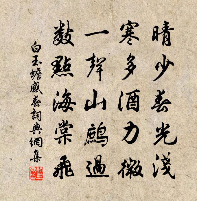 詩詞名句歷史字典書法欣賞書法字典國語詞典說文解字康熙字典古漢語字典標 題 作 者 詩 句 感春作者:白玉蟾 朝代:宋代感春原文晴少春光淺,寒多酒力微。一聲山鷓過,數點海棠飛。詩詞問答問:感春的作者是誰?答:白玉蟾問:感春寫於哪個朝代?答:宋代問:感春是什麼體裁?答:五絕白玉蟾感春書法欣賞感春書法作品詩詞推薦句宋白〔宋代〕回眸已覺三山近,滿壁潛驚五月寒。失調名王琪〔宋代〕金斗熨秋江。答仲章別後見寄韓維〔宋代〕會合非素期,追歡得同好。旅情忘郁約,春事入吟嘯。子行反崤鞏,我去旁嵩少。悵望洛陽花,金樽不同倒。代人上叔母張氏生辰三首仲並〔宋代〕憶昔觀光際,溫顏獲屢親。獎提煩叔父,駑蹇負前人。幸會逢今日,飄飄愧此身。捧觴陪子侄,深覺仲容貧。雜曲歌辭桃花行趙彥昭〔唐代〕紅萼競妍春苑曙,粉茸新向御筵開。長年願奉西王宴,近侍慚無東朔才。用東坡贈晁新城韻呈朱烏江王之道〔宋代〕偶然來賦瓦梁行,亂後欣聞醉客聲。村戍火明人指路,江城風靜夜鳴鉦。對床聽雨他時念,撥火喔詩此意清。聞說桂枝香張炎〔宋代〕甚,余歌美成詞。琴書半室。向桂邊偶然,一見秋色。老樹香遲,清露綴花疑滴。山翁翻笑如泥醉,笑生平、無此孟津歲晚十首宋庠〔宋代〕渥赭隨顏罷,飛霜入鬢新。夜壺寒展刻,冬晷急馳輪。名美誠堪徇,身閒我獨親。聊持一樽酒,不為畫蛇人。同餘汝霖游西湖觀天竺觀音永懷林和靖三絕胡寅〔宋代〕岩前晴日蔭樹,林下微風來蘭。臨水更無塵想。望雲時有遐觀。枕上鄭伯熊〔宋代〕飄風不崇朝,驟雨不終日。清寒入絺綌,御袷有餘郁。天時不能調,人事那可必。清燈耿孤窗,萬籟助飀飄。憂愁求信吟邵雍〔宋代〕始則求人信,有知有不知。既而求自信,人或多知之。今我不求信,何人更起疑。無可無不可,安往不熙熙。貴公子夜闌曲李賀〔唐代〕裊裊瀋水煙,烏啼夜闌景。曲沼芙蓉波,腰圍白玉冷。賀朱倅楊簡〔宋代〕舉杯話別幾時逢,此事分明鑑象中。到處風光無遠近,毋言易道有西東。輕輕衣濕梅坡雨,款款舟行柳岸風。忽憶霞韓琮〔唐代〕應是行雲未擬歸,變成春態媚晴暉。深如綺色斜分閣,碎似花光散滿衣。天際欲銷重慘澹,鏡中閒照正依稀。曉來對月六首白玉蟾〔宋代〕山似愁眉煙畫翠,月如醉眼暈生紅。鶴雛踏碎芙蓉影,酒思詩情渺碧空。句諶祜〔宋代〕風雨低黃鵠,江湖老白鷗。送鄒尊師歸洞庭楊夔〔唐代〕眾島在波心,曾居舊隱林。近聞飛檄急,轉憶臥雲深。賣藥唯供酒,歸舟只載琴。遙知明月夜,坐石自開襟。赤棗子游九言〔宋代〕河漢澈,碧霄晴。九華仙子到凡塵。涼夜山頭吹玉笛,纖雲卷盡月分明。泊舟山陽偶題晁補之〔宋代〕五歲淮山一夢新,扁舟曾系市橋春。津亭石磴雙垂柳,見我依依似故人。滄浪峽(一作儲嗣宗詩)儲光羲〔唐代〕滄浪臨古道,道上若成塵。自有滄浪峽,誰為無事人。名句推薦安能摧眉折腰事權貴,使我不得開心顏!李白《夢遊天姥吟留別 / 夢遊天姥山別東魯諸公》 禍福無門,唯人所召。左丘明《左傳·襄公·襄公二十三年》 若待明朝風雨過,人在天涯!春在天涯。虞集《南鄉一剪梅·招熊少府》 此夜曲中聞折柳,何人不起故園情。李白《春夜洛城聞笛 / 春夜洛陽城聞笛》 罪人或免人罪,難為亦為也。來俊臣《羅織經·問罪卷第十》 借問承恩者,雙蛾幾許長?皇甫冉《婕妤怨》 持斧伐遠揚,荷鋤覘泉脈。王維《春中田園作》 提出西方白帝驚,嗷嗷鬼母秋郊哭。李賀《春坊正字劍子歌》 世間珍果更無加,玉雪肌膚罩絳紗。丘浚《詠荔枝》 畫閣朱樓盡相望,紅桃綠柳垂檐向。王維《洛陽女兒行》