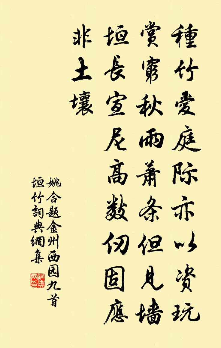詩詞名句歷史字典書法欣賞書法字典國語詞典說文解字康熙字典古漢語字典標 題 作 者 詩 句 題金州西園九首垣竹作者:姚合 朝代:唐代題金州西園九首垣竹原文種竹愛庭際,亦以資玩賞。窮秋雨蕭條,但見牆垣長。宣尼高數仞,固應非土壤。詩詞問答問:題金州西園九首垣竹的作者是誰?答:姚合問:題金州西園九首垣竹寫於哪個朝代?答:唐代姚合題金州西園九首垣竹書法欣賞題金州西園九首垣竹書法作品注釋全唐詩:卷499-7詩詞推薦續夢洪咨夔〔宋代〕造化有真機,寒暑不停軸。秋風促絡緯,春雨鳴播谷。一氣臂屈伸,萬事手翻覆。得牛或貽災,失馬詎非福。七侯秋晚矣菊猶未開小詩速之虞儔〔宋代〕問訊東籬菊,如今開未開。不應辜酒伴,寧是欠詩催。屈指秋將盡,關心日幾回。霜風不相借,何意尚徘徊。次韻蘇必強見寄李新〔宋代〕不積暗室鬼揶揄,曾入魚鳧伴蠹書。分背雁音清漢遠,動簾風竹故人疏。小桃煙老三年樹,白馬原空百兩車。消去雜詠一百首緹縈劉克莊〔宋代〕天子覽書悲,肉刑無復施。不惟嘉烈女,亦自活神醫。桃源李群玉〔唐代〕我到瞿真上升處,山川四望使人愁。紫雪白鶴去不返,唯有桃花溪水流。齊天樂(蟬)王沂孫〔宋代〕綠槐千樹西窗悄,厭厭晝眠驚起。飲露身輕,吟風翅薄,半翦冰箋誰寄。淒涼倦耳。漫重拂琴絲,怕尋冠珥。短夢醉落魄/一斛珠佚名〔宋代〕瓊搓粉滴。南枝只報江南坼。橫斜疏影溪邊窄。翦碎白雲,分付隴頭客。冰肌綽約疑姑射。鉛華消盡見真色。不隨聲聲慢(宏庵宴席,客有持桐子侑俎者,自雲其姬親剝之)吳文英〔宋代〕寒筲驚墜,香豆初收,銀床一夜霜深。亂瀉明珠,金盤來薦清斟。綠窗細剝檀皺,料水晶、微損春簪。風韻處,惹遠遊陸游〔宋代〕姓字不須通,從來號放翁。月明登暑雪,木落過秋風。處處題僧壁,時時臥釣篷。始知侯萬里,未必是英雄。鍾太君輓詩洪咨夔〔宋代〕護額錦裁帕,扶腰珠絡衣。幾回呼使進,盡日醉言歸。徑古梅成蔭,堂深桂合圍。重來無復拜,春色黯斜暉。已亥雜詩 10龔自珍〔清代〕進退雍容史上難,忽收古淚出長安。百年綦轍低徊遍,忍作空桑三宿看。和聖俞飲會之作韓維〔宋代〕幕府多俊良,乘間得邀命。陣觴四座合,清笑發高興。冰梨走鹹黽,霜橘薦穰鄧。餚羞愧無珍,粗竭我家稱。禮酬歸雁錢起〔唐代〕瀟湘何事等閒回,水碧沙明兩岸苔。二十五弦彈夜月,不勝清怨卻飛來。進雪詩徐鉉〔唐代〕欲使新正識有年,故飄輕絮伴春還。近看瓊樹籠銀闕,遠想瑤池帶玉關。潤逐麳麰鋪綠野,暖隨杯酒上朱顏。朝來苦熱釋智圓〔宋代〕平湖日炙沸如煮,庭樹色乾鳥渴死。何人萬里驅徵車,紅塵漲天方入市。村居書事四首劉克莊〔宋代〕有客相逢說坎離,葫蘆中藥不容窺。扣頭無力營丹灶,聊奉先生一醉資。洛下送張曼容赴上黨召杜牧〔唐代〕歌闋樽殘恨卻偏,憑君不用設離筵。未趨雉尾隨元老,且驀羊腸過少年。七葉漢貂真密近,一枝詵桂亦徒然。羽書醉後憶山中故人(一作故人山中)王建〔唐代〕花開草復秋,雲水自悠悠。因醉暫無事,在山難免愁。遇晴須看月,斗健且登樓。暗想山中伴,如今盡白頭。蟄龍潭張沃〔宋代〕蟄龍潭裡蟄,潭上風波急。一旦飛上天,魚暇不能及。郡樓望嵩少作宋庠〔宋代〕曠盪三河闊,東西二室連。埋雲峰樹短,抱日嶺霞鮮。黛壓周南野,嵐薰鞏右天。崢嶸元氣外,磅礴太虛前。斜麓名句推薦玉骨那愁瘴霧,冰姿自有仙風。蘇軾《西江月·梅花》 乍咽涼柯,還移暗葉,重把離愁深訴王沂孫《齊天樂·蟬》 長因送人處,憶得別家時張籍《薊北旅思/送遠人》 石溪久住思端午,館驛樓前看發機。盧肇《競渡詩 / 及第後江寧觀競渡寄袁州剌史成應元》 塞下秋來風景異,衡陽雁去無留意。范仲淹《漁家傲·秋思》 山中何所有,嶺上多白雲。陶弘景《詔問山中何所有賦詩以答》 守真志滿,逐物意移。周興嗣《千字文·全文》 石卵不敵。蛇龍不鬥。馮夢龍《警世通言·卷九》 縱被春風吹作雪,絕勝南陌碾成塵。王安石《北陂杏花》 日暮征帆何處泊,天涯一望斷人腸。孟浩然《送杜十四之江南 / 送杜晃進士之東吳》