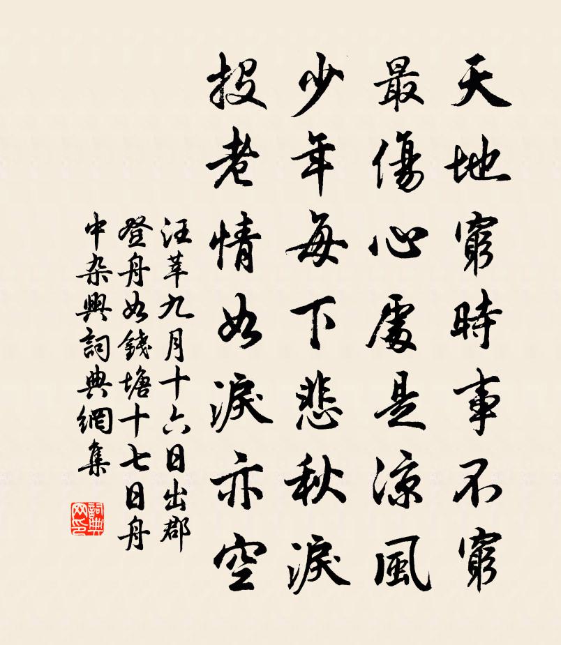詩詞名句歷史字典書法欣賞書法字典國語詞典說文解字康熙字典古漢語字典標 題 作 者 詩 句 九月十六日出郡登舟如錢塘十七日舟中雜興作者:汪莘 朝代:宋代原文天地窮時事不窮,最傷心處是涼風。少年每下悲秋淚,投老情如淚亦空。詩詞問答問:《九月十六日出郡登舟如錢塘十七日舟中雜興》的作者是誰?答:汪莘問:該詩寫於哪個朝代?答:宋代書法欣賞九月十六日出郡登舟如錢塘十七日舟中雜興書法作品詩詞推薦送陸協律赴端州賈至〔唐代〕越井人南去,湘川水北流。江邊數杯酒,海內一孤舟。嶺嶠同仙客,京華即舊遊。春心將別恨,萬里共悠悠。嚴子文用范至能韻見贈再和崔敦禮〔宋代〕燈花昨夜喜,詩成果符吉。長跪讀新詩,繡筵鳴寶瑟。天公怪多取,未老雪滿櫛。出門會臞仙,戴笠卓午日。我無沁園春戴復古〔宋代〕一曲狂歌,有百餘言,說盡一生。費十年燈火,讀書讀史,四方奔走,求利求名。蹭蹬歸來,閉門獨坐,贏得窮吟潤州釋仲殊〔宋代〕北固樓前一笛風,斷雲飛出建昌宮。江南二月多芳草,春在濛濛細雨中。小重山(數椽甫葺,知府載酒寵臨,輒次日近環湖所賦韻為一杯壽)李壁〔宋代〕燕雀風輕二月天。一枝何處是家園。有花不惜是誰憐。生嫌怕,不為老人妍。眉黛擁連娟。高情時載酒、雁湖邊。和王景彝詠薜荔梅堯臣〔宋代〕植物有薜荔,足物有蜥蜴。固知不同類,亦各善緣壁。根隨枝蔓生,葉侵苔蘚碧。後凋雖可嘉,勁挺異松柏。遠去親側浩然歸心再用韻李石〔宋代〕指點西來海上峰,此間魑魅我能逢。果何所補身先老,豈不懷歸意已濃。騏驥群中憐短褐,龍蛇窟里倚長松。一堂自嘆二首舒邦佐〔宋代〕怡顏今得盼庭柯,黃鳥啼邊綠蔭多。回嘆此生肝肺涸,只因雕篆損天和。雜劇·宋太祖龍虎風雲會羅貫中〔元代〕楔子(石守信引王全斌、潘美及二小卒俱戎裝上,詩云)親統貔貅百萬兵,兜鍪日日侍承明。朝梁暮晉何時了,定古芳林苑馬之純〔宋代〕昔日曾為府署來,誰人都把插桃栽。不聞華屋笙簫響,但見工林錦繡堆。幾度劉郎來觀里,半年阮客住天台。如今送禮部潘尚書致仕還建安徐鉉〔唐代〕名遂功成累復輕,鱸魚因起舊鄉情。履聲初下金華省,帆影看離石首城。化劍津頭尋故老,同亭會上問仙卿。冥鴻贈疊山先生毛直方〔宋代〕一襟書傳日星懸,湖海聲名五十年。事不求知惟此理,文之未喪豈皆天。人方驚怪歐陽子,我獨悲傷魯仲連。看鏡雷杜甫〔唐代〕大旱山嶽燋,密雲復無雨。南方瘴癘地,罹此農事苦。封內必舞雩,峽中喧擊鼓。真龍竟寂寞,土梗空俯僂。吁嗟奉和晉公侍中蒙除留守行及洛師感悅發中斐然白居易〔唐代〕鸞鳳翱翔在寥廓,貂蟬瀟灑出埃塵。致成堯舜昇平代,收得夔龍強健身。拋擲功名還史冊,分張歡樂與交親。商山聞蛙黃庶〔宋代〕佞舌兒女柔,異教蜩螗喧。豈能聽蛙黽,靜枕詩書眠。題寒碧亭郭印〔宋代〕炯炯練千尺,蒼蒼玉萬個。客來魂一清,四顧不敢唾。【仙呂】醉扶歸_一點芳心碎佚名〔元代〕一點芳心碎,兩葉翠眉低。薄倖檀郎尚未歸,應是平康醉。不來也奴更候些,直等燭滅香消睡。 錦瑟香塵昧,糖多令(登淮安倚天樓)王奕〔宋代〕直上倚天樓。懷哉古楚州。黃河水、依舊東流。千古興亡多少事,分付與、白頭鷗。祖逖與留侯。二公今在不。眉和孔周翰二絕 觀淨觀堂效韋蘇州詩蘇軾〔宋代〕弱羽巢林在一枝,幽人蝸舍兩相宜。樂天長短三千首,卻愛韋郎五字詩。句楊子方〔宋代〕頻看召客趨金馬,再見豐年出石魚。名句推薦秋霜欲下手先知,燈底裁縫剪刀冷。白居易《空閨怨》 當時明月在,曾照彩雲歸。晏幾道《臨江仙·夢後樓台高鎖》 即從巴峽穿巫峽,便下襄陽向洛陽。杜甫《聞官軍收河南河北》 孤帆遠影碧空盡,唯見長江天際流。李白《黃鶴樓送孟浩然之廣陵》 兩刃相割,利鈍乃知;二論相訂,是非乃見。王充《論衡·卷二十九·案書篇》 深知身在情長在,悵望江頭江水聲。李商隱《暮秋獨游曲江》 秋風吹地百草乾,華容碧影生晚寒。李賀《開愁歌》 胡瓶落膊紫薄汗,碎葉城西秋月團。王昌齡《從軍行七首》 今夜不知何處宿,平沙萬里絕人煙。岑參《磧中作》 寧教我負天下人,休教天下人負我。羅貫中《三國演義·第四回》
