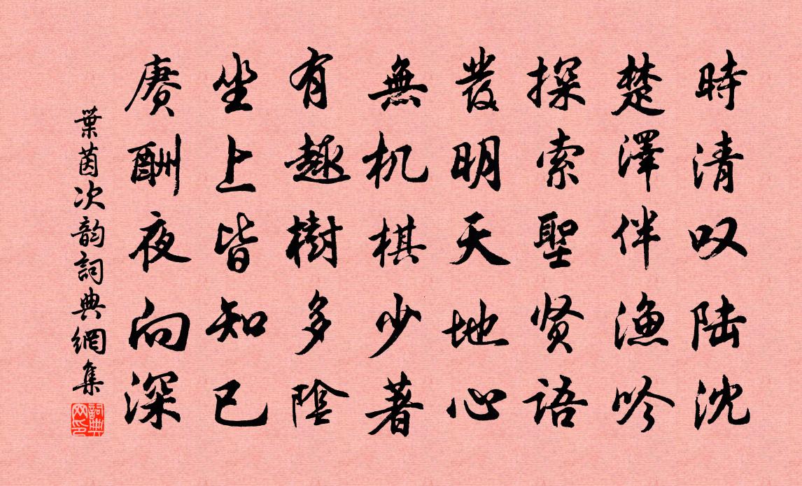 詩詞名句歷史字典書法欣賞書法字典國語詞典說文解字康熙字典古漢語字典標 題 作 者 詩 句 次韻作者:葉茵 朝代:宋代次韻原文時清嘆陸沈,楚澤伴漁吟。探索聖賢語,發明天地心。無機棋少著,有趣樹多陰。坐上皆知已,賡酬夜向深。詩詞問答問:次韻的作者是誰?答:葉茵問:次韻寫於哪個朝代?答:宋代葉茵次韻書法欣賞次韻書法作品詩詞推薦挽梁元功曾幾〔宋代〕朋儔大半白頭新,臭味同流少似君。交契雖深淡如水,宦情何翅薄於雲。安知暮景鶯聲谷,遽作高原馬鬣墳。忍向送觀禪客釋道生〔宋代〕西淛江邊話別時,斷頭船子疾如飛。白拈手裡分贓去,臨濟休夸小廝兒。和崔若拙四時田家詞四首之二賀鑄〔宋代〕野蔓牽花過短牆,麥秋時節並蠶忙。迎門老父延行客,井汲清甘樹蔭涼。玩溪沙 飲刀圭王吉昌〔元代〕離坎升沉氣不迷。天門減息飲刀圭。月宮飛出日中雞。東北朋生調玉兔,兩情和氣吐虹霓。烹成火棗玉童攜。喜劉寶學彥修得歸因敘初時悽愴之意十首張嵲〔宋代〕聊城欲下樂生去,宣室厘成賈傳歸。來往炎荒六千里,歸來卻得及春菲。送勉華嚴見本師釋紹曇〔宋代〕秦望山前撞老爺,一拳打得鼻頭喎。衲僧氣息都忘了,無復尋香嗅雜華。浣溪沙·誰道飄零不可憐納蘭性德〔清代〕誰道飄零不可憐,舊遊時節好花天,斷腸人去自經年。一片暈紅才著雨,幾絲柔綠乍和煙。倩魂銷盡夕陽前。上鄧憲生辰楊簡〔宋代〕乃眷西顧,金節異之。禮樂光華,亦王近畿。和張王臣郊遊韻三首廖行之〔宋代〕秀句清圓掩百家,錦心幽思定餐霞。鳳騷誰敢闚嚴律,誦數惟應滿洛叉。已有文名肩杜曲,卻憐覉旅賦彭衙。自嗟早行杜牧〔唐代〕垂鞭信馬行,數里未雞鳴。林下帶殘夢,葉飛時忽驚。霜凝孤鶴迥,月曉遠山橫。僮僕休辭險,時平路復平。雜興十首劉克莊〔宋代〕諸公袞袞一番新,留得山林著放臣。鞍破馬移它廄去,巢空燕覺主家貧。甥陪棋局何須客,兒舉籃輿不覓人。膜外減字木蘭花佚名〔宋代〕庭梅初綻。風遞幽香清更遠。別有孤根。不待陽和一點恩。雪中風韻。皓質冰姿真瑩靜。月下精神。來到窗前疑是讀何斯舉黃州秋居雜詠次其韻陸游〔宋代〕造請非所長,一帶每嬾束;揖客雖小殊,亦未勝僕僕。正須駕柴車,歸藝東籬菊,故山甘水泉,群飲友麋鹿。百年上竺真辯師趙企〔宋代〕一別支公僅兩年,山房高隱尚恬然。心清已澈靈泉奧,行峻應磨峭壁堅。俗眼不來青障里,孤峰誰認白雲邊。更期漁家傲晏殊〔宋代〕宿蕊斗攢金粉鬧。青房暗結蜂兒小。斂面似啼開似笑。天與貌。人間不是鉛華少。葉軟香清無限好。風頭日腳乾催夜緒宋祁〔宋代〕炎氛歇層宇,清氣肅重帷。籟遠天人雜,宵閒甲乙遲。江湖牽客慮,日月與人衰。經國謀安在,悠悠空我思。題橫山寺宋祁〔宋代〕碧山千疊隱招提,淨剎岧亭拂彩蜺。月澗溜琴喧菌閣,雨天雲葉晦璇題。寒銷爐篆螟風細,密亞岩煙鳳竹低。病久浣溪沙(漫興作)辛棄疾〔宋代〕未到山前騎馬回。風吹雨打已無梅。共誰消遣兩三杯。一似舊時春意思,百無是處老形骸。也曾頭上帶花來。池上看金沙花數枝過酴醾架盛開王安石〔宋代〕故作酴醾架,金沙只謾栽。似矜顏色好,飛度雪前開。南湖行二首曾鞏〔宋代〕二月南湖春雨多,春風蕩漾吹湖波。著紅少年裡中出,百金市上裁輕羅。插花步步行看影,手中掉旅唱吳歌。放船名句推薦孤飛一片雪,百里見秋毫。李白《觀放白鷹二首》 冬夜兮陶陶,雨雪兮冥冥。王逸《九思》 都緣自有離恨,故畫作遠山長。歐陽修《訴衷情·眉意》 山遠天高煙水寒,相思楓葉丹。李煜《長相思·一重山》 尿泡雖大無斤兩,秤鉈雖小壓千斤。吳承恩《西遊記·第三十一回》 金陵津渡小山樓,一宿行人自可愁。張祜《題金陵渡》 曲岸持觴,垂楊系馬,此地曾經別。辛棄疾《念奴嬌·書東流村壁》 危橋屬幽徑,繚繞穿疏林。柳宗元《巽公院五詠·苦竹橋》 母別子,子別母,白日無光哭聲苦。白居易《母別子》 恨君卻似江樓月,暫滿還虧,暫滿還虧,待得團圓是幾時?呂本中《採桑子·恨君不似江樓月》