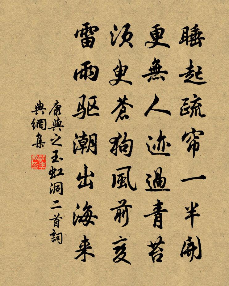 詩詞名句歷史字典書法欣賞書法字典國語詞典說文解字康熙字典古漢語字典標 題 作 者 詩 句 玉虹洞二首作者:康與之 朝代:宋代玉虹洞二首原文睡起疏簾一半開,更無人跡過青苔。須臾蒼狗風前變,雷雨驅潮出海來。詩詞問答問:玉虹洞二首的作者是誰?答:康與之問:玉虹洞二首寫於哪個朝代?答:宋代康與之玉虹洞二首書法欣賞玉虹洞二首書法作品詩詞推薦傷春俞處俊〔宋代〕黏天芳草綠蒙茸,久客傷心望不窮。山色自隨人遠近,鶯聲只在水西東。越州歌汪元量〔宋代〕師相平章誤我朝,千秋萬古恨難消。蕭牆禍起非今日,不賞軍功在斷橋!過金雞關文同〔宋代〕關頭氣象古,關下風煙淡。春深草木活,嵐重坑谷暗。禽聲著部奏,花色成窠勘。歸鞍雖若水,留此亦能暫。中{左山右尋}先塋劉克莊〔宋代〕昔遇重華席屢前,因排貴近去翩然。叩墀袖有馳球疏,易簀囊無沐槨錢。當日傳家惟諫草,至今贍族賴祠田。原頭題愚溪堂徐照〔宋代〕水流深見底,不是此溪愚。謫宦休嗟命,鄉人為讀書。文章傳海裔,屋室在州圖。儒者凡經此,須來看所居。用彥平韻賦石外舅短項翁耿鎡〔宋代〕人生何地逃奇耦,白髮轉頭成宿莽。百年同盡草一丘,誰見乘槎上牛斗。不如醉倒三萬場。何必龍山歲重九。先生郊廟歌辭。享太廟樂章。鈞天舞佚名〔唐代〕承天撫籙,纂聖登皇。遐清萬宇,仰協三光。功成日用,道濟時康。璇圖載永,寶曆斯昌。日月揚暉,煙雲爛色。周五聲調曲 變宮調 二庾信〔南北朝〕移風廣軒歷。崇德盛唐年。成文興大雅。出豫動鈞天。黃鐘六律正。閶闔八風宣。孤竹調陽管。空桑節雅弦。舞林和聶之美雞澤官舍詩七首向城路司馬光〔宋代〕村路煙欲暝,行人殊未稀。借問往來者,營營皆有為。乃知市朝客,趣務良可悲。其日雨聞姚黃開戲成詩二章呈子駿堯夫司馬光〔宋代〕小雨留春春未歸,好花雖有恐行稀。勸君披取漁蓑去,走看姚黃判濕衣。中秋扶病對月蘇泂〔宋代〕久病頭如石,中秋月似盆。起瞻惟一色,歸臥只空村。信有鄜州見,曾同秘省論。微吟到河漢,桂樹忽飛翻。再次韻十首陳造〔宋代〕重見發更白,羈棲偕在行。余嗟遽如許,子亦可憐生。不粒書新券,霜蔬煮破鐺。詩成莫浪出,或取世儒輕。次韻凌義山二首楊公遠〔宋代〕自憐老境漸侵尋,檢點頭顱雪旋深。無酒澆愁還獨嘯,有時得句但長吟。一天月色涵秋意,四壁蛩聲惱客心。好是江上李商隱〔唐代〕萬里風來地,清江北望樓。雲通梁苑路,月帶楚城秋。刺字從漫滅,歸途尚阻修。前程更煙水,吾道豈淹留。金剛隨機無盡頌福智無比分第二十四釋印肅〔宋代〕三千等大千,佛化進程言。恆河沙眾義,會底豈勞詮。南陔五章二章八句三章四句鄭剛中〔宋代〕陟彼南陔,其薰遠兮。慨我功名,今亦晚兮。功名這晚,尚可為也。嗟嗟吾親,不可追也。奉繼馮使君韻夏世雄〔宋代〕神物堅持多聖境,新詩開僻信賢能。磨崖永作山中景,讀處留行亦好僧。菩薩蠻(題山館)劉塤〔宋代〕長亭望斷來時路。樓台杳靄迷花霧。山雨隔窗聲。思君魂夢驚。淚痕侵褥錦。閒卻鴛鴦枕。有淚不須垂。金鞍明月藻侄比課五言詩,已有意趣,老懷甚喜,因吟范成大〔宋代〕牣鹿紛紜夢,亡羊散亂心。眵昏遮眼讀,愁苦捻髭吟。幸覺行迷遠,其如臥病深。通身都放下,何用覓砭針?玉樓春謝逸〔宋代〕箇中懷抱誰排遣。惻惻輕寒風剪剪。細絲梅蕊晚香濃,爭似柳梢春色淺。嬌叱道字歌聲軟。醉後微渦回笑魘。更無名句推薦敗葉填溪水已冰,夕陽猶照短長亭。納蘭性德《浣溪沙·敗葉填溪水已冰》 焉有君子而可以貨取乎?孟子《孟子·公孫丑章句下·第三節》 人生不相見,動如參與商。杜甫《贈衛八處士》 橫戈從百戰,直為銜恩甚。李白《塞下曲六首》 桃花潭水深千尺,不及汪倫送我情。李白《贈汪倫》 謾道愁須殢酒,酒未醒、愁已先回秦觀《滿庭芳·碧水驚秋》 世之道,人不自害而人害也;人之道,人不恕己而自恕也。來俊臣《羅織經·保身卷第七》 志以淡泊明,而節從肥甘喪矣。洪應明《菜根譚·概論》 知人既以為難,自知誠亦不易。吳兢《貞觀政要·卷三·論擇官》 為高必因丘陵,為下必因川澤。孟子《孟子·離婁章句上·第一節》