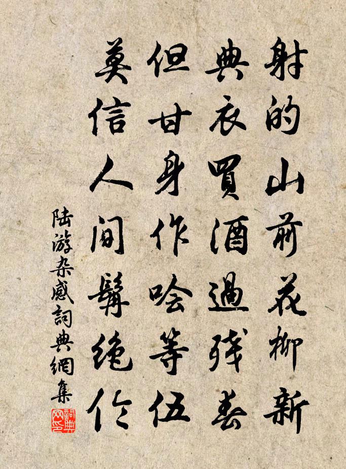 詩詞名句歷史字典書法欣賞書法字典國語詞典說文解字康熙字典古漢語字典標 題 作 者 詩 句 雜感作者:陸游 朝代:宋代雜感原文射的山前花柳新,典衣買酒過殘春。但甘身作噲等伍,莫信人間髯絕倫。詩詞問答問:雜感的作者是誰?答:陸游問:雜感寫於哪個朝代?答:宋代問:陸游的名句有哪些?答:陸游名句大全陸游雜感書法欣賞雜感書法作品詩詞推薦子昂秋林行客圖戴表元〔宋代〕石稜稜而白出,樹悄悄以紅披。嗟縞衣之嘉客,方策蹇以何之。出遊郊外七絕王炎〔宋代〕孤煙近見數椽屋,急水時行獨木橋。入眼異鄉風景別,修眉一抹暮山遙。秦門陳涉周曇〔唐代〕秦法煩苛霸業隳,一夫攘臂萬夫隨。王侯無種英雄志,燕雀喧喧安得知。元日胡仲弓〔宋代〕大書春帖當桃符,吟對窗前梅一株。湖海相逢無老少,莫分先後飽屠蘇。漢詔郡縣行鄉飲酒禮頌詩洪遵〔宋代〕爰勑方國,禮行於鄉。稽經諏律,屬民橫堂。贈舒亦山入越陳著〔宋代〕危世無山林,頹俗無門戶。彼美詩書身,悠然自為趣。揚揚飛霞佩,清風導前路。借問欲何之,謂我稽山去。秦風雨泊話舊沈德潛〔清代〕寒雨蕭蕭夜打蓬,蓬窗相對一燈紅。十年無限存亡感,併入空江話雨中。畫松徐夤〔唐代〕澗底陰森驗筆精,筆閒開展覺神清。曾當月照還無影,若許風吹合有聲。枝偃只應玄鶴識,根深且與茯苓生。天台滿庭芳(春壽太守)畢大節〔宋代〕玉筍就華,紫荷香潤,宴閒密侍西清。碧幢金節,仍尹鳳皇城。須信千齡慶遇,丹霄上、重疊恩榮。時多暇,湖山和武平學士歲晚禁直書懷五言二十韻歐陽修〔宋代〕多病淹殘歲,初寒臥直廬。朝廷務清靜,鈴索少文書。向學今為盛,優賢古莫如。靚深嚴禁署,閒宴樂群居。賜馬題武岡向敏衡無加莊王義山〔宋代〕恭惟陳簡齋,與鶴山魏公。堂堂二先生,後學之所宗。遺蹟所到處,百世猶高風。武岡有向氏,乃祖家詩禮。簡齋櫧洲道中范成大〔宋代〕煙凝山如影,雲褰日射毫。桃間紅樹迥,麥里綠叢高。客子嘆游倦,田家甘作勞。乘除吾尚可,未擬賦離騷。送吳守明先輩游蜀齊己〔唐代〕憑君游蜀去,細為話幽奇。喪亂嘉陵驛,塵埃賈島詩。未應過錦府,且合上峨嵋。既逐高科後,東西任所之。見道邊死人(一作劉元濟詩。《統簽》併入允濟詩內)劉允濟〔唐代〕淒涼徒見日,冥寞詎知年。魂兮不可問,應為直如弦。上鄧憲生辰楊簡〔宋代〕民飢毋恐,惠澤方涌。適兼郡符,民有天寵。清湘驛送王柳州南歸二絕范成大〔宋代〕我已兼程無腳力,君猶追路有襟期。從今月下共花下,誰復醉吟先和詩?寶應界中絕句三首孔武仲〔宋代〕倒景虞淵日,餘威澤國霞。宵行逐明月,水宿傍人家。生查子陳亞〔宋代〕小院雨餘涼,石竹風生砌。罷扇盡從容,半下紗廚睡。起來閒坐北亭中,滴盡真珠淚。為念婿辛勤,去折蟾宮桂。漢儒二首劉克莊〔宋代〕執戟浮沉亦未迂,無端著頌美新都。白頭所得能多少,枉被人書莽大夫。同伯潛諸公聯騎出城東南亞次衫字韻廖行之〔宋代〕怯曉征衣襲小衫,山頭淡月照聯驂。晴光忽散湘江上,秋色疑連夢澤南。後約吹香舒藻思,同游載酒款犀談。遙知名句推薦至鷺鷥林,則雪深泥滑,不得前矣。辛棄疾《賀新郎·把酒長亭說》 我愛山中春,蒼崖鳥一聲。元鵬《山中四詠》 試問閒愁都幾許?賀鑄《青玉案·凌波不過橫塘路》 長亭路,年去歲來,應折柔條過千尺。周邦彥《蘭陵王·柳》 短綆不可以汲深井之泉,知不幾者不可與及聖人之言。荀子《荀子·榮辱》 三山半落青天外,二水中分白鷺洲李白《登金陵鳳凰台》 死去元知萬事空,但悲不見九州同。陸游《示兒》 稻根科斗行如塊,田水今年一尺寬。范成大《夏日田園雜興》 見未真,勿輕言。知未的,勿輕傳。李毓秀《弟子規·信》 馬上逢寒食,愁中屬暮春。宋之問《途中寒食題黃梅臨江驛寄崔融》