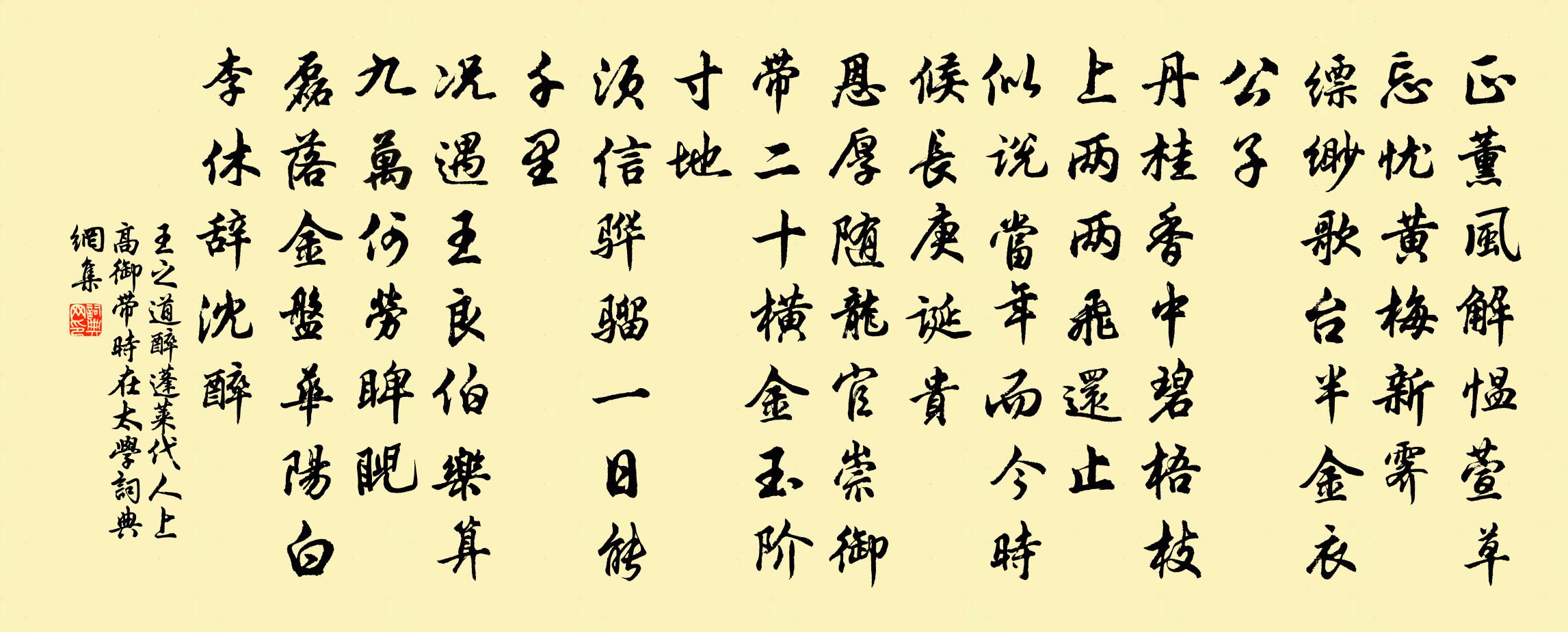 詩詞名句歷史字典書法欣賞書法字典國語詞典說文解字康熙字典古漢語字典標 題 作 者 詩 句 醉蓬萊(代人上高御帶,時在太學)作者:王之道 朝代:宋代原文正薰風解慍,萱草忘憂,黃梅新霽。縹緲歌台,半金衣公子。丹桂香中,碧梧枝上,兩兩飛還止。似說當年,而今時候,長庚誕貴。恩厚隨龍,官崇御帶,二十橫金,玉階寸地。須信驊騮,一日能千里。況遇王良伯樂,算九萬、何勞睥睨。磊落金盤,華陽白李,休辭沈醉。詩詞問答問:《醉蓬萊(代人上高御帶,時在太學)》的作者是誰?答:王之道問:該詩寫於哪個朝代?答:宋代問:該詩是什麼體裁?答:詞書法欣賞醉蓬萊(代人上高御帶,時在太學)書法作品詩詞推薦和李參政正旦聞邊報魏了翁〔宋代〕羽檄連旬月,邊塵換歲陰。捉弄衿憂見肘,補肉忍剜心。天遠鴻飛急,林疏燕恨深。直鈄歸往地,都作殺胡林。奉和過舊宅應制許敬宗〔唐代〕飛雲臨紫極,出震表青光。自爾家寰海,今茲返帝鄉。情深感代國,樂甚宴譙方。白水浮佳氣,黃星聚太常。岐鳳竹溪直院盛稱起予草堂詩之善暇日覽之多有可劉克莊〔宋代〕松柏無姿媚,平時未易看。要知渠特操,直待歲隆寒。塞草枯先白,江梘冷變丹。凜然友青士,至此識蒼官。物遁頌古三十一首釋玿〔宋代〕相逢打鼓弄琵琶,須是還他兩會家。曲罷不知何處去,夕陽斜映暮天霞。賀新郎佚名〔宋代〕路入藍橋境。憶當年、雲英來會,玄霜搗盡。爭似溫公風流婿,一笑歡傳玉鏡。便勝似、瓊漿玉飲。自是振振佳公題閩縣西湖陳康伯〔宋代〕鑿開百頃碧融融,潁上錢塘約略同。楊柳兩堤連綠蔭,芰荷十時馥香風。波涵翠巘層層出,潮接新河處處能。輿誦贈常州院僧姚合〔唐代〕一住毗陵寺,師應只信緣。院貧人施食,窗靜鳥窺禪。古磬聲難盡,秋燈色更鮮。仍聞開講日,湖上少魚船。和膳部李郎中秋夕姚合〔唐代〕淅淅復修修,涼風似水流。此生難免老,舉世大同愁。螢影明苔蘚,鴻聲傍鬥牛。猶分省署直,何日是歸休。同諸友城南張園賞梅十首邵雍〔宋代〕酒中漬後香猶烈,笛里吹來韻更清。此韻此香來處好,此時消得一凝情。唁人喪侍兒裴夷直〔唐代〕夜情河耿耿,春恨草綿綿。唯有嫦娥月,從今照墓田。懷古姜特立〔宋代〕古來一代文章事,自有風騷翰墨臣。今日蘇門四君子,異時鄴下七詩人。句楊蟠〔宋代〕動搖臘信隨征使,勾引春情出苑牆。和丁使君八詠樓姜特立〔宋代〕八詠詩成沈隱侯,樓中風月盡兼收。三千題里無新語,七百年間有勝流。領客登臨聊一快,舉杯相屬更無憂。令威寒暑陸游〔宋代〕寒暑侵陵日夜衰,坐令齒髮不支持。愛憎徇物去忘反,神氣養形誰復知?布帔九條晨入靜,柏床五尺夜精思。舊交夜集張諲所居劉希夷〔唐代〕江南成久客,門館日蕭條。惟有圖書在,多傷鬢髮凋。諸生陪講誦,稚子給漁樵。隱室寒燈淨,空階落葉飄。滄洲寧國院烏允卿〔宋代〕精舍蕭然絕世塵,登臨漸覺爽精神。庭連翠島松篁暗,沼接清流瀑布新。高潔白雲長作侶,幽間明月每為親。開窗有將獨鶴行都市道上者左右奔迫野態憔悴因成宋庠〔宋代〕明心本霄漢,此路極喧埃。何意鳴皋罷,翻同舞市來。波魚憂轍涸,海鳥避風災。寄語昂昂質,非君羽獨摧。水調歌頭陳德武〔宋代〕好是三春景,都在百花軒。美人眠不成夢,早已繡簾掀。分付海棠睡足,檢點牡丹開未,桃李寂無言。葉露聯珠絡梅花十絕答石塘二林劉克莊〔宋代〕東鄰安得如渠白,西域何曾有許香。蘇二聰明真道著,杏花恐不敢承當。雜興四首於石〔宋代〕四圍綠樹岩藏屋,一枕清風竹滿軒。醉里不知山雨過,醒來惟怪瀑聲喧。名句推薦不管煙波與風雨,載將離恨過江南。鄭文寶《柳枝詞》 知是人家花落盡,菜畦今日蝶來多。高啟《春暮西園》 見碧水丹山,黃蘆苦竹。宋江《滿江紅·喜遇重陽》 梨花淡白柳深青,柳絮飛時花滿城。蘇軾《東欄梨花》 上善若水,水善利萬物而不爭。老子《老子·道經·第八章》 野戰格鬥死,敗馬號鳴向天悲。李白《戰城南》 人有賢愚,任人勿求過己。來俊臣《羅織經·固榮卷第六》 美人贈我錦繡段,何以報之青玉案。張衡《四愁詩》 昨夜笙歌容易散,酒醒添得愁無限馮延巳《鵲踏枝·梅落繁枝千萬片》 人事有代謝,往來成古今。孟浩然《與諸子登峴山》