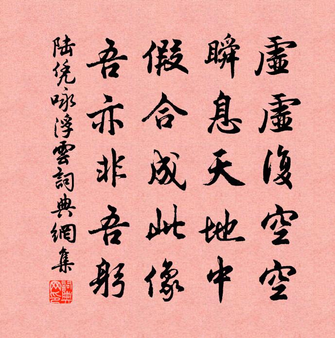 詩詞名句歷史字典書法欣賞書法字典國語詞典說文解字康熙字典古漢語字典標 題 作 者 詩 句 詠浮雲作者:陸憑 朝代:唐代詠浮雲原文虛虛復空空,瞬息天地中。假合成此像,吾亦非吾躬。詩詞問答問:詠浮雲的作者是誰?答:陸憑問:詠浮雲寫於哪個朝代?答:唐代問:詠浮雲是什麼體裁?答:五絕陸憑詠浮雲書法欣賞詠浮雲書法作品注釋全唐詩:卷865-11詩詞推薦秋日雜詠六首韓元吉〔宋代〕絕壁跨城樓,連天海氣浮。長空去鳥盡,落日斷雲留。鼓角深秋壯,山河薄暮愁。勞生知底所,倚杖寄滄洲。再次韻趙帥見寄三首陳造〔宋代〕枝撐強趁火城春,蹤跡猶煩問水濱。更醉南州好紅紫,凝香詩伯虹化神。偈頌一百二十三首釋崇岳〔宋代〕忽雨忽晴,天平地平。釋迦彌勒,打失眼睛。禪人請贊釋師範〔宋代〕僻性拗木枕,天生沒意智。自已獨冤家,佛祖閒奴婢。嘗聞一飽忘百飢,今日山僧身便是。甘瓜范成大〔宋代〕夏膚粗已皴,秋蒂熟將脫。不辭抱蔓歸,聊慰相如渴。顏市阻風二首陳師道〔宋代〕水到西流闊,風從北極來。聲驅峽口坼,力拔嶺根摧。突兀重重浪,轟豗處處雷。順流看過舫,更著快帆催。熙寧觀享明堂二首佚名〔宋代〕英聲邁古,德施在民。允秩宗祀,實延上神。離亂後寄九峰和尚二首貫休〔唐代〕亂後知深隱,庵應近石樓。異香因雪歇,仙果落池浮。詩老全拋格,心空未到頭。還應嫌笑我,世路獨悠悠。蕭灑緣識宋太宗〔宋代〕耳根清靜本來修,萬法從心不外求。海岳動搖山色異,玄珠盡在眼中收。持齋道士尋紅葉,醉臥仙人未白頭。麋鹿郊廟歌辭。祀風師樂章。送神包佶〔唐代〕微穆敷華能應節,飄揚發彩宜行慶。送迎靈駕神心享,跪拜靈壇禮容盛。氣和草木發萌芽,德暢禽魚遂翔泳。永望梵天寺房芝蘭〔宋代〕門前流水碧粼粼,禪定僧閒化復淳。攪夢半因詩作崇,破寒全藉酒生春。休教一切有為法,誤著三生自在身。拂袖疏山一覽亭曾幾〔宋代〕青雲梯盡得朱欄,不但令人六月寒。無限江南好山水,庵摩勒果掌中看。和左衛武倉曹衛中對雨創韻贈右衛李騎曹孫逖〔唐代〕林父同官意,宣尼久騎交。文場刊玉篆,武事掌金鐃。道合宜連茹,時清豈系匏。克勤居簿領,多暇屏讙譊。美酒浣溪沙(憶西湖)林淳〔宋代〕卻憶西湖爛漫遊。水涵山影翠光浮。輕舟短棹不驚鷗。帶露精神花嫵媚,依風情態柳溫柔。鶯歌燕語巧相留。芳草王安石〔宋代〕芳草知誰種,緣階已數叢。無心與時競,何苦綠匆匆。和敬岩韻迓其歸王柏〔宋代〕生涯魚上竿,世事鼠入角。民膏既煎熬,民髓復椎剝。上下急交征,絕口政與學。孔明痛桓靈,厥德修罔覺。自古句薛紹彭〔宋代〕暮煙秦樹暗,落日渭川明。掩篋戴表元〔宋代〕十客九不解,一解值吾仇。譬如巧蛾眉,同鏡見之羞。結交恨不廣,難在相綢謬。掩篋謝年少,所藏非所求。殿試覆考和子由侍郎范祖禹〔宋代〕十五年前宿殿廬,伊川一紀臥岩居。雕蟲尚憶長楊賦,汗簡猶殘太史書。日月當天瞻法座,煙霞落紙看華裾。品題題蕭郎中開元寺新構幽寂亭劉長卿〔唐代〕康樂愛山水,賞心千載同。結茅依翠微,伐木開蒙籠。孤峰倚青霄,一徑去不窮。候客石苔上,禮僧雲樹中。曠然名句推薦兩情若是久長時,又豈在朝朝暮暮。秦觀《鵲橋仙·纖雲弄巧》 蜀道之難,難於上青天!李白《蜀道難》 禹廟空山里,秋風落日斜。杜甫《禹廟》 人生百年有幾,念良辰美景,休放虛過。元好問《驟雨打新荷》 無可奈何花落去,似曾相識燕歸來。晏殊《浣溪沙·一曲新詞酒一杯》 昔我往矣,楊柳依依。佚名《採薇》 故人離別盡,淇上轉驂騑。王維《送魏郡李太守赴任》 一為遷客去長沙,西望長安不見家。李白《與史郎中欽聽黃鶴樓上吹笛 / 題北榭碑》 袨服華妝著處逢,六街燈火鬧兒童。元好問《京都元夕》 知莫大乎棄疑,行莫大乎無過,事莫大乎無悔。荀子《荀子·議兵》