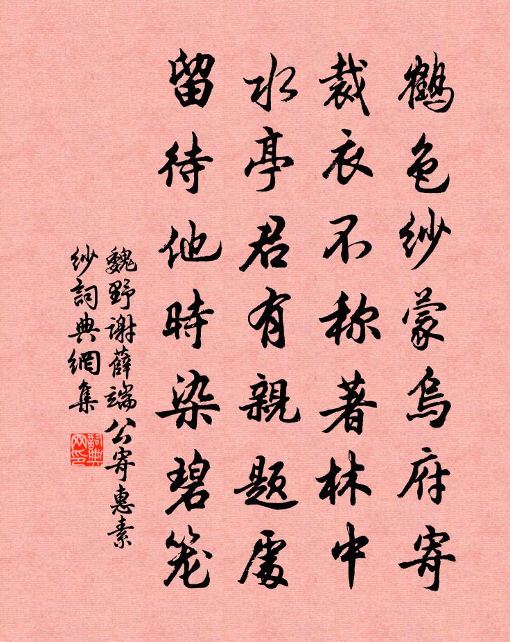 詩詞名句歷史字典書法欣賞書法字典國語詞典說文解字康熙字典古漢語字典標 題 作 者 詩 句 謝薛端公寄惠素紗作者:魏野 朝代:宋代謝薛端公寄惠素紗原文鶴色紗蒙烏府寄,裁衣不稱著林中。水亭君有親題處,留待他時染碧籠。詩詞問答問:謝薛端公寄惠素紗的作者是誰?答:魏野問:謝薛端公寄惠素紗寫於哪個朝代?答:宋代魏野謝薛端公寄惠素紗書法欣賞謝薛端公寄惠素紗書法作品詩詞推薦縱筆六言七首劉克莊〔宋代〕精衛銜石填海,醯雞以甕為天。拊石鳳翔千仞,□□龍沕九淵。句曾幾〔宋代〕一天倒影澄秋色,萬頃波浮浸月華。春集東園詩李淑〔宋代〕東城桃李春,結客玩珍花。試過辟疆園,兼屈中郎屣。筠苞煙蔽虧,柳帶風眠起。岸幘藉芳艿,銜杯嗅新蕊。留連贈鍾尊師游茅山李中〔唐代〕筇杖擔琴背俗塵,路尋茅嶺有誰群。仙翁物外應相遇,靈藥壺中必許分。香入肌膚花洞酒,冷侵魂夢石床雲。伊予送沈下賢謫尉南康張祜〔唐代〕秋風江上草,先是客心摧。萬里故人去,一行新雁來。山高雲緒斷,浦迥日波頹。莫怪南康遠,相思不可裁。和饒司理陳宓〔宋代〕往來曾識老名儒,今日方欣拜履初。小試不妨三語掾,平生何止五車書。詞源已作泉初注,德性仍知玉不如。自古和胡戢七首晁補之〔宋代〕時平未用入山深,歲晚何妨木秀林。聞說熊羆參後乘,可容牛下有哀吟。鷓鴣天(丙寅歲壽內子)郭應祥〔宋代〕賀了生辰卻賀冬。今年樂事又重重。壽香噴處芝蘭馥,壽灑斟時琥珀濃。偕桂隱,到花封。迎長介壽恰三逢。明年茅屋為秋風所破歌杜甫〔唐代〕八月秋高風怒號,卷我屋上三重茅。茅飛度江灑江郊,高者掛罥長林梢,下者飄轉沉塘坳。南村群童欺我老無力,賀聖朝 馬公振見訪,以詞留別,喜而和之謝應芳〔元代〕吳淞舊雨相鄰住。喜復來今雨。那時因遇。十年艱險,劍頭炊黍。如今相見,衰顏醉酒,似經霜紅樹。湖山佳處。京兆府試目極千里劉得仁〔唐代〕獻賦多年客,低眉恨不前。此心常郁矣,縱目忽超然。送驥登長路,看鴻入遠天。古墟煙冪冪,窮野草綿綿。樹與悼戴式之武衍〔宋代〕四海詩人說石屏,一時知己盡公卿。家傳衣缽生無愧,氣挾江湖老更清。重感慨時多比興,最瑰奇處是歌行。九原離蘇州回寄太守袁起岩郎中張鎡〔宋代〕吳中佳地舊長洲,來往空回信宿留。泰伯廟存那暇問,麗姓鄉近未曾游。詩翁燕坐迎香閣,閒客歸乘釣月舟。想見浣溪沙(前韻)蘇軾〔宋代〕料峭東風翠幕驚。云何不飲對公榮。水晶盤瑩玉鱗赬。花影莫孤三夜月,朱顏未稱五年兄。翰林子墨主人卿。偈頌一百四十一首釋師範〔宋代〕靈山山上葛藤樹,引蔓牽枝遍界生。慚愧波旬推倒後,東西有路與人行。元符親享明堂十一首佚名〔宋代〕合宮禮備,時維哲王。堂筵四敞,明德聲香。聖孝來格,降福穰穰。承承繼繼,萬祀其昌。題玉芝祠陳蒙〔宋代〕玉芝不見草蕭蕭,古柏陰廊晝寂寥。琳館廢來余福地,名碑留在記前朝。碧梧樹老鸞飛遠,華表天空鶴去遙。惟有和何元章新秋鄭剛中〔宋代〕玉露寒凝顆,銀河澹瀉流。每年才到此,無處不驚秋。便有清涼意,潛消旱涸憂。附炎蚊弄喙,可笑不知休。遺老齋絕句十二首蘇轍〔宋代〕避事已謝客,養性不看書。書中多感遇,掩卷輒長吁。漁歌子佚名〔宋代〕一任孤舟正又斜。乾坤何路指生涯。拋歲月,臥煙霞。在處江山便是名句推薦願天上人間,占得歡娛,年年今夜。柳永《二郎神·炎光謝》 羅襟濕未乾,又是淒涼雪。張淑芳《滿路花·冬》 何事東君,解將芳思,巧綴一斛春冰。朱晞顏《一萼紅·盆梅》 一樹梨花一溪月,不知今夜屬何人?佚名《雜詩·舊山雖在不關身》 猶余雪霜態,未肯十分紅。王十朋《紅梅》 十里青山遠,潮平路帶沙。數聲啼鳥怨年華。仲殊《南柯子·十里青山遠》 有花堪折直須折,莫待無花空折枝。無名氏《雜詩》 人之命在天,國之命在禮荀子《荀子·強國》 相逢意氣為君飲,系馬高樓垂柳邊。王維《少年行四首》 旋開旋落旋成空,白髮多情人更惜。司空圖《酒泉子·買得杏花》