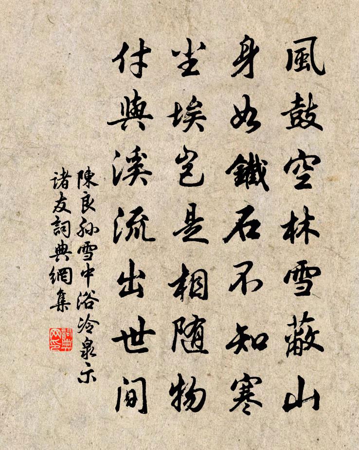 詩詞名句歷史字典書法欣賞書法字典國語詞典說文解字康熙字典古漢語字典標 題 作 者 詩 句 雪中浴冷泉示諸友作者:陳良孫 朝代:宋代雪中浴冷泉示諸友原文風鼓空林雪蔽山,身如鐵石不知寒。塵埃豈是相隨物,付與溪流出世間。詩詞問答問:雪中浴冷泉示諸友的作者是誰?答:陳良孫問:雪中浴冷泉示諸友寫於哪個朝代?答:宋代陳良孫雪中浴冷泉示諸友書法欣賞雪中浴冷泉示諸友書法作品詩詞推薦謁焦鍊師王昌齡〔唐代〕中峰青苔壁,一點雲生時。豈意石堂里,得逢焦鍊師。爐香淨琴案,松影閒瑤墀。拜受長年藥,翩翻西海期。觀禽鳥哺雛有感賦詩三首示諸子侄何夢桂〔宋代〕父母人心物豈無,靜觀禽鳥見中孚。自來擇木心勞瘁,到得成巢口卒瘏。囝翅漸長郎罷短,人間恩義尚如此,幾個宋王方平孫元晏〔唐代〕拂衣耕釣已多時,江上山前樂可知。著卻貂裘將採藥,任他人喚作漁師。九日留彭澤董嗣杲〔宋代〕牢擊扁舟在樹根,依然風物晉時村。幾年思采東籬菊,此際狂傾北海樽。野鶴離群翔碧落,江鴻排字入黃昏。有人宿廣惠寺黃庭堅〔宋代〕鴉啼殘照下層城,僧舍初寒夜氣清。風亂竹枝垂地影,霜乾桐葉落階聲。不遑將母傷今日,無以為家笑此生。都下壽傅守釋若芬〔宋代〕桃花彩綬儼仙衣,寶帶垂金腹十圍。五馬人生真可貴,更欣桑梓共分輝。春集東園詩李淑〔宋代〕東城桃李春,結客玩珍花。試過辟疆園,兼屈中郎屣。筠苞煙蔽虧,柳帶風眠起。岸幘藉芳艿,銜杯嗅新蕊。留連題城南書院三十四詠張栻〔宋代〕莫道閒中一事無,閒中事業有工夫。閉門清晝讀書罷,掃地焚香到日晡。禪人並化主寫真求贊釋正覺〔宋代〕眉目十分,精神一段。岩高釋遲,木老春來緩。古澗明月賓,青山白雲伴。借光何處不分身,剎剎塵塵誰解喚。河傳令 贈京兆席句押王哲〔元代〕衫敗易處。俗情正好,知白守黑。院脫離,好把明珠憐惜。年時,因緣,怎生積。心約已為規則。圭一粒,細思非好事近(中秋不見月,重陽不見菊)晁補之〔宋代〕風雨過中秋,愁對畫簾銀燭。那更氣遲節晚,負重陽金菊。月期花信尚參差。功名更難卜。何事四時俱好,□一杯太上虛皇黃庭經句法十篇壽趙師程珌〔宋代〕漢列土宇封同姓,唐擢宗英持國柄,我宋膺圖臨海鏡。參天杞梓仙源盛,蕭敷艾榮何足訂。得曾蛩秀才所附滁州歐陽永叔書答意梅堯臣〔宋代〕客從淮上來,往問故人信。袖銜藤紙書,題字遠已認。既喜開其封,固覺減吾吝。新詩不作寄,乃見子所慎。向來送李侍御入茅山採藥張南史〔唐代〕苦縣家風在,茅山道錄傳。聊聽驄馬使,卻就紫陽仙。江海生岐路,雲霞入洞天。莫令千歲鶴,飛到草堂前。楊少監寄西征近詩來,因賦二絕為謝。詩卷第范成大〔宋代〕錦囊隨上越王台,天海風濤亦壯哉。書到嶺頭梅恰動,一枝應伴一篇來。五泄山三學院十題西源釋鹹潤〔宋代〕造化鑿紳維,千岩斗空碧。有時雲雨開,殘陽落幽石。京師送王頤殿丞蘇轍〔宋代〕憶游長安城,皆飲母卿宅。身雖坐上賓,心是道路客。笑言安能久,車馬就奔迫。城南南山近,勝絕聞自昔。徘徊壽岳漕李曾伯〔宋代〕檀溪翠霧曉輪囷,共慶皇華誕玉辰。僂指明宵三五夜,從頭新歲八千春。且煩皎月清邊徼,行逐東風造禁宸。留取攤破浣溪沙/山花子賀鑄〔宋代〕錦韉未弦瑟瑟徽。玉纖新擬鳳雙飛。縹緲燭煙花暮暗,就更衣。約略整環釵影動,遲回顧步佩聲微。宛是春風胡蝶寄淮南制置使薛戶部魏野〔宋代〕西自荊巫徹海涯,南從吳越接京華。半天下管權何重,兩地間游路不賒。山澤利均資我國,江湖璋盡屬君家。帝心名句推薦放逐肯消亡國恨?歲時猶動楚人哀!查慎行《三閭祠》 落紅不是無情物,化作春泥更護花。龔自珍《己亥雜詩·其五》 千古興亡多少事?悠悠。不盡長江滾滾流。辛棄疾《南鄉子·登京口北固亭有懷》 春風不相識,何事入羅幃。李白《春思》 山荒聊可田,錢鎛還易辦。王守仁《謫居糧絕請學於農將田南山詠言寄懷》 凡與敵戰,若我勝彼負,不可驕惰,當日夜嚴備以待之。佚名《百戰奇略·第六卷·勝戰》 黃河水繞漢宮牆,河上秋風雁幾行。李夢陽《秋望》 黃華自與西風約,白髮先從遠客生。元好問《秋懷》 悄無人、桐陰轉午,晚涼新浴。蘇軾《賀新郎·夏景》 丈夫為志,窮當益堅,老當益壯。范曄《後漢書·列傳·馬援列傳》