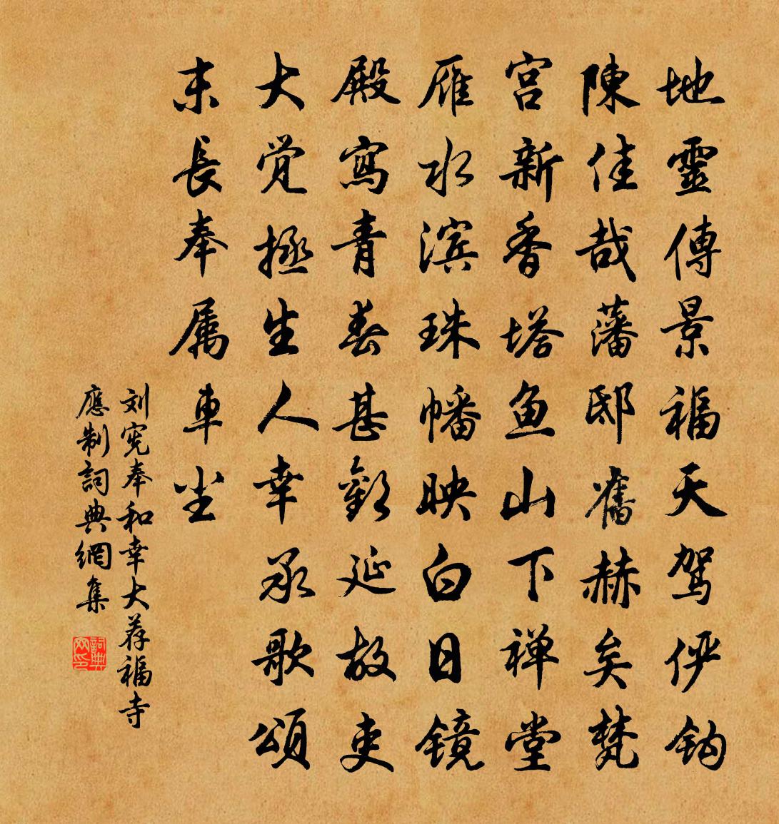 詩詞名句歷史字典書法欣賞書法字典國語詞典說文解字康熙字典古漢語字典標 題 作 者 詩 句 奉和幸大薦福寺應制作者:劉憲 朝代:唐代奉和幸大薦福寺應制原文地靈傳景福,天駕儼鉤陳。佳哉藩邸舊,赫矣梵宮新。香塔魚山下,禪堂雁水濱。珠幡映白日,鏡殿寫青春。甚歡延故吏,大覺拯生人。幸承歌頌末,長奉屬車塵。詩詞問答問:奉和幸大薦福寺應制的作者是誰?答:劉憲問:奉和幸大薦福寺應制寫於哪個朝代?答:唐代問:奉和幸大薦福寺應制是什麼體裁?答:五排劉憲奉和幸大薦福寺應制書法欣賞奉和幸大薦福寺應制書法作品注釋全唐詩:卷71_15詩詞推薦和曹守司直勸駕劉克莊〔宋代〕李唐故典存燒尾,皇宋科名從敕頭。月露濃熏仙桂發,天風高送客槎浮。三場魁匪先賢志,千佛名知幾劫修。自笑風入松王吉昌〔元代〕陰陽爻變坼乾坤。運一氣高奔。推移動靜分升降,攝浮沉、造化歸根。引養穀神不死,表塞兌,閉其門。七星羅列和趙行之三首王炎〔宋代〕轉喉有獨諱,拭面或逢嗔。刳心踏風波,未免悔吝生。葵猶衛其足,況此千金身。山林本逍遙,無虞莫從禽。次韻子瞻過淮見寄兼簡孫奕職方三首蘇轍〔宋代〕龜山昔同到,松竹故依然。紅印封鹹豉,黃罌分井泉。青天攜杖處,晚日落帆偏。無限相思意,新詩句句傳。浣溪沙(五之二)秦觀〔宋代〕香靨凝羞一笑開。柳腰如醉肯相挨。日長春困下樓台。照水有情聊整鬢,倚闌無緒更兜鞋。眼邊牽繫懶歸來。贈廣陵妓張又新〔唐代〕雲雨分飛二十年,當時求夢不曾眠。今來頭白重相見,還上襄王玳瑁筵。雜劇·感天動地竇娥冤關漢卿〔元代〕楔子(卜兒蔡婆上,詩云)花有重開日,人無再少年。不須長富貴,安樂是神仙。老身蔡婆婆是也。楚州人氏,嫡治圃韓維〔宋代〕久雨地氣泄,百草日以滋。勃然翳我圃,積茀不可治。遂信蕭艾質,唐突蘭蕙姿。鴻鵠不肯下,跳蛙恃而嘻。長林扁舟皆到門陸游〔宋代〕千錢買輕舟,不復從人借。樵蘇晨入市,鹽酪夕還舍。豈惟載春秧,亦足獲秋稼。有時醉村場,老稚相枕藉。常侵浣溪沙(趙景山席上用偶賦溪台和韻)辛棄疾〔宋代〕台倚崩崖玉滅瘢。青山卻作捧心顰。遠林煙火幾家村。引入滄浪魚得計,展成寥闊鶴能言。幾時高處見層軒。清平樂晏幾道〔宋代〕麼弦寫意,意密弦聲碎。書得鳳箋無限事,猶恨春心難寄。臥聽疏雨梧桐,雨餘淡月朦朧。一夜夢魂何處,那回楊挽白鹿洞賓呂善居王義山〔宋代〕元是雙峰門下士,席間參請到源頭。魯人知有樂正子,漢世曾稱馬少游。白鹿洞賓儒領袖,紫陽教主道源流。有兒答人乞碧蘆邵雍〔宋代〕草有可嘉者,莫將蕭艾儔。扶疏全類竹,蒼翠特宜秋。風雨聲初入,江湖思莫收。無功濟天下,藉此一淹留。石橋接待施樞〔宋代〕當年立雪直齊腰,宗旨流傳到石橋。風急窗寒燈影遠,疏梅無語夜薌銷。送程給事知越州張師顏〔宋代〕才臣新命輟卿聯,漕輓於今委重官。一道去蠲民疾苦,重江甯恤路艱難。行舟使節威聲遠,祖帳都門暑氣殘。奏課別荊州諸友呂殊〔宋代〕荊州三度別,此別猶酸冷。蒹葭逐岸靡,煙雨隔林迥。去棹行且留,離觴醉還醒。緬懷荊州士,秸立霜毛整。爽信送謝安國歸清江王炎〔宋代〕軒冕喜而憂,山林靜而閒。寵辱皆妄事,請看槐夢安。世人悟此少,低頭縛微官。足跌尚欲趨,翼倦不肯還。謝公臨安邸中即事且謝誠齋惠詩十二首袁說友〔宋代〕世事全無只恁閒,光陰閒里故相關。欲將睡去消磨日,睡得醒時日未闌。次韻鄭省倉方岳〔宋代〕買魚聊復醉{左酉右光}船,萬事從來付老天。欲辦把茅無計可,不量吾力更籌邊。希道使君入山再有佳句見及複次元韻因簡老禪張元乾〔宋代〕古澗寒泉可枕流,從渠庚伏在炎州。杖藜端欲事幽討,杯酒未容相勸酬。坐上縱無居士客,山間聊為老禪留。臨滄名句推薦獨倚闌乾凝望遠。一川菸草平如剪。謝逸《蝶戀花·豆蔻梢頭春色淺》 漠漠帆來重,冥冥鳥去遲。韋應物《賦得暮雨送李胄 / 賦得暮雨送李曹》 十年花骨東風淚,幾點螺香素壁塵。史達祖《鷓鴣天·搭柳欄乾倚佇頻》 國無三年之食者,國非其國也墨子《墨子·05章 七患》 初報邊烽照石頭,旋聞胡馬集瓜州。陸游《送七兄赴揚州帥幕》 枯楊枯楊爾生稊,我獨七十而孤棲。李白《雉朝飛》 夫妻反目,不能正室也。佚名《易傳·象傳上·小畜》 淡黃楊柳暗棲鴉。玉人和月摘梅花。賀鑄《減字浣溪沙·樓角初銷一縷霞》 禍之所由生也,生自纖纖也。荀子《荀子·大略》 鳳林關里水東流,白草黃榆六十秋。張籍《涼州詞三首·其三》