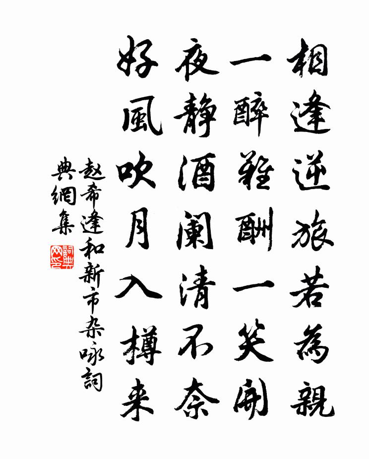 詩詞名句歷史字典書法欣賞書法字典國語詞典說文解字康熙字典古漢語字典標 題 作 者 詩 句 和新市雜詠作者:趙希逢 朝代:宋代和新市雜詠原文相逢逆旅若為親,一醉難酬一笑開。夜靜酒闌清不奈,好風吹月入樽來。詩詞問答問:和新市雜詠的作者是誰?答:趙希逢問:和新市雜詠寫於哪個朝代?答:宋代趙希逢和新市雜詠書法欣賞和新市雜詠書法作品詩詞推薦郫縣春日吟吳泳〔宋代〕素絲五緎詠羔羊,且是公餘燕日長。黃妳味甘逢孔聖,黑甜睡美謁羲皇。偈頌一百零二首釋紹曇〔宋代〕雪徑封寒蝶未知,暗香誰遣好風吹。野橋漏泄春光處,正是橫斜一兩枝。春懷故園柳宗元〔唐代〕九扈鳴已晚,楚鄉農事春。悠悠故池水,空待灌園人。雜劇·劉玄德醉走黃鶴樓佚名〔元代〕第一折(沖末諸葛亮領卒子上,雲)前次春花桃噴火,今日東籬菊綻金。誰似豫州存大志,求賢用盡歲寒心。貧道行春次俞兄韻吳龍翰〔宋代〕幾日春愁不出行,園林又是了清明。春風桃李一場夢,夜月江山千古情。吟倚長松伺鶴到,坐臨釣石看雲生。此懷老將一首劉克莊〔宋代〕昨解兵符歸故里,耳聽邊事幾番新。偶逢戲下來猶識,欲說遼陽記不真。兒覓寶刀偏愛惜,奴吹蘆管輒悲辛。夜寒七夕廖行之〔宋代〕目切雲垂望,心馳枕忘涼。兩年違色養,七夕又他鄉。坐想斑衣戱,胡為捧檄忙。何人翟方進,將母冠岩廊。舫齋鄧朴〔宋代〕悶悶之暑不可耐,走馬來尋靈跡怪。山深樹老龍屈蟠,洞闊雲寒鼠飛敗。嶄然角立九關鎖,勢鑠晴空生險隘。流泉送詹少游之平江王炎〔宋代〕溪上相逢把盞時,回頭今是一年余。聞君有喜驅都騎,顧我無聊守敝廬。信道此行騎鳳背,未知何日寄魚書。月明送睦州侯郎中赴闕方乾〔唐代〕昔著政聲聞國外,今留儒術化江東。青雲舊路歸仙掖,白鳳新詞入聖聰。弦管未知銀燭曉,旌旗已侍錦帆風。郡人今歲六月望後一日立秋故比常年涼意差早陸游〔宋代〕九衢車馬困炎曦,正是山中散發時。秋近梧桐已搖落,陰生蟋蟀最先知。稻陂水白寧憂旱?灶突煙青幸續炊。誰謂羅漢寺白玉蟾〔宋代〕林閒一徑似驚蛇,中有禪關閉紫霞。煙鎖蒼松遮寺額,風搖翠竹撼檐牙。客來寂寞盤香穗,飯後從容瀹 花。到此又雲新鑄鬴斛與今太府寺盡及權衡若合符契復司馬光〔宋代〕裁筩累黍久研精,況復新修鬴斛成。豈校忽微爭口語,本期淳古變人情。即言樂律符今尺,但恐簫韶似鄭聲。若欲詠美人在天津橋駱賓王〔唐代〕美女出東鄰,容與上天津。整衣香滿路,移步襪生塵。水下看妝影,眉頭畫月新。寄言曹子建,個是洛川神。晚至松門僧舍懷寄李太祝余靖〔宋代〕日暮倦行役,解鞍初息肩。霧昏臨水寺,風勁欲霜天。蓼浦初聞雁,人家半在船。思君正怊悵,黃葉正翩翩。崇仙觀吳鎰〔宋代〕人生塵土不可耐,天上高寒定自嘉。但約 * 擘麟脯,莫尋句漏問丹砂。春旱忽兩五絕劉克莊〔宋代〕鮭菜饁耕者,雞豚賽社公。不聞車軋軋,但見鼓冬冬。閏月二日始開北窗籬門張嵲〔宋代〕夏郊群樹綠冥冥,北戶今朝又脫扃。極目不知何所詣,三年於此看縈青。江城子(重午書懷)陳著〔宋代〕年年端午又今朝。鬢蕭蕭。思搖搖。應是南風,湘浦正波濤。千古獨醒魂在否,無處問,有誰招。何人簾幕倚蘭皋秋懷李流謙〔宋代〕悠悠感秋運,肅肅勵素節。蟾華度疎欞,蘭吹出叢薄。幽蟲泣煙莎,微螢映露葉。百哀攻予衷,感此重忉怛。庭闈名句推薦有情知望鄉,誰能鬒不變?謝朓《晚登三山還望京邑》 胡人吹笛戍樓間,樓上蕭條海月閒。高適《和王七玉門關聽吹笛 / 塞上聞笛》 閨中風暖,陌上草薰江淹《別賦》 呼童烹雞酌白酒,兒女嬉笑牽人衣。李白《南陵別兒童入京》 少年射虎名豪,等閒赤羽千夫膳元好問《水龍吟·從商帥國器獵於南陽同仲澤鼎玉賦此》 平皋行雁下,曲渚雙鳧出。崔元翰《奉和聖制重陽旦日百寮曲江宴示懷》 以小人尚民而威,以非所取於民而巧,是傷國之大災也。荀子《荀子·王霸》 記曉葉題霜,秋燈吟雨,曾系長橋過艇。吳文英《十二郎·垂虹橋》 城上春雲覆苑牆,江亭晚色靜年芳。杜甫《曲江對雨》 聚散匆匆,雲邊孤雁,水上浮萍。劉過《柳梢青·送盧梅坡》