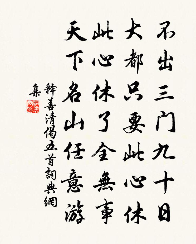 詩詞名句歷史字典書法欣賞書法字典國語詞典說文解字康熙字典古漢語字典標 題 作 者 詩 句 偈五首作者:釋善清 朝代:宋代偈五首原文不出三門九十日,大都只要此心休。此心休了全無事,天下名山任意游。詩詞問答問:偈五首的作者是誰?答:釋善清問:偈五首寫於哪個朝代?答:宋代釋善清偈五首書法欣賞偈五首書法作品詩詞推薦題畫十首唐寅〔明代〕雁影橫天報早霜,松聲沿路奏清商。舊時記得詩家說,落日下山人影長。僧廬陸游〔宋代〕僧廬土木塗金碧,四出徵求如羽檄。富商豪吏多厚積,宜其棄金如瓦礫。貧民妻子半菽食,一飢轉作溝中瘠,賦歛寄陝府內兄郭冏端公姚合〔唐代〕蹇鈍無大計,酷嗜進士名。為文性不高,三年住西京。相府執文柄,念其心專精。薄藝不退辱,特列為門生。事出頌古十首釋曇華〔宋代〕出得出不得,滿面是埃塵。愁人莫向愁人說,說向愁人愁 * 。十報恩 文登縣黃醮,贈道眾馬鈺〔元代〕崑崙三髻馬風歌。得遇修仙厭事多。我處無為酬本願,人求追薦苦相魔。加持助醮居環堵,救拔亡靈上大羅。滯魄臥病雜題陸游〔宋代〕{左口右父}咀初成藥,咿啞半掩扉。病知身健樂,閒覺宦遊非。小澗看猿飲,枯筇擁鶴歸。今朝更堪喜,書札得送傳提乾釋善珍〔宋代〕渡江諸老盡蘭蓀,當日琳琅照一門。龍去難尋神劍跡,鶴歸猶記舊巢痕。百年閥閱須關念,五里松楸易斷魂。京浙小殊山上官渙酉〔宋代〕雙岫西南聳,東山小更珠。形分閩嶺秀,名自隱翁呼。日映光濃淡,雲深色有無。須憑恕先手,畫作遠山圖。步步嬌佚名〔宋代〕貧子吃好酒。吃得酩酊休。萬事都不掛心頭。任毀任謗落一籌。痴聾暗啞漢,真修。寄趙昌甫陸游〔宋代〕杳杳雙鵲鳴庭除,東陽吏傳昌甫書。紙窮乃復得傑作,字字如刮造化爐。爾來此道苦寂寞,千里一士如鄰居。小兒句汪崇亮〔宋代〕夢回酒醒不知處,月靜人稀方憶君。後殿牡丹未開王安石〔宋代〕紅襆未開知婉娩,紫囊猶結想芳菲。此花似欲留人住,山鳥無端勸我歸。福聖觀姚祜〔宋代〕織女機成未剪裁,練光浮出五雲開。日邊瑩彩憑空落,澗底寒聲動地來。望徹九霄人錯愕,勢傾三井雪崩摧。臥龍竹圖王冕〔元代〕楚地秋風勁,湘江夜雨深。不看雙鳳舞,恰聽老龍吟。正直崇高節,歲寒同我心。悠悠向京國,轉轉憶山陰。九日在邇索居無聊取滿城風雨近重陽為韻賦七戴表元〔宋代〕雁雁西北來,亦復東南翔。動物各有時,吾當謹行藏。厚墐違嚴風,密袂御凜霜。陶然茅檐下,一笑生春陽。題張司業詩王安石〔宋代〕蘇州司業詩名老,樂府皆言妙入神。看似尋常最奇崛,成如容易卻艱辛。西行白居易〔唐代〕衣裘不單薄,車馬不羸弱。藹藹三月天,閒行亦不惡。壽安流水館,硤石青山郭。官道柳陰陰,行宮花漠漠。常聞六月十三日壽陳子徽太博十首以無官一身輕有戴表元〔宋代〕窮居無公憂,私此長夏日。蚊蠅如俗子,正爾相妒嫉。麾驅非吾任,遁避亦無術。惟當俟其定,靜坐萬慮一。漁家傲洪皓〔宋代〕□□□□□□□。□□□□□□□。□□□□□□□。□□□。□□□□□□□。正念當筵人已換。疏砧又E36雜詠王安石〔宋代〕百年禮樂逢休運,千里江山極勝游。那似鮑昭空寫恨,不為不粲只消憂。名句推薦桂魄飛來光射處,冷浸一天秋碧。蘇軾《念奴嬌·中秋》 竹喧歸浣女,蓮動下漁舟。王維《山居秋暝》 福滿須防有禍,凶多料必無爭。佚名《增廣賢文·下集》 吾任天下之智力,以道御之,無所不可。陳壽《三國志·魏書·武帝紀》 尚憶先朝多樂事,孝皇曾為兩宮開。王守仁《元夕二首》 戰陣之間,不厭詐偽。韓非及後人《韓非子·難一》 人心不足蛇吞象。馮夢龍《警世通言·卷二十五》 宮女如花滿春殿,只今惟有鷓鴣飛。李白《越中覽古》 來歲花前。又是今年憶去年。呂本中《減字木蘭花·去年今夜》 八年十二月,五日雪紛紛。白居易《村居苦寒》