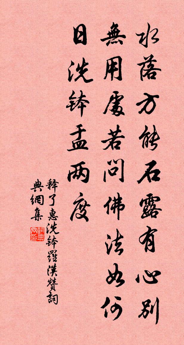 詩詞名句歷史字典書法欣賞書法字典國語詞典說文解字康熙字典古漢語字典標 題 作 者 詩 句 洗缽羅漢贊作者:釋了惠 朝代:宋代洗缽羅漢贊原文水落方能石露,有心別無用處。若問佛法如何,日洗缽盂兩度。詩詞問答問:洗缽羅漢贊的作者是誰?答:釋了惠問:洗缽羅漢贊寫於哪個朝代?答:宋代釋了惠洗缽羅漢贊書法欣賞洗缽羅漢贊書法作品詩詞推薦端午帖子詞二十首八夫人合五首歐陽修〔宋代〕楚俗傳筒黍,江人喜競舡。深宮亦行樂,彩索續長年。郊廟歌辭。享太廟樂章。嚴和佚名〔唐代〕肅肅清廟,赫赫玄猷。功高萬古,化奄十洲。中興丕業,上荷天休。祗奉先構,禮備懷柔。送若訥上人歸衢州蘇頌〔宋代〕應供何來此,囊書謁紫宸。清間頻賜對,止觀久談真。懇謝蘭袍寵,恩頒寶字新。重還鄉寺日,學侶益歸親。上巳瓊林苑宴二府同游池上即事口占晏殊〔宋代〕春留融冶日添長,萬品無涯入醉鄉。誰道人間泛仙境,水心樓殿半斜陽。淳祐祭海神十六首佚名〔宋代〕百川所歸,天地之左。澒洞鴻蒙,功高善下。行都攸依,百祿是荷。制幣嘉玉,以侑以妥。送宋寺丞通判邛州祖無擇〔宋代〕半刺侯藩重,臨邛驛路賒。將經灞陵樹,先看洛陽花。土物張騫竹,民封卓氏家。為君傷遠目,日日斷褒斜。題啄蜂雀井團雀二圖張榘〔宋代〕日暮投荒榛,吻利腹良餒。爾竟何所爭,固結不可解。通源驛別顏茂才蔡襄〔宋代〕躍馬東來不記時,酒醒寒色入征衣。垂楊官道連天去,落日郵亭別我歸。鄭北山之元孫扁其樓王適莊為書北山之英四字金履祥〔宋代〕嗟我思公,去之百歲。思莫見之,見其後裔。群玉五詠浮金峰李彌遜〔宋代〕浮金峰佳氣,不掛凡子目。高人有餘清,別墅廣新築。有懷鴻雁行,風月伴幽獨。還為稻粱謀,去傍蒹葭宿。歸飛春陰蔡珪〔金代〕城上春陰暗晚空,城頭山色有無中。似聞啼鳥來幽樹,已有遊絲曳好風。流水小橋歸未得,落霞孤鶩興無窮。林花正冬御殿上壽樂章八首其二皇帝舉第二爵酒登楊億〔宋代〕帝圖會昌,仁獸效祥。雙觡共觝,示武不傷。四靈為畜,玄枵耀芒。公族信厚,元元阜康。哭劉連江劉克莊〔宋代〕晚唐才調晉風期,一片胸襟頗涉奇。每過鄰家因貰酒,偶添別墅為贏棋。議郎秩淺無超拜,令尹官清有去思。種得相和歌辭輓歌二首於鵠〔唐代〕陰風吹黃蒿,輓歌渡秋水。車馬卻歸城,孤墳月明里。雙轍出郭門,綿綿東西道。送死多於生,幾人得終老。見人情詩其二十二倉央嘉措〔清代〕綠窗深情不忍離,去離徊徨意轉迷。久擬深山學修法,又延行程到後期。忍辱仙人丘處機〔元代〕一澤天恩齊慶賀。群生地著無飢餓。愁態眉間都蹴破。還真箇。盈街堆畝收田課。醞酒邀賓時唱和。排筵看食重堆途中趙嘏〔唐代〕故園回首雁初來,馬上千愁付一杯。惟有新詩似相識,暮山吟處共徘徊。晚步上清宮坐棲真者久之用合溪韻錢時〔宋代〕壞砌頹檐竹數竿,一方深綠照人寒。此時別有真訊息,不用清流引激湍。烏棲曲董嗣杲〔宋代〕綠陰涼透城頭樹,月明正照烏棲處。黃昏角起吹晴雲,烏欲啼愁愁夜分。夜分湖波幻絕境,境絕月漾玻瓈冷。棲烏嘲蚊四十韻范成大〔宋代〕暑魃方肆行,羽孽亦厲習。肖翹極么魔,坱圠累辟翕。濕生同糞蠍,腐化類宵熠。初來鬧郭郛,少進互原隰。嚶如名句推薦逐流牽荇葉,緣岸摘蘆苗。儲光羲《江南曲四首》 不信妾腸斷,歸來看取明鏡前。李白《長相思三首》 牆外行人,牆裡佳人笑。蘇軾《蝶戀花·春景》 奉君金卮之美酒,玳瑁玉匣之雕琴。鮑照《擬行路難·其一》 相顧無言,惟有淚千行。蘇軾《江城子·乙卯正月二十日夜記夢》 試問嶺南應不好,卻道:此心安處是吾鄉。蘇軾《少年游·南海歸贈王定國侍人寓娘》 翠華想像空山里,玉殿虛無野寺中。杜甫《詠懷古蹟五首·其四》 雲白山青萬餘里,愁看直北是長安杜甫《小寒食舟中作》 胸中有誓深于海,肯使神州竟陸沉?鄭思肖《二礪》 歲暮鋤犁傍空室,呼兒登山收橡實。張籍《野老歌 / 山農詞》