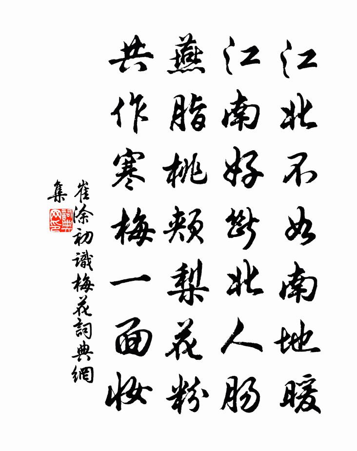 江北不如南地暖,江南好斷北人腸。燕脂桃頰梨花粉,共作寒梅一面妝。