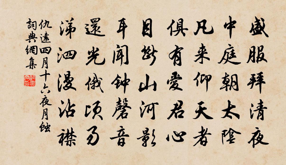 詩詞名句歷史字典書法欣賞書法字典國語詞典說文解字康熙字典古漢語字典標 題 作 者 詩 句 四月十六夜月蝕作者:仇遠 朝代:宋代四月十六夜月蝕原文盛服拜清夜,中庭朝太陰。凡來仰天者,俱有愛君心。目斷山河影,耳聞鐘磬音。還光俄頃易,涕泗漫沾襟。詩詞問答問:四月十六夜月蝕的作者是誰?答:仇遠問:四月十六夜月蝕寫於哪個朝代?答:宋代仇遠四月十六夜月蝕書法欣賞四月十六夜月蝕書法作品詩詞推薦秋夕寄懷契上人皇甫曾〔唐代〕已見槿花朝委露,獨悲孤鶴在人群。真僧出世心無事,靜夜名香手 * 。窗臨絕澗聞流水,客至孤峰掃白雲。更想頌古三十八首釋從瑾〔宋代〕須彌倒卓,海水逆流。同參相訪,作盡冤讎。休休,明日黃花蝶也愁。水調歌頭 舟次揚洲和人韻辛棄疾〔宋代〕落日書塞塵起,書胡騎獵清書秋。漢家書組練十萬,列艦聳高摟。誰道投鞭飛渡?憶昔鳴髇血污,風雨佛狸愁。季登育王望海亭樓鑰〔宋代〕瘦藤拄破山頭雲,山蹊盡處開危亭。平田萬頃際大海,海無所際空冥冥。乾端坤倪悉呈露,飛帆去鳥無遺形。蓬萊山頭對花晁說之〔宋代〕欲脫羇愁暫媾春,花先木末傲難親。無才與作山居賦,遮莫山花處處新。棠梨湖董嗣杲〔宋代〕西城轉地有湖光,矮矮荊榛出土岡。俎豆零星傳野哭,舳艫聯絡急邊防。夾壕楊柳猶秋色,貼屋桃花自晚妝。芳草春晚寄二林舒岳祥〔宋代〕穀雨秧芽動,楝風花信來。蟹奔沙上火,筍長地中雷。燕子巢重定,主人門早開。二林詩敵手,先著一篇催。青玉案(和)趙長卿〔宋代〕恍如遼鶴歸華表。閱盡人間巧。天乞一堂山對繞。微波不動,岸巾時照。照見星星好。舞風荷蓋從敧倒。碧樹生涼郊廟歌辭。祭太社樂章。舒和佚名〔唐代〕神道發生敷九稼,陰極乘仁暢八埏。緯武經文隆景化,登祥薦祉啟豐年。行春辭九首白玉蟾〔宋代〕一斗百篇誠有之,無人知我只春知。吟逢蝴蝶即莊子,醉見海棠真貴妃。和子楊雲峰留題胡寅〔宋代〕夙有水雲趣,倦遊塵土間。沖山為誰秀,几案我江山。贈劉仲圭占牌姚勉〔宋代〕天巧都存篆刻中,得君刀筆即榮通。鳳池誰信曾三人,關吏猶猜八十翁。和樂天秋涼閒臥劉禹錫〔唐代〕暑退人體輕,雨餘天色改。荷珠貫索斷,竹粉殘妝在。高僧掃室請,逸客登樓待。槐柳漸蕭疏,閒門少光彩。送照上人歸蜀釋法薰〔宋代〕我墮南來鬢已衰,汝今何得悔來遲。烏藤{左足右孛}跳還歸那,佛祖從教不展眉。搗衣詩蕭衍〔南北朝〕駕言易水北。送別河之陽。沉思慘行鑣。如夢在空床。既寤丹綠謬。始知紈素傷。中州木葉下。邊城應早霜。陰蟲無題二首龐謙孺〔宋代〕可惜花無主,分明枉過春。誰憐桃李艷,卻屬路行人。寄韓漕子云章甫〔宋代〕詔書淮上遂休兵,玉帛相隨下帝京。且喜王師還禁衛,獨煩使節在邊城。轉輸積雪河冰合,離別春風塞草生。細札逍遙吟邵雍〔宋代〕吾道本來平,人多不肯行。得心無後味,失腳有深坑。若未通天地,焉能為死生。向其間一事,須是自誠明。送陳子云通判葉適〔宋代〕三月召龍頻鼓鑼,喜作小雨恨不多。移苗未了君已去,更借後福書歸禾。寄徐稚山王洋〔宋代〕曾攬軺軒一整冠,江西吏膽至今寒。疲民仰德方為貴,野老言公不似官。身必靜休猶是病,心無揀擇始知安。高情名句推薦寒更承夜永,涼夕向秋澄。駱賓王《送別》 投宿駸駸征騎,飛雪滿孤村。孔夷《南浦·旅懷》 月兒彎彎照九州,幾家歡樂幾家愁。佚名《月兒彎彎照九州》 仁義禮善之於人也,辟之若貨財粟米之於家也。荀子《荀子·大略》 今夜鄜州月,閨中只獨看。杜甫《月夜》 好女之色,惡者之孽也;公正之士,眾人之痤也;修道之人,污邪之賊也。荀子《荀子·君道》 日出江花紅勝火,春來江水綠如藍。白居易《憶江南·江南好》 矮紙斜行閒作草,晴窗細乳戲分茶。陸游《臨安春雨初霽》 分明久旱逢甘雨,賽過他鄉遇故知。馮夢龍《醒世恆言·卷二十》 樓頭小婦鳴箏坐,遙見飛塵入建章。王昌齡《青樓曲二首》
