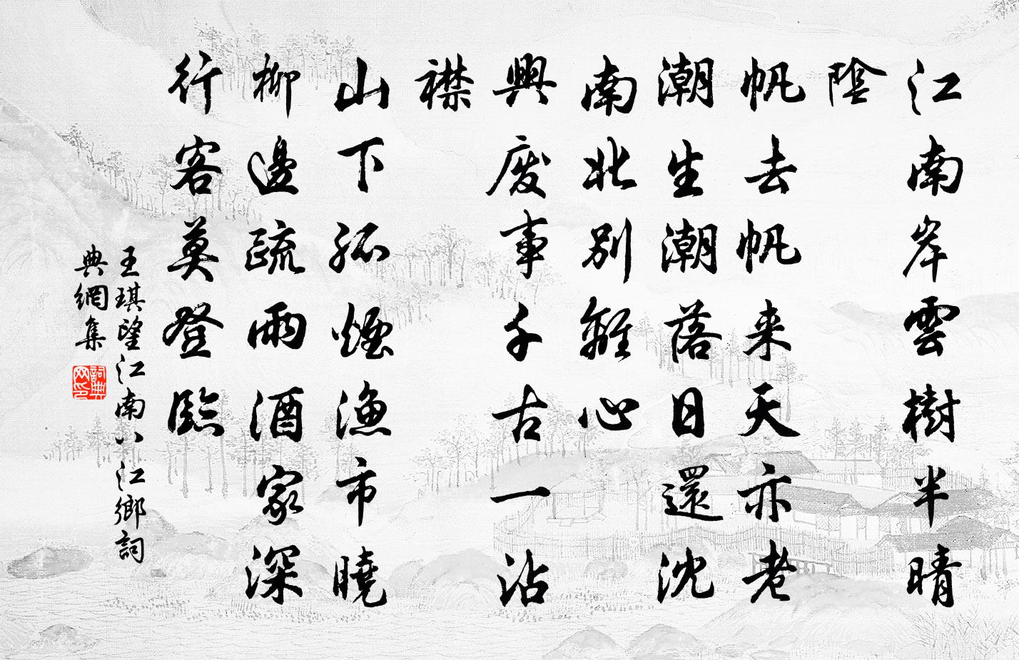 詩詞名句歷史字典書法欣賞書法字典國語詞典說文解字康熙字典古漢語字典標 題 作 者 詩 句 望江南(八·江鄉)作者:王琪 朝代:宋代望江南(八·江鄉)原文江南岸,雲樹半晴陰。帆去帆來天亦老,潮生潮落日還沈。南北別離心。興廢事,千古一沾襟。山下孤煙漁市曉,柳邊疏雨酒家深。行客莫登臨。詩詞問答問:望江南(八·江鄉)的作者是誰?答:王琪問:望江南(八·江鄉)寫於哪個朝代?答:宋代問:望江南(八·江鄉)是什麼體裁?答:詞王琪望江南(八·江鄉)書法欣賞望江南(八·江鄉)書法作品詩詞推薦蔡實甫能酒而道中無可口者見其吻噪成長篇戲王邁〔宋代〕吾祖方平至君家,絲麟談笑酌流霞。 * 約時在是坐,癢處思得姑爪爬。我今與君豈其裔,彈指又經千百歲。文采奉和襲美古杉三十韻陸龜蒙〔唐代〕眾木盡相遺,孤芳獨任奇。鍤天形硉兀,當殿勢頫危。恐是夸娥怒,教臨嶻嶭衰。節穿開耳目,根癭坐熊羆。世只梅花十首張耒〔宋代〕玉粟勻圓官樣黃,領巾借與十分香。沖寒不為生春物,自要晨霜為洗妝。岩起錄示次韻張乾佳什輒和寄之以道山居之況李彌遜〔宋代〕前山立玉水縈羅,逕竹當門一里過,管子與予成莫逆,麴生邀我到無何,老來鶴骨寒猶健,病起霜髭短更多。金印行香子吳潛〔宋代〕世事塵輕。寵辱何驚。□不須、更問君平。一帆客棹,幾曲漁汀。正年華晚,露華澹,月華明。休論煙閣,莫說雲題馬太尉華山莊劉滄〔唐代〕別開池館背山陰,近得幽奇物外心。竹色拂雲連岳寺,泉聲帶雨出谿林。一庭楊柳春光暖,三徑煙蘿晚翠深。自是夏日雜題陸游〔宋代〕午夢初回理舊琴,竹爐重炷海南沉。茅檐三日蕭蕭雨,又展芭蕉數尺陰。禪人並化主寫真求贊釋正覺〔宋代〕氣清水秋,骨寒木槁。青眼柳春深,白頭山雪早。具大人相也空落不驚,有大力量也風吹便倒。個些妙處難傳,向舍南雜興陸游〔宋代〕莎徑依山曲,柴扉並水開。不因行藥出,即為覓詩來。戒婢挑蔬甲,催兒斸芋魁。隨宜也能飽,漂母未須哀。攤破浣溪沙陳克〔宋代〕B54E慢梳頭淺畫眉。亂鶯殘夢起多時。不道小庭花露濕,翦酴醿。簾額好風低燕子,窗油晴日打蜂兒。翠袖粉定光梅開仆以病未能往觀亦緣此辭閭丘之約今毛滂〔宋代〕七里梅花自一村,縣樓目斷暮雲深。玉人為弄昆溪笛,塵榻空橫單父琴。知有春心傳庚嶺,可無雪興在山陰。金鞍吳民女陳潤道〔宋代〕吳民嗜錢如嗜飴,天屬之愛亦可移。養女日夜望成長,長成未必為民妻。百金求師教歌舞,便望將身贍門戶。一家大小水簾洞方信孺〔宋代〕碧澗東西春水添,四時疏雨落晴檐。珠宮貝闕無尋處,空見重重排玉簾。偈頌四十一首釋普寧〔宋代〕折腳鐺,破木杓。無柄霸,難摸索。橫拈倒用,破二作三。正按傍提,七穿八穴。偈頌一百二十三首釋祖欽〔宋代〕法逐心生,心隨法變。心法雙忘,千化萬變。扇子{左足右孛}跳上三十三天,{上祝下土}著帝釋鼻孔。盞子撲渡江雲(春感用清真韻)蕭允之〔宋代〕薔薇開欲謝,峭寒漸少,軒檻俯晴沙。先來愁未了,又聽一聲,新闋落漁家。徘徊佇立,似玉笛、三弄昭華。春晝換追風賀鑄〔宋代〕掌上香羅六寸弓。擁容胡旋一盤中。目成心許兩匆匆。別夜可憐長共月,當時曾約換追風。草生金埒畫堂空。和堯夫先生相招游夏圃司馬光〔宋代〕野迥秋光滿,逕微朝露寒。登高與行遠,餘力尚桓桓。送王端公充荊湖北路轉運夏竦〔宋代〕錦衣驄馬好還家,大別山邊漢水斜。霜簡位高增意氣,金章恩重有光華。幾程蠻徼雲藏驛,一棹荊江月照沙。多少八聲甘州鄭子玉〔宋代〕漸鶯聲近也,探年芳、河畔扼輕輪。旋東風染綠,綿綿平野,無際煙春。最苦夕陽天外,愁損倚闌人。無奈瀟湘杳名句推薦莫買沃洲山,時人已知處。劉長卿《送方外上人/送上人》 入苑白泱泱,宮人正靨黃。李賀《同沈駙馬賦得御溝水》 口惠而實不至,怨菑及其身。戴聖《禮記·表記》 城上春雲覆苑牆,江亭晚色靜年芳。杜甫《曲江對雨》 那作商人婦,愁水復愁風。李白《長干行二首》 白雲依靜渚,春草閉閒門。劉長卿《尋南溪常山道人隱居 / 尋南溪常道士》 啼號升斗抵千金,凍雀飢鴉共一音。范成大《雪中聞牆外鬻魚菜者求售之聲甚苦有感》 迢遞路回清野,人語漸無聞,空帶愁歸周邦彥《夜飛鵲·河橋送人處》 采菱人語隔秋煙,波靜如橫練。王惲《平湖樂·采菱人語隔秋煙》 羌管悠悠霜滿地,人不寐,將軍白髮征夫淚。范仲淹《漁家傲·秋思》
