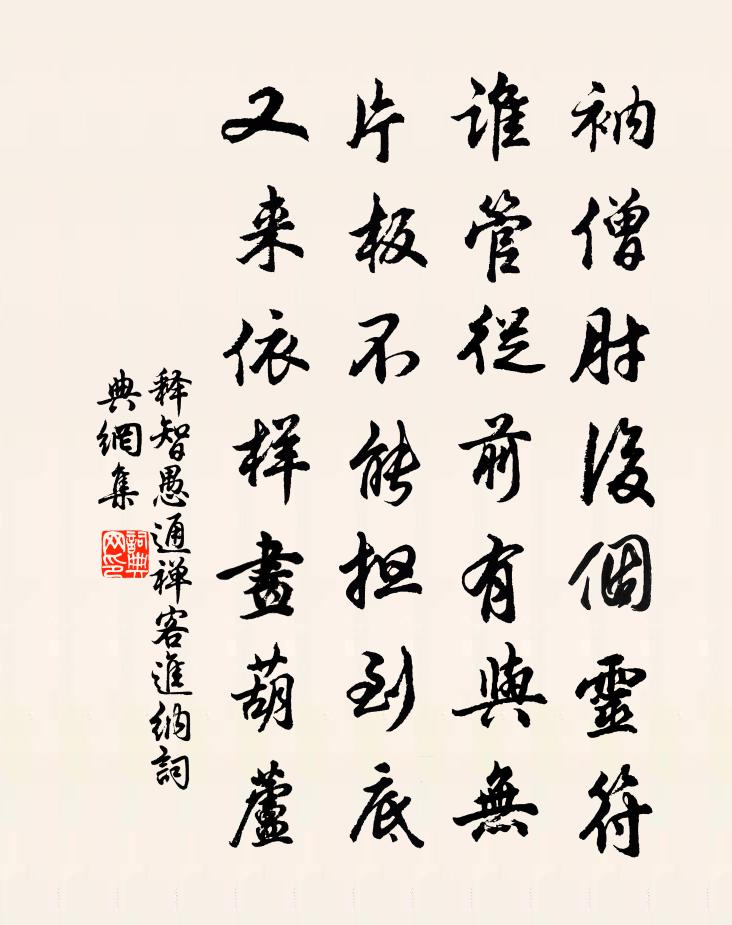 詩詞名句歷史字典書法欣賞書法字典國語詞典說文解字康熙字典古漢語字典標 題 作 者 詩 句 通禪客進納作者:釋智愚 朝代:宋代通禪客進納原文衲僧肘後個靈符,誰管從前有與無。片板不能擔到底,又來依樣畫葫蘆。詩詞問答問:通禪客進納的作者是誰?答:釋智愚問:通禪客進納寫於哪個朝代?答:宋代釋智愚通禪客進納書法欣賞通禪客進納書法作品詩詞推薦春野觀農事宋祁〔宋代〕茂氣回鮮野,寒姿換故林。敗防溪響急,新甽耒痕深。乳雉嬉原隩,歌牛下浦陰。吾廬堪學稼,將老有初心。解纜凌雲快晴程公許〔宋代〕淫雨三月賒,點篷今夕止。蕭晨企璇漢,微雲散霞綺。鴨綠澹不波,軟翠淨如洗。吾行及端月,余寒未雲已。何以過封邱見熊主簿洪皓〔宋代〕封邱封父國,繁弱大弓良。人器今安在,興衰古不常。畫旗連衛滑,繪句得高張。里乾黎元少,兵戈畎畝荒。蓬深論語絕句一百首張九成〔宋代〕謙抑從來不務爭,於人唯恐的真情。若於禮義愆違處,安得區區學面朋。感楓五首李賀〔唐代〕石根秋水明,石畔秋草瘦。侵衣野竹香,蟄蟄垂野厚。岑中月歸來,蟾光掛空秀。桂露對仙娥,星星下雲逗。淒涼題清芬閣二首陶遷〔宋代〕盧茨源上風煙好,結架遙憐雲水湄。曾是先生親卜築,不妨相國細吟詩。山開兩峽雲來暝,灘急一江帆到遲。作意帶湖春樹先和公手植也感而有賦馬廷鸞〔宋代〕老樹今逾七十霜,冰魂玉骨自孤芳。大家扶起摧殘後,此是吾家召伯棠。生查子(壽魏制乾·九月十九)李劉〔宋代〕萬里彩衣遠,旬日黃花後。蓬矢紀佳辰,蓮幕翻新奏。更看桂枝香,歸獻靈椿壽。同對小蟠桃,共醉長生酒。寄吳明輔秘丞戴復古〔宋代〕七十七翁猶眼明,三台星畔見奎星。文章有氣吞餘子,議論無差本六經。愧我不能攀逸駕,得君自足振頹齡。玉溪踏莎行劉一止〔宋代〕淡月精神,疏梅風韻。粉香融臉胭脂潤。袖痕猶帶玉虬煙,六朝窄樣裁宮錦。眉黛分愁,眼波傳信。酒闌畫燭交紅寄送於去非三首趙蕃〔宋代〕三載尉雖卑,諸公況己知。薦書常沓至,賓幕每牢辭。玉立風神峻,河傾議論馳。他年繼質肅,應有後人祠。又五首邵雍〔宋代〕前有億萬年,後有億萬世。中間有壽人,未過百來歲。出口無善言,行身無善珞。徒有人之身,殊無人之貴。司徒侍中宋宣獻公輓詞五首蔡襄〔宋代〕申命增華袞,遺忠勸紫宸。世風存令子,暮哭有慈親。復辟前言在,論兵密疏陳。如何年不永,無路問蒼旻。海陵書事晁說之〔宋代〕今古悠悠嘉上同,徒令客子恨無窮。竹椽泥壓清虛節,葦爨香殊忠厚風。騰倚百年麋鹿外,波瀾一日鳳凰中。可憐李國博遺浙姜建茗梅堯臣〔宋代〕吳姜漬吳糟,越茗苞越籜。咀辛聊案杯,啜味可奴酪。但拜故人貺,何言為物薄。我心易厭足,不比填溝壑。游荊門上泉寺劉光祖〔宋代〕碧玉潭深黃玉花,蓮經聽徹便為家。憑君為我頻膏雨,長使村村足稻麻。春懷有寄代同行作賀鑄〔宋代〕未應一笑為千金,且解樽前綠綺琴。歸雁不將書北去,行雲長伴日西沉。楚蘭徑遠飛黃蝶,湘水簾空對綠陰。無復沿衡陽而下觸矚目撫懷曾豐〔宋代〕湖深無敵岳無倫,流峙雲胡各駿奔。水守以兼常下下,山□□分固尊尊。蒼梧螻蟻慕虞舜,彭蠡膻鯨切屈原。吾與山園雜詠陸游〔宋代〕桃花爛熳杏花稀,春色撩人不忍違。俗客年來真掃跡,清樽日暮獨忘歸。魚行池面紅雲散,鵲起枝頭絳雪飛。莫道送存書記梁棟〔宋代〕一聲兩聲松子落,一片兩片楓葉飛。夕陽在山新月上,道人相伴一僧歸。名句推薦路出大梁城,關河開曉晴。謝榛《渡黃河》 九曲黃河萬里沙,浪淘風簸自天涯。劉禹錫《浪淘沙·九曲黃河萬里沙》 曲終漏盡嚴具陳,月沒星稀天下旦。佚名《雞鳴歌》 獨往獨來,獨出獨入,孰能礙之?列子及其弟子《列子·力命》 恭敬不如從命。曹雪芹《紅樓夢·第六十二回》 飄飄何所似,天地一沙鷗。杜甫《旅夜書懷》 四面邊聲連角起,千嶂里,長煙落日孤城閉。范仲淹《漁家傲·秋思》 水滿田疇稻葉齊,日光穿樹曉煙低。徐璣《新涼》 灞橋楊柳年年恨,鴛浦芙蓉葉葉愁。蘇庠《鷓鴣天·楓落河梁野水秋》 客子過壕追野馬,將軍韜箭射天狼。李夢陽《秋望》