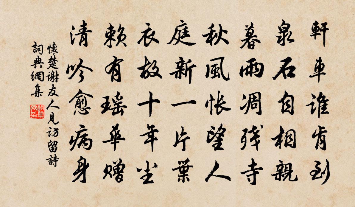詩詞名句歷史字典書法欣賞書法字典國語詞典說文解字康熙字典古漢語字典標 題 作 者 詩 句 謝友人見訪留詩作者:懷楚 朝代:唐代謝友人見訪留詩原文軒車誰肯到,泉石自相親。暮雨凋殘寺,秋風悵望人。庭新一片葉,衣故十年塵。賴有瑤華贈,清吟愈病身。詩詞問答問:謝友人見訪留詩的作者是誰?答:懷楚問:謝友人見訪留詩寫於哪個朝代?答:唐代問:謝友人見訪留詩是什麼體裁?答:五律懷楚謝友人見訪留詩書法欣賞謝友人見訪留詩書法作品注釋全唐詩:卷823-41詩詞推薦詠史上秦皇陳普〔宋代〕江神返璧事何新,海若湘君亦伐秦。一炬東來燒不了,更勞墓上牧羊人。薔薇架(清水驛)元稹〔唐代〕五色階前架,一張籠上被。殷紅稠疊花,半綠鮮明地。風蔓羅裙帶,露英蓮臉淚。多逢走馬郎,可惜簾邊思。新晴西園散步四首楊萬里〔宋代〕池水初生蓋玉沙,雨余碧草臥堤斜。日搖波影纏橋柱,繡出欒枝遍地花。送人釋文珦〔宋代〕澹澹煙波南浦春,臨流揮手易沾巾。啼鵑不解留歸客,岸柳偏能送去人。送王端公之太原歸覲相公戎昱〔唐代〕柱史今何適,西行詠陟岡。也知人惜別,終美雁成行。春雨桃花靜,離尊竹葉香。到時丞相閣,應喜棣華芳。引泉白居易〔唐代〕一為止足限,二為衰疾牽。邴罷不因事,陶歸非待年。歸來蒿洛下,閉戶何蕭然。靜掃林下地,閒疏池畔泉。伊流白蓮雨後漸衰釋居簡〔宋代〕曉池芳柄褭殘馨,褪雨欹風鷺委翎。碧展一奩秋練練,似憐玉色鏡中零。到郡一年曾鞏〔宋代〕薄材何幸擁朱軒,空食東州已一年。隴上雨余看麥秀,桑間日永問蠶眠。官名雖冗身無累,心事長閒地自偏。只恐杜北山同石峰僧來訪徐集孫〔宋代〕梅花同伴瘦,一瘦有誰過。歲事那堪晚,心期未易多。杯深和月吸,硯冷帶冰磨。山暝歸鴉急,相分獨奈何。送京仲次對制帥四川張鎡〔宋代〕賤子夫誰問,鳴騶屢水湄。自因閒肯顧,不是佞求知。山檻清持茗,花蹊笑說詩。雨風今送別,淒斷濕旌旗。同李洗馬入餘不溪經辛將軍故城皎然〔唐代〕慘慘寒城望,將軍下世時。高墉暮草遍,大樹野風悲。壁壘今惟在,勛庸近可思。蒼然古溪上,川逝共淒其。贈定軒游季升姚勉〔宋代〕海風吹潮濁如泥,咫尺不辨魚與龜。秋潭表里冰鏡淨,下瞰直可莖鬚眉。乃知有萬不齊物,心到定處皆能窺。君心太平寺水楊萬里〔宋代〕太平古寺劫灰余,夕陽惟照一塔孤。得得來看還不樂,竹莖荒處破殿虛。偶逢老僧聽僧話,道是壁間留古畫。徐生月下寄徐希仁盧仝〔唐代〕夜半沙上行,月瑩天心明。沙月浩無際,此中離思生。上天何寥廓,下地何崢嶸。吾道豈已矣,為君傾兕觥。賈鹿泉屢約一出小詩代行十首陳杰〔宋代〕世變崢嶸可奈何,魚龍雜襲故應多。風休雲定須臾事,惟有高賢炯不磨。百字令(壽虞守·正月十二)陳潛心〔宋代〕梅峰孕秀,太仙翁、咫尺元宵三夕。盛德溫溫如玉粹,多少殊勛嘉績。兩擁朱幡,獨清節,高誼真難屈。景疏堂下自上竺閒行至後磵題所見釋行海〔宋代〕莓苔一徑趁溪斜,行盡松陰見水涯。繞屋花開非舊主,隔林煙起是誰家。滿江紅(雨後攜家游西湖,荷花盛開)陳三聘〔宋代〕紺谷浮空,山擁髻、晚來風急。吹驟雨、藕花千柄,艷妝新浥。窺鑒粉光猶有淚,凌波羅襪何曾濕。訝漢宮、朝罷攤破訴衷情(和)蔡楠〔宋代〕欄乾十二繞層樓。珠簾卷素秋。當年尊酒屢遲留。識公惟白鷗。才得趣,又成愁。情鍾我輩流。買山同隱肯來不。題寺壁牟融〔唐代〕僧家勝景瞰平川,霧重嵐深馬不前。宛轉數聲花外鳥,往來幾葉渡頭船。青山遠隔紅塵路,碧殿深籠綠樹煙。聞道名句推薦對菱花、與說相思,看誰瘦損。陸叡《瑞鶴仙·梅》 歷覽千載書,時時見遺烈。陶淵明《癸卯歲十二月中作與從弟敬遠》 行到水窮處,坐看雲起時。王維《終南別業 / 初至山中 / 入山寄城中故人》 明犯強漢者,雖遠必誅。班固《漢書·傳·傅常鄭甘陳段傳》 青山依舊在,幾度夕陽紅。楊慎《臨江仙·滾滾長江東逝水》 不見南師久,謾說北群空。陳亮《水調歌頭·送章德茂大卿使虜》 黃雲萬里動風色,白波九道流雪山。李白《廬山謠寄盧侍御虛舟》 移舟水濺差差綠,倚檻風擺柄柄香鄭谷《蓮葉》 夜夜相思更漏殘,傷心明月憑闌乾,想君思我錦衾寒。韋莊《浣溪沙·夜夜相思更漏殘》 去日兒童皆長大,昔年親友半凋零。竇叔向《夏夜宿表兄話舊》