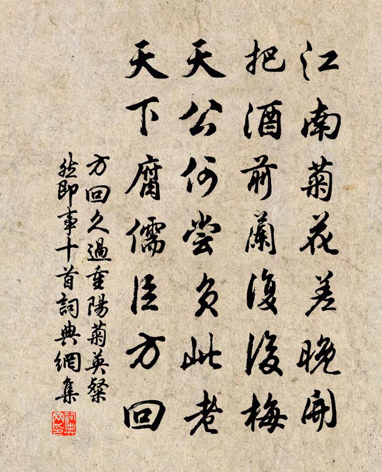 詩詞名句歷史字典書法欣賞書法字典國語詞典說文解字康熙字典古漢語字典標 題 作 者 詩 句 久過重陽菊英粲然即事十首作者:方回 朝代:宋代久過重陽菊英粲然即事十首原文江南菊花差晚開,把酒前蘭復後梅。天公何嘗負此老,天下腐儒臣方回。詩詞問答問:久過重陽菊英粲然即事十首的作者是誰?答:方回問:久過重陽菊英粲然即事十首寫於哪個朝代?答:宋代方回久過重陽菊英粲然即事十首書法欣賞久過重陽菊英粲然即事十首書法作品詩詞推薦贈陸伯政陸游〔宋代〕夜窗燈火老徒勤,自憫何時可策勛?未喪斯文天壽我,豈無餘子我思君。約通殘譜言猶在,細讀新詩筆欲焚。早晚夜投山家陸游〔宋代〕生草茨廬荊作扉,數家煙火自相依。大兒飼犢舍邊去,小兒捕魚溪口歸。通叟年兄視以柳侯廟詩三首輒亦有作所謂增來晁說之〔宋代〕何處乘駒去,空庭荔子垂。韓詞方走奠,柳廟久徂飢。既恨謀身誤,仍嗟報國隳。羅池便如此,不復問愚池。和答詩十首。和陽城驛白居易〔唐代〕商山陽城驛,中有嘆者誰。雲是元監察,江陵謫去時。忽見此驛名,良久涕欲垂。何故陽道州,名姓同於斯。憐君劍潭贈李似表劉子翬〔宋代〕夜窗把酒對鵝峰,分手悠悠各轉蓬。艤棹相逢煙浪際,有家皆在亂離中。胡兒久占清河地,壯士誰收赤壁功。它日望曉陳起〔宋代〕要知筋力衰多少,一覺才回常了了。鄰鍾無奈五更何,望斷窗紗不能曉。和襲美重題薔薇陸龜蒙〔唐代〕穠華自古不得久,況是倚春春已空。更被夜來風雨惡,滿階狼藉沒多紅。食雞頭子二首楊萬里〔宋代〕三危瑞露凍成珠,九轉丹砂鏈久如。鼻觀溫芳炊桂歇,齒根熟軟剝胎余。半甌鷹爪中秋近,一炷龍涎丈室虛。卻憶雜劇·破幽夢孤雁漢宮秋馬致遠〔元代〕楔子(沖末扮番王引部落上,詩云)氈帳秋風迷宿草,穹廬夜月聽悲笳。控弦百萬為君長,款塞稱藩屬漢家。某乃題翠樾亭宋祁〔宋代〕茂樹交軒地不塵,江光野氣望中新。客來魚鳥皆知樂,夢罷池塘並得春。煙竹有痕時拂戶,風花無意自飄人。當年送廣東憲陳均二首李昴英〔宋代〕我如越雪致狺狺,此事牽連亦到君。久矣浮名等蠻觸,付之公論定猶薰。四知誰不推楊震,三已何曾損子文。甚欲靜庵文同〔宋代〕問此初誰築,經營羨爾能。依深還巨木,就蔭覆高藤。坐與境同寂,來無人可憎。一床黃臥具,茂灌本如僧。晚步追涼二首楊萬里〔宋代〕風不須多只是涼,穿花度柳到人傍。細吹病耳颼颼響,徐弄輕衫拂拂長。和人雜詠六首衛宗武〔宋代〕幾年抱渴襟,既見名副實。擬為嵇阮交,愧匪秦晉匹。風翮翔空冥,遠避弋與畢。污世待澄清,其可事一室。春日皇帝閣羅公升〔宋代〕太液池邊數樹紅,年年先得占春風。那知萬物含仁義,都在君王一笑中。頌證道歌證道歌釋印肅〔宋代〕銷融頓入不思議,子細推詳我不是。無相光中古佛傳,盡被真空穿卻鼻。次韻和進真宗七言四韻丁謂〔宋代〕白麻初降紫宸中,簪組相驚帝澤豐。驟陟將壇知連偶,久塵台席愧材庸。桑榆便覺人間別,旌戟猶疑夢裡逢。已是慰嚴溪張君貢士何夢桂〔宋代〕朝日景曈曈,湛露溘已晞。日暮風淒淒,啼鳥失其雛。時邁感物化,撫事成傷悲。嚴溪子張子,有兒讀父書。年少與於中丞劉商〔唐代〕萬頃荒林不敢看,買山容足擬求安。田園失計全蕪沒,何處春風種蕙蘭。和譚學士見寄劉黻〔宋代〕大道久磔裂,啾啾誇毗子。彷佛皮毛鮮,孰探古人髓。我亦坐茲疾,默闃照非是。束身雲瘴鄉,凡論悉掩耳。夢不名句推薦火樹銀花合,星橋鐵鎖開。蘇味道《正月十五夜》 誰教歲歲紅蓮夜,兩處沉吟各自知。姜夔《鷓鴣天·元夕有所夢》 鵝湖山下稻粱肥,豚柵雞棲半掩扉。王駕《社日》 黯然銷魂者,唯別而已矣!江淹《別賦》 一蓑煙雨任平生。蘇軾《定風波·莫聽穿林打葉聲》 駐馬橋西,還系舊時芳樹。高觀國《玲瓏四犯·水外輕陰》 當壚秦女,十五語如弦。賀鑄《行路難·縛虎手》 醉別江樓橘柚香,江風引雨入舟涼。王昌齡《送魏二》 柳梢聽得黃鸝語,此是春來第一聲。楊載《到京師》 行人刁鬥風沙暗,公主琵琶幽怨多。李頎《古從軍行》