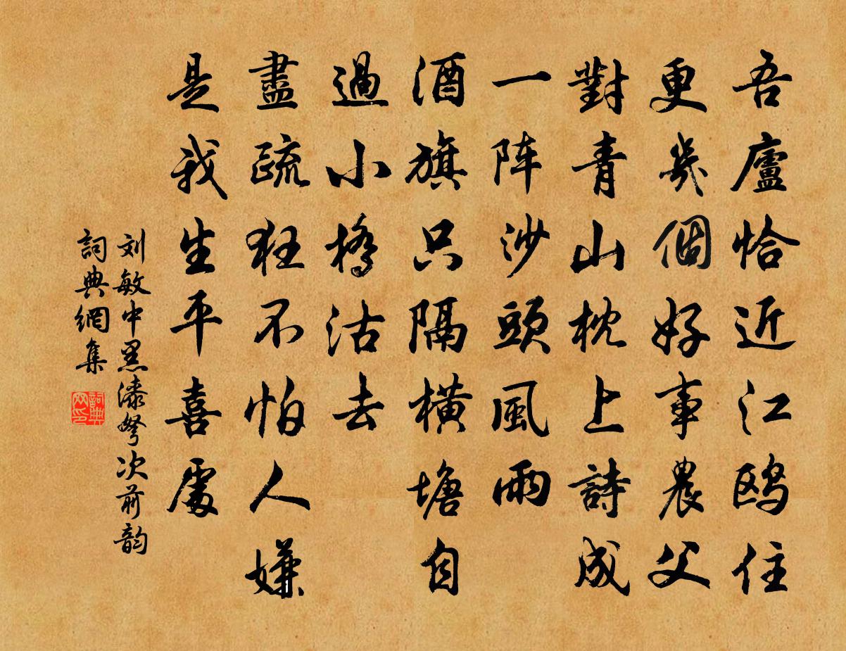 詩詞名句歷史字典書法欣賞書法字典國語詞典說文解字康熙字典古漢語字典標 題 作 者 詩 句 黑漆弩 次前韻作者:劉敏中 朝代:元代黑漆弩 次前韻原文吾廬恰近江鷗住。更幾個、好事農父。對青山、枕上詩成,一陣沙頭風雨。酒旗只隔橫塘,自過小橋沽去。盡疏狂、不怕人嫌,是我生平喜處詩詞問答問:黑漆弩 次前韻的作者是誰?答:劉敏中問:黑漆弩 次前韻寫於哪個朝代?答:元代問:黑漆弩 次前韻是什麼體裁?答:詞劉敏中黑漆弩 次前韻書法欣賞黑漆弩 次前韻書法作品詩詞推薦建隆郊祀八首竇儼〔宋代〕嘉玉制幣,以通神明。神不享物,享於克誠。句楊炎正〔宋代〕斷橋斜取路。朝晴陸游〔宋代〕宿雨初收雲四歸,小山草木麗朝暉。翩然雙鵲從檐下,言語分明訴濕衣。紹興間國工胡偉琵琶擅稱一時其徒豪興得胡心張鎡〔宋代〕半生繁會想梨園,醒耳秋風鳳語弦。我亦秦關歸未暇,故教休說汴河邊。撫州被推昭雪答陸太祝三首戴叔倫〔唐代〕求理由來許便宜,漢朝龔遂不為疵。如今謗起翻成累,唯有新人子細知。貧交相愛果無疑,共向人間聽直詞。從古慶元冬再到盱眙四首陳造〔宋代〕平日朝京此問途,如今一水剪坤輿。客來羨殺閒鷗鷺,北煮南飛得自如。謝夏彥博知縣惠落雁木並紫筍茶綠菜二首李石〔宋代〕入用定知材見伐,不鳴仍以雁遭烹。漆園二物都疑著,老去從軍得細評。水龍吟(壽白蘭谷)陳深〔宋代〕此翁疑是香山,老來愈覺才情富。天孫借與,金刀玉尺,裁雲縫霧。一曲陽春,樽前惟欠,柳蠻櫻素。對蒼松翠竹句崔日用〔唐代〕彼名流兮左氏癖,意玄遠兮冠今夕。(《贈武平一》)哭房處士段成式〔唐代〕獨上黃壇幾度盟,印開龍渥喜丹成。豈同叔夜終無分,空向人間著養生。和史志道侍郎游朝陽岩曾協〔宋代〕簿書堆案阻尋幽,想像高人物外游。自昔品題多北客,故知物象勝中州。雲經亂石餘膏潤,煙過懸崖自去留。暫俯訴衷情晏幾道〔宋代〕御紗新制石榴裙,沉香慢火熏。越羅雙帶宮樣,飛鷺碧波紋。隨錦字,疊香痕,寄文君。系來花下,解向尊前,誰賢者之孝二百四十首白華孝子林同〔宋代〕廉恥有微缺,須知孝未純。白華何所似,所似皎然身。登紫翠樓陸游〔宋代〕水落溪聲壯,天寒山色奇。殘雲宿虛閣,馴鷺下清池。簿領消豪氣,功名負聖時。憑高不勝嘆,神武迫歸期。和張先輩見寄二首徐鉉〔唐代〕去國離群擲歲華,病容憔悴愧丹沙。谷連舍下衣長潤,山帶城邊日易斜。幾處垂鉤依野岸,有時披褐到鄉家。故人上已陪諸公集西湖朱翌〔宋代〕今日我上已,樂哉天氣新。青春在西湖,湖水綠以勻。諸公乃肯游,盤飧仍集珍。少縱方外談,一洗城中塵。喚船和龔彥質韻送別趙稅院程公許〔宋代〕議征傍南海,何遽別同盟。漫仁不妨學,能詩新有聲。煙濤千里隔,書劍一航輕。榘范求諸近,菊坡冰雪清。真覺贊釋可湘〔宋代〕德山全其顛,岩頭插其尾。逼成一個老於菟,兩眼眈眈沒牙齒。少婦遊春詞施肩吾〔唐代〕簇錦攢花鬥勝游,萬人行處最風流。無端自向春園裡,笑摘青梅叫阿侯。蓼花董嗣杲〔宋代〕瘦葉浮根傍柳磯,水天秋色夕陽時。晶晶紅染累垂糝,裊裊涼搖軟弱枝。挼汗自能為酒母,託名誰製作風宜。花開名句推薦我醉君復樂,陶然共忘機。李白《下終南山過斛斯山人宿置酒》 金風細細。葉葉梧桐墜。晏殊《清平樂·金風細細》 自見之謂明。韓非及後人《韓非子·喻老》 人孰無親,罪人慎察其宗。來俊臣《羅織經·固榮卷第六》 孔雀東南飛,五里一徘徊。佚名《孔雀東南飛 / 古詩為焦仲卿妻作》 霜威出塞早,雲色渡河秋。李白《太原早秋》 一日不作,百日不食。司馬遷《史記·三十世家·趙世家》 年年陌上生秋草,日日樓中到夕陽。晏幾道《鷓鴣天·醉拍春衫惜舊香》 不要人夸好顏色,只留清氣滿乾坤。王冕《墨梅》 南園春半踏青時,風和聞馬嘶。歐陽修《阮郎歸·南園春半踏青時》