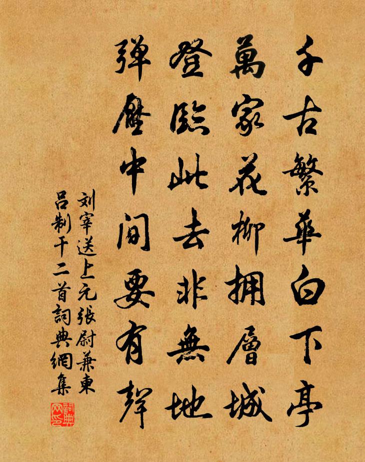 詩詞名句歷史字典書法欣賞書法字典國語詞典說文解字康熙字典古漢語字典標 題 作 者 詩 句 送上元張尉兼柬呂制乾二首作者:劉宰 朝代:宋代送上元張尉兼柬呂制乾二首原文千古繁華白下亭,萬家花柳擁層城。登臨此去非無地,彈壓中間要有聲。詩詞問答問:送上元張尉兼柬呂制乾二首的作者是誰?答:劉宰問:送上元張尉兼柬呂制乾二首寫於哪個朝代?答:宋代劉宰送上元張尉兼柬呂制乾二首書法欣賞送上元張尉兼柬呂制乾二首書法作品詩詞推薦次趙屯董嗣杲〔宋代〕船沿江北行,不見江邊樹。颯颯蘆葦空,棲雁泣如訴。波濤極衝撞,沙岸已頹仆。東傍趙屯來,結茅是誰住。檐破戲和淳詩卷樓鑰〔宋代〕暮年甘散誕,壯志久消磨。自媿今摩詰,誰憐老伏波。清新慙庾信,敏慧謝甘羅。惟有詩情在,猶能益辦多。絕句宋庠〔宋代〕波環潁曲持竿石,雲擁嵩岩鍊藥爐。儘是他年歸隱計,更憑猿鶴作前驅。贈張伯玉倅古睦俞汝尚〔宋代〕新定煙霞外,溪山清可依。夜風泉溜響,春雨藥苗肥。野鶴眠花圃,晴嵐溼案衣。預知公暇日,垂釣子陵磯。太常引許有壬〔元代〕小齋瀟灑頗宜貧。清有竹、靜無塵。俗子不敲門。只風月、煙霞是鄰。古瓶清雅,寒梅疏瘦,昨雨忽紛紛。尚有一覽鏡呈柏中丞杜甫〔唐代〕渭水流關內,終南在日邊。膽銷豺虎窟,淚入犬羊天。起晚堪從事,行遲更學仙。鏡中衰謝色,萬一故人憐。偈頌一百零九首釋可湘〔宋代〕溈仰兩爺兒,採茶機對機。只知呈體用,不覺露槍旗。正值風和日暖,何妨把手同歸,子規啼破已多時。鳳山禪寺徐夢發〔宋代〕百役紅塵吏,過門一解鞍。頻來無事乾,孤坐有山看。留月不掩戶,招風長倚欄。馬嘶催去路,吾道尚盤桓。如夢令劉景翔〔宋代〕獨立荷汀煙渚。一霎錦雲香雨。似為我無情,驚起鴛鴦飛去。飛去。飛去。卻在綠楊深處。邯鄲驛范成大〔宋代〕長安大道走邯鄲,倚瑟佳人悵望間。若見膻腥似今日,漢宮何用憶關山!記三月十日西湖之游呂留卿主人孟君複方萬里方回〔宋代〕丙申上巳七日後,一主二賓夫豈偶。遣車卻騎錢塘門,主人滿船富餚酒。別喚輕船載僕從,大船品字著三友。旁觀宿石壁山館郭忠謨〔宋代〕斜陽在山客在船,片帆點破澄江天。攜筇上踏籠頭月,釣篷穩擊蘆花雪。夜深野鶴穿雲歸,正是山房酒醒時。羽衣薌岩山居孟夏二十絕舒岳祥〔宋代〕茲峰虎蛇善,月下人去來。濯足瀑水源,山扉終夜開。送四子耜倅四明二首曹勛〔宋代〕高秋風月變新涼,老淚何堪不計雙。從此夢魂應逐汝,南雲夜夜過鄞江。次東坡先生蠟梅韻楊萬里〔宋代〕梅花已自不是花,永魂謪墮玊皇家。小不餐火更餐蠟,化作黃姑瞞造物。後山未覺坡先知,東坡勾引後山詩。金花栽橘李石〔宋代〕封君培雍百年心,準擬霜秋色更深。辦取數錢收一掬,此奴隨處即成林。菩薩蠻 賈君彥明為陽丘丞,三年職揚政舉,劉敏中〔元代〕挈家來吃山城水。三年不剩公田米。何物辦歸裝。一車風滿箱。吾人垂淚嘆。過客回頭看。誰不愛清官。清官似子舞曲歌辭。屈柘詞溫庭筠〔唐代〕楊柳縈橋綠,玫瑰拂地紅。繡衫金騕袤,花髻玉瓏璁。宿雨香潛潤,春流水暗通。畫樓初夢斷,晴日照湘風。浣溪沙王士禎〔清代〕北郭青溪一帶流,紅橋風物眼中秋,綠楊城郭是揚州。西望雷塘何處是?香魂零落使人愁,淡煙芳草舊迷樓。望江南張繼先〔宋代〕西源好,迎夏灑炎風。紅錦石邊憐一派,老張岩上戀群峰。時得化龍筇。琴振玉,曉色倚梧桐。黼黻文章朝內盛,名句推薦古宮閒地少,水港小橋多。杜荀鶴《送人游吳》 林下春晴風漸和,高崖殘雪已無多。王守仁《春晴》 輕寒細雨情何限。不道春難管。秦觀《虞美人·碧桃天上栽和露》 不期修古,不法常可。韓非及後人《韓非子·五蠹》 將者,上不制於天,下不制於地,中不制於人。尉繚《尉繚子·兵談》 君子之學也,入乎耳,著乎心荀子《荀子·勸學》 水是眼波橫,山是眉峰聚王觀《卜運算元·送鮑浩然之浙東》 移風易俗,莫善於樂。孔子及其弟子《孝經·廣要道》 紛紛墜葉飄香砌。夜寂靜,寒聲碎。范仲淹《御街行·秋日懷舊》 桂花香霧冷,梧葉西風影。高觀國《菩薩蠻·何須急管吹雲暝》
