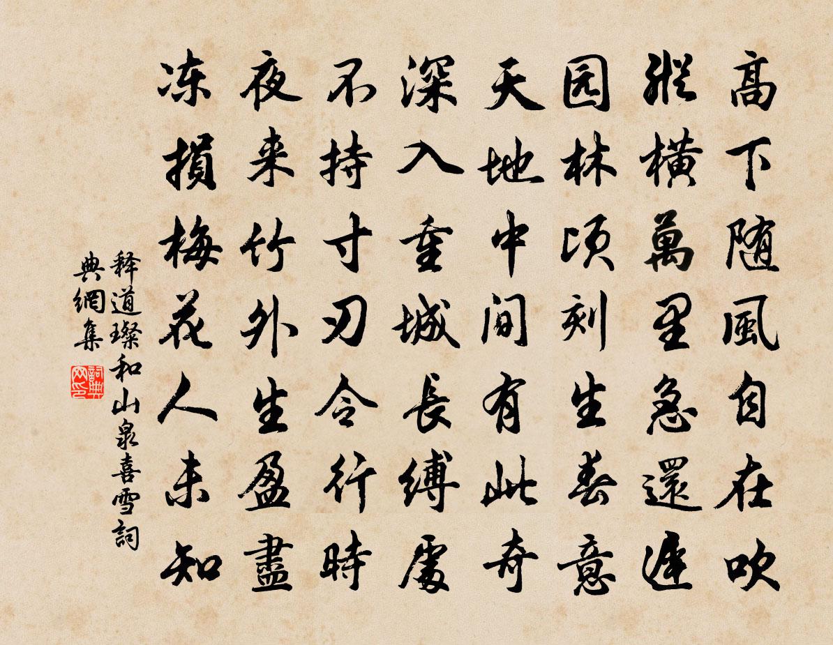 詩詞名句歷史字典書法欣賞書法字典國語詞典說文解字康熙字典古漢語字典標 題 作 者 詩 句 和山泉喜雪作者:釋道璨 朝代:宋代和山泉喜雪原文高下隨風自在吹,縱橫萬里急還遲。園林頃刻生春意,天地中間有此奇。深入重城長縛處,不持寸刃令行時。夜來竹外生盈盡,凍損梅花人未知。詩詞問答問:和山泉喜雪的作者是誰?答:釋道璨問:和山泉喜雪寫於哪個朝代?答:宋代釋道璨和山泉喜雪書法欣賞和山泉喜雪書法作品詩詞推薦蝦蟆鄭獬〔宋代〕積雨腐萬物,吾廬亦頹壓。蝦蟆何無厭,短腹猶呼渴。吾欲攜兩股,擲之滄海闊。懼其渴太甚,跳去食明月。菩薩蠻(鴛鴦梅)張鎡〔宋代〕前生曾是風流侶。返魂卻向南枝住。疏影臥晴溪。恰如沙暖時。綠窗嬌插鬢。依約猶交頸。微笑語還羞。願郎同白南陽道中許渾〔唐代〕月斜孤館傍村行,野店高低帶古城。籬上曉花齋後落,井邊秋葉社前生。飢烏索哺隨雛叫,乳牸慵歸望犢鳴。荒草夜分和鄭小山韻二首李曾伯〔宋代〕弓劍相隨幾歷年,鬢毛斑剝飽風煙。可憐蘆葉胡笳地,又過菊花新酒天。耳聽驊騮還紫邏,夢隨白鷺過青田。家僮示賀客二首錢時〔宋代〕得便宜是落便宜,幾萬人中有個知。此日冬窩無事客,埋頭更學十分痴。冬至後雪葛立方〔宋代〕客寐失通宵,寒聲動泬寥。雲容頹玉宇,雪陣攪層霄。點點楷灰落,亭亭柳絮飄。文窗斜擊紙,老樹巧裝條。墮領游長安諸寺聯句平康坊菩薩寺書事聯句段成式〔唐代〕悉為無事者,任被俗流憎。 ——鄭符客異乾時客,僧非出院僧。 ——段成式遠聞疏牖磬,曉辨密龕燈。 ——堰上行上周憲吳泳〔宋代〕堰上行,桃花灼灼春水生。水才一石泥數斗,瀰漫滮池浸渠口。樹以淇園竹,菑以漢堤石。石填竹落知幾丁,駕作紹興親享明堂二十六首佚名〔宋代〕禮協豐融,誠交彷佛。辟公受膰,宗祀臨痤。貽我來牟,以興嗣幾。山川出雲,天地同氣。射洪道中二首李流謙〔宋代〕遠墟行藹藹,滯緒豁欣欣。挾翠山能潤,矜晴草自薰。墮鳶那及吸,飛鷺可堪九。欲共江流說,滔滔故不聞。朱道人下世黃庭堅〔宋代〕桑戶居然同物化,青燈猶在讀書檠。身如陌上狂風過,心似夜來新月明。宿藍溪對月(一作宿藍橋題月)白居易〔唐代〕昨夜鳳池頭,今夜藍溪口。明月本無心,行人自回首。新秋松影下,半夜鐘聲後。清影不宜昏,聊將茶代酒。試中和節詔賜公卿尺詩李觀〔唐代〕淑節韶光媚,皇明寵賜崇。具寮頒玉尺,成器幸良工。豈止尋常用,將傳度量同。人何不取利,物亦賴其功。紫翰蝶葛天民〔宋代〕黛拂雙粉襯毫,翅烘晴日伴相遭。戲勾穉子從花遠,恐惹遊絲莫斬高。栩栩倏來仍易散,深深交舞為誰勞。吳王花西溪李商隱〔唐代〕近郭西溪好,誰堪共酒壺。苦吟防柳惲,多淚怯楊朱。野鶴隨君子,寒松揖大夫。天涯常病意,岑寂勝歡娛。送吳秘書歸杭州李頻〔唐代〕為客得從容,官清料復重。海崖歸有業,天目近何峰。是處通春棹,無村不夜舂。馬卿夸貴達,還說返臨邛。偈頌七十六首釋師範〔宋代〕雪峰輥球,睦州擔版。楊岐栗棘蓬,東山鐵酸餡。多處添,少處減,留得翠岩眉毛蓋眼。金陵驛文天祥〔宋代〕萬里金甌失壯圖,袞衣顛倒落泥塗。空流杜宇聲中血,半脫驪龍頷下須。老去秋風吹我惡,夢回寒月照人孤。千年王推官載酒來會於逍遙堂陳元晉〔宋代〕路入煙蘿杳靄中,良宵一笑美人同。壺觴盡攬平湖月,弦管時飄雖岸風。三宿未忘境地勝,一燈相對坐詩窮。姓名雜詩應璩〔魏晉〕貧子語窮兒。無錢可把撮。耕自不得粟。采彼北山葛。簞瓢恆日在。無用相呵喝。名句推薦林深藏卻雲門寺,回首若耶溪。張可久《人月圓·會稽懷古》 塵緣一點,回首西風又陳跡。吳文英《六么令·夷則宮七夕》 此身合是詩人未?細雨騎驢入劍門。陸游《劍門道中遇微雨》 昔嘆當年無李牧,今知江左有夷吾陳亮《送文子轉漕江東二首》 花枝出建章,鳳管發昭陽。皇甫冉《婕妤怨》 夢繞神州路。張元乾《賀新郎·送胡邦衡待制赴新州》 晨必盥,兼漱口。便溺回,輒淨手。李毓秀《弟子規·謹》 提出西方白帝驚,嗷嗷鬼母秋郊哭。李賀《春坊正字劍子歌》 當壚秦女,十五語如弦。賀鑄《行路難·縛虎手》 窮兵極武,仁者不為。令狐德棻《周書·列傳·卷二十七》