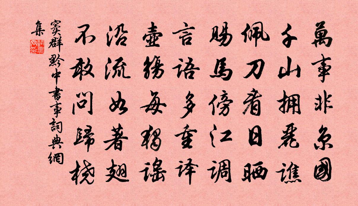 詩詞名句歷史字典書法欣賞書法字典國語詞典說文解字康熙字典古漢語字典標 題 作 者 詩 句 黔中書事作者:竇群 朝代:唐代黔中書事原文萬事非京國,千山擁麗譙。佩刀看日曬,賜馬傍江調。言語多重譯,壺觴每獨謠。沿流如著翅,不敢問歸橈。詩詞問答問:黔中書事的作者是誰?答:竇群問:黔中書事寫於哪個朝代?答:唐代竇群黔中書事書法欣賞黔中書事書法作品注釋全唐詩:卷271_61詩詞推薦人日出遊湖上十首楊萬里〔宋代〕上竺雪來時,四山都作凍。團團玉屏風,圍繞渾無縫。題大理崔少卿駙馬林亭姚合〔唐代〕每來歸意懶,都尉似山人。台榭棲雙鷺,松篁隔四鄰。迸泉清勝雨,深洞暖如春。更看題詩處,前軒粉壁新。詠史伏生張玉孃〔宋代〕楚炬秦坑六籍埃,芳心爭忍不同灰。若非斯道終難隨,雪發應消異世才。治圃雜書二十首方回〔宋代〕猿鶴閒朋友,知予近況無。春遊靴露指,夜讀燭燃須。醉苦鄰僧強,飢從小僕逋。山農來賣筍,與米富青蚨。卜運算元 齒落辛棄疾〔宋代〕剛者不堅牢,柔者難摧挫。不信張開口了看,舌在牙先墮。已闕兩邊廂,又豁中間個。說與兒曹莫笑翁,狗竇從君後天易吟三十首方回〔宋代〕萬古未來事,先天逆已知。卦中無不有,卻要後天推。初寒老身頗健戲書陸游〔宋代〕一身百病老難支,病減身輕偶此時。窗暖不妨聊假寐,囊空久已罷招醫。山爐巉絕香生岫,鏊研坡陀墨滿池。個裡和仲固春日村居即事十二絕胡寅〔宋代〕有興相尋即扣門,不須招致簡書繁。試從大雅歌鶯谷,未羨詞人侈兔園。解首座職事書記相招以偈力辭釋正覺〔宋代〕原鴒能作歸呼音,暮風墮葉秋在林。路沙漠漠水潏潏,夜色冉冉山陰陰。坐冠多士自省短,挽袂乃友相知深。乞與留題李侍御書齋杜牧〔唐代〕曾話平生志,書齋幾見留。道孤心易感,恩重力難酬。獨立千峰晚,頻來一葉秋。雞鳴應有處,不學淚空流。五貺詩五瀉舟皮日休〔唐代〕何事有青錢,因人買釣船。闊容兼餌坐,深許共蓑眠。短好隨朱鷺,輕堪倚白蓮。自知無用處,卻寄五湖仙。送元勛不伐侍親之官泉南八首李廌〔宋代〕泉南南蒲是南溟,瘴霧熏人不用醒。想對文書搔首罷,刺桐花下學蘭亭。熙寧以後享齋五首真宗〔宋代〕於穆仁廟,聖澤滂流。華夷用我,動植蒙休。徽名冠名,奕世垂謀。帝躬裸獻,盛典昭修。寓吳門十首陳造〔宋代〕向來勇策著書勛,一刻曾將白璧論。老去光陰都不惜,靜看烏兔役朝昏。邊上釋斯植〔宋代〕邊風斜日下長關,春到年年草自生。萬里戰場兵甲靜,近來應少北人行。酬劉書記朝奉二首釋子淳〔宋代〕生涯得力句,盡被維摩說。空劫一壺天,泥牛耕破月。追送友人李季允歸蜀三首並寄所懷周南〔宋代〕西州餘一老,六月上窮山。仲子何時到,三吳說鬢斑。土風添藥費,新地有生還。歸夢商於近,音書報是間。端獅子贊釋師範〔宋代〕要弄便弄,要置便置。眼晴倒轉,眉毛踢起。雖然好個金毛,爭奈爪牙未備。太師相公輓歌詞二首徐鉉〔唐代〕風流安石在東山,曾許從容妓樂間。傾蓋算來能幾日,逝川東去不知還。北邙原上寒雲結,鄭國門前曉月彎。祖奠三堂道中寄公卷吳則禮〔宋代〕久坐懶成癖,誰令老作魔。逢人說江海,著處是關河。隴底烽燧暗,海門鴻雁多。西樓雲水白,猶奈酒樽麽。名句推薦花似伊。柳似伊。花柳青春人別離。歐陽修《長相思·花似伊》 講性命之學者,不可無經濟之才。王永彬《圍爐夜話·第二六則》 更滿眼、殘紅吹盡,葉底黃鸝自語。韓元吉《薄倖·送安伯弟》 青出於藍而勝於藍程登吉《幼學瓊林·卷二·師生》 烏啼隱楊花,君醉留妾家。李白《楊叛兒》 墜粉飄香,日日喚愁生。盧祖皋《江城子·畫樓簾暮卷新晴》 大獵而後見善射,集議而後知能言宋濂、王褘《元史·列傳·卷五十》 枕前何事最傷情?梧桐葉上,點點露珠零。尹鶚《臨江仙·深秋寒夜銀河靜》 何時倚虛幌,雙照淚痕乾。杜甫《月夜》 賞賜不能喜,誅罰不能威。墨子《墨子·05章 七患》