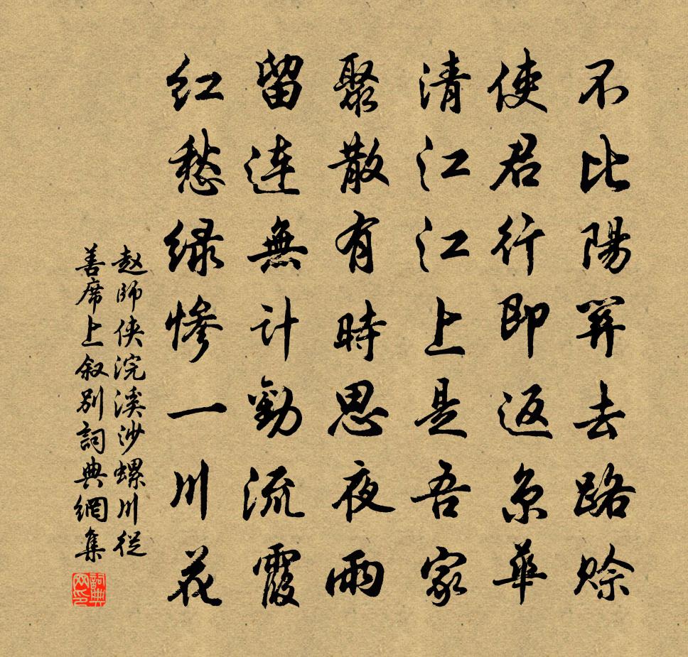 詩詞名句歷史字典書法欣賞書法字典國語詞典說文解字康熙字典古漢語字典標 題 作 者 詩 句 浣溪沙(螺川從善席上敘別)作者:趙師俠 朝代:宋代原文不比陽關去路賒。使君行即返京華。清江江上是吾家。聚散有時思夜雨,留連無計勸流霞。紅愁綠慘一川花。詩詞問答問:《浣溪沙(螺川從善席上敘別)》的作者是誰?答:趙師俠問:該詩寫於哪個朝代?答:宋代問:該詩是什麼體裁?答:詞書法欣賞浣溪沙(螺川從善席上敘別)書法作品詩詞推薦真靜饋新茶菰乾黃獨乳酪約葵窗適安共享適安陳起〔宋代〕千載狗靖節翁,狗秫向公田種。萬鍾於我何,肯戀五斗俸。長歌歸去來,田園聊自奉。高蹈世莫儔,器局小狗仲。別洪山預和尚釋正覺〔宋代〕般游念未穩,又別住山人。雁影水中字,雲心江上賓。同條如是住,千里亦成鄰。深翠一枝璽,腐紅五合陳。回途西江月(舟中作)廖行之〔宋代〕紺滑一篙春水,雲橫幾里江山。一番煙雨洗晴嵐。向曉碧天如鑒。客枕謾勞魂夢,心旌長系鄉關。封姨慳與送歸帆題金龜山如畫軒四首潘朝英〔宋代〕古木搖陰綠插空,梵宮寂寞草發忪。可憐昔日掀天事,曾對君王跨六龍。送張光歸吳郎士元〔唐代〕看取庭蕪白露新,勸君不用久風塵。秋來多見長安客,解愛鱸魚能幾人。同道損持國訪孔旼處士梅堯臣〔宋代〕高廬當大道,節士不肯過。窮巷獨秉德,車馬一何多。勢力走諛諂,禮義服委佗。是以被褐人,長甘北山阿。曰今竹王珪〔唐代〕天地得正氣,四時無易心。生來本孤節,高處獨千尋。月影龍蛇動,風枝蕭籟吟。如何楓與柳,亦擬傍清陰。智仲可化盜圖李洪〔宋代〕有德由來必有鄰,得齊潛德感人深。不勞渠聽甘棠訟,解使偷兒自革心。壽定叟弟張栻〔宋代〕向來相望各天涯,兩載團欒似舊旦。只恐桐江來趣駕,明年把酒又相思。哀郢陸游〔宋代〕遠接商周祚最長,北盟齊晉勢爭強。章華歌舞終蕭瑟,雲夢風煙舊莽蒼。草合故宮惟雁起,盜穿荒冢有狐藏。離騷芍藥吟金朋說〔宋代〕畫闌倚玉對佃紅,娜裊翻階放艷農。自笑主人無個事,年年攜酒祝東風。請代陳杰〔宋代〕郡小凋殘最,兵余旱疫仍。不能無獄訟,但見可哀矜。卿自別利器,吾猶冶亂繩。新林有孳尾,珍重莫呼鷹。旅次感懷董嗣杲〔宋代〕亂眼悲人事,追程老客顏。鼉鳴風鼓浪,雁斷日銜出。此際塵勞混,吾生賦予慳。吟聯朝晚積,負得賀囊還。寓居二首其二東樓蘇轍〔宋代〕月從海上涌金盆,直入東樓照病身。久已無心問南北,時能閉目待儀麟。颶風不作三農喜,舶客初來百物新。歸去還家二絕趙蕃〔宋代〕竹因易葉聽風吹,入屋穿窗縱所之。我亦閉齋愆掃溉,渠因投隙遂紛披。君子吟邵雍〔宋代〕君子與義,小人與利。與義日興,與利日廢。君子尚德,小人尚力。尚德樹恩,尚力樹敵。君子作福,小人作威。送周開祖出守鄱陽賀鑄〔宋代〕三尺京塵袞袞中,略無閒地貯清風。鱸魚菰菜經年別,皂蓋朱轓一日東。俗眼強分青白在,芳樽未覺聖賢空。鄱陽小山喻良能〔宋代〕峰秀因拳石,溪清見發魚。毫釐辨喬梓,咫尺有匡廬。挽朱丞一首劉克莊〔宋代〕伯厚漢人推雅操,慶餘唐世擅詩盟。辭家東走先□□,奉對南廊晚策名。昨日庭移二松種,幾時墳有一芝生。遙知歌曹丕〔魏晉〕長安城西雙員闕。上有一雙銅雀。一鳴五穀生。再鳴五穀熟。名句推薦孰知不向邊庭苦,縱死猶聞俠骨香。王維《少年行四首》 風住塵香花已盡,日晚倦梳頭。李清照《武陵春·春晚》 參軍春思亂如雲,白髮題詩愁送春歐陽修《春日西湖寄謝法曹歌》 萬里浮雲卷碧山,青天中道流孤月。李白《答王十二寒夜獨酌有懷》 燈前目力雖非昔,猶課蠅頭二萬言。陸游《讀書》 惜別傷離方寸亂。忘了臨行,酒盞深和淺。李清照《蝶戀花·淚濕羅衣脂粉滿》 鳥向平蕪遠近,人隨流水東西。劉長卿《謫仙怨·晴川落日初低》 中原事業如江左,芳草何須怨六朝。納蘭性德《秣陵懷古·山色江聲共寂寥》 問弄雪飄枝,無雙亭上,何日重遊。鄭覺齊《揚州慢·瓊花》 為君持酒勸斜陽,且向花間留晚照。宋祁《玉樓春·春景》