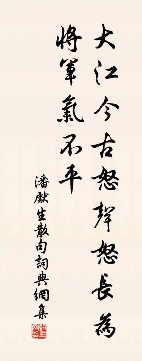 詩詞名句歷史字典書法欣賞書法字典國語詞典說文解字康熙字典古漢語字典標 題 作 者 詩 句 句作者:潘先生 朝代:宋代句原文大江今古怒聲怒,長為將軍氣不平。詩詞問答問:句的作者是誰?答:潘先生問:句寫於哪個朝代?答:宋代潘先生句書法欣賞句書法作品詩詞推薦和劉郎中傷鄂姬白居易〔唐代〕不獨君嗟我亦嗟,西風北雪殺南花。不知月夜魂歸處,鸚鵡洲頭第幾家?[姬,鄂人也。]喜雨陳與義〔宋代〕秦望山頭雲,昨日鸞鳳舉。冥冥萬里風,淅淅三更雨。小臣知君憂,起坐聽檐語。風力有去來,龍工雜文武。燈花渡淮河寄平一祖詠〔唐代〕天色混波濤,岸陰匝村墅。微微漢祖廟,隱隱江陵渚。雲樹森已重,時明郁相拒。柳梢青(黃梅)黃人傑〔宋代〕恰則年時。風前雪底,初見南枝。可?匆匆,花才清瘦,子已紅肥。安排酒盞相隨。看金彈、累累四垂。渴後情懷寄尋萍公齊己〔唐代〕聞在湓城多寄住,隨時談笑渾塵埃。孤峰恐憶便歸去,浮世要看還下來。萬頃野煙春雨斷,九條寒浪晚窗開。虎溪夕日操王令〔宋代〕繹繹道周,伊誰之園。夙不築自垣,今安以樊。人各有心,亦不思旃。送鈐轄館使王公解程〔宋代〕武帳推恩詔十行,雍容鳴玉覲清光。四年愛日民謠浹,五月炎風驛路長。劍閣煙雲迷去斾,柳營笳鼓慘離觴。浣花和劉誼翁留題惠安二首舒坦〔宋代〕塢雲過雨翠成堆,天淡平湖一鑒開。萬木號風韻絲竹,千峰帶月上池台。靜無俗駕金鋪地,閒有高人玉滿杯。聞道暮春寄元九白居易〔唐代〕梨花結成實,燕卵化為雛。時物又若此,道情復何如。但覺日月促,不嗟年歲徂。浮生都是夢,老小亦何殊。唯與送鄭嚴州四首陳鑒之〔宋代〕父老迎使君,舟楫桐江波。那知使君心,一片煙雨蓑。杖藜對客星,清風雙嵯峨。沙鷗公故人,應為小婆娑。挽章陳造〔宋代〕隱操人將處士看,寧知器業自槃槃。襄陽耆舊今餘幾,儒館先生定莫攀。元亮歸來猶責子,德公老去竟無官。子孫至鄂期年以饟事不給於詩己亥夏五廿有八日始岳珂〔宋代〕昌黎久原列三王,我亦曾親翰墨香。惜別依依重回首,棠磯風月更思量。醉後王績〔唐代〕阮籍醒時少,陶潛醉日多。百年何足度,乘興且長歌。食新稻羅公升〔宋代〕野人何所贈,金粟眩雙目。吾廬幸徒壁,恐受賈禍速。熟視心始平,中有稻一斛。開囊帶風露,入釜間黃綠。雲碓勉吟者宋伯仁〔宋代〕詩不窮人窮乃工,蹇驢宜立灞橋風。安排兩個推敲字,豈在梨花院落中。社日南康道中楊萬里〔宋代〕東風試暖卻成寒,春恰平分又欲殘。淡著煙雲輕著雨,近遮草樹遠遮山。人行柳色花光里,天接江西嶺北間。管領舜廟郭鳳〔宋代〕雲封舜冢杳難尋,徒取箾韶索九陰。學講執中恁古籍,道傳精一抱遺心。五臣山拱如班瑞,二女峰和似鼓琴。英爽又次韻四首張嵲〔宋代〕篇章雖漫往,悃愊詎能通。待子應無恙,臨池定有功。綺疏群木杪,倒影亂流中。何日陪康樂,登臨興未窮。衡永道中二首劉克莊〔宋代〕過了衡陽雁北回,鄉書迢遞托誰哉。岳山石鼓皆辭去,惟有湘江作伴來。寄題吳斗南玩芳亭陸游〔宋代〕北斗以南有吳侯,人物知非第二流。讀書不放一字過,閉戶忽驚雙鬢秋。平生離騷讀千遍,屈沱秭歸要親見。歸來名句推薦亦余心之所善兮,雖九死其猶未悔。屈原《離騷》 善操理者不能有全功,善處身者不能無過失。薛居正《舊五代史·後周·世宗紀二》 受人之託,忠人之事馮夢龍《警世通言·卷三十四》 水波而上,盡其搖而復下,其勢固然者也。管仲《管子·君臣下》 天外鳳凰誰得髓?無人解合續弦膠。杜牧《讀韓杜集》 鵬北海,鳳朝陽。辛棄疾《鷓鴣天·送廓之秋試》 長安一片月,萬戶搗衣聲。李白《子夜吳歌·秋歌》 山外青山樓外樓,西湖歌舞幾時休?林升《題臨安邸》 古路無行客,寒山獨見君。劉長卿《碧澗別墅喜皇甫侍御相訪》 已訝衾枕冷,復見窗戶明。白居易《夜雪》